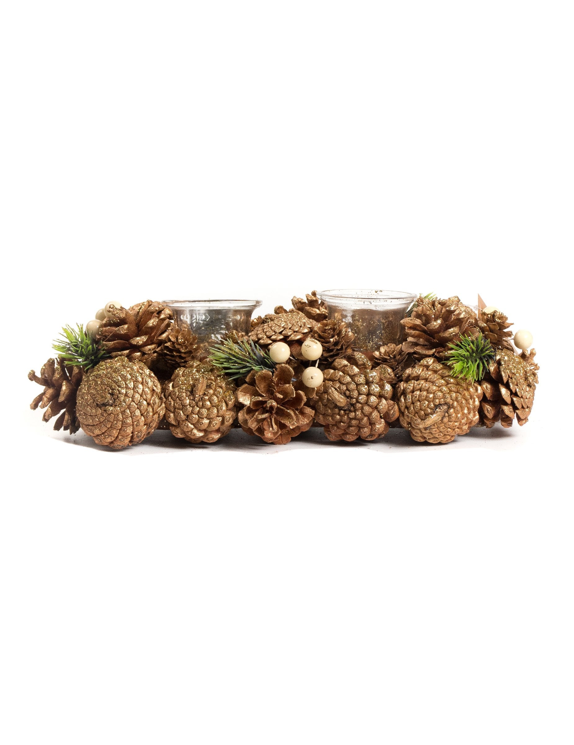 S tem dodajte svojemu dekorju kanček sijaja osrednji del od 30 cm. Ta komplet, sestavljen iz dveh steklenih svečnikov, je okrašen z pozlačenimi storži, mavričnimi jagodami in umetnimi jelkovimi vejami. Je popoln način za osvetlitev vaših obrokov med Božična praznovanja in ustvariti toplo vzdušje.