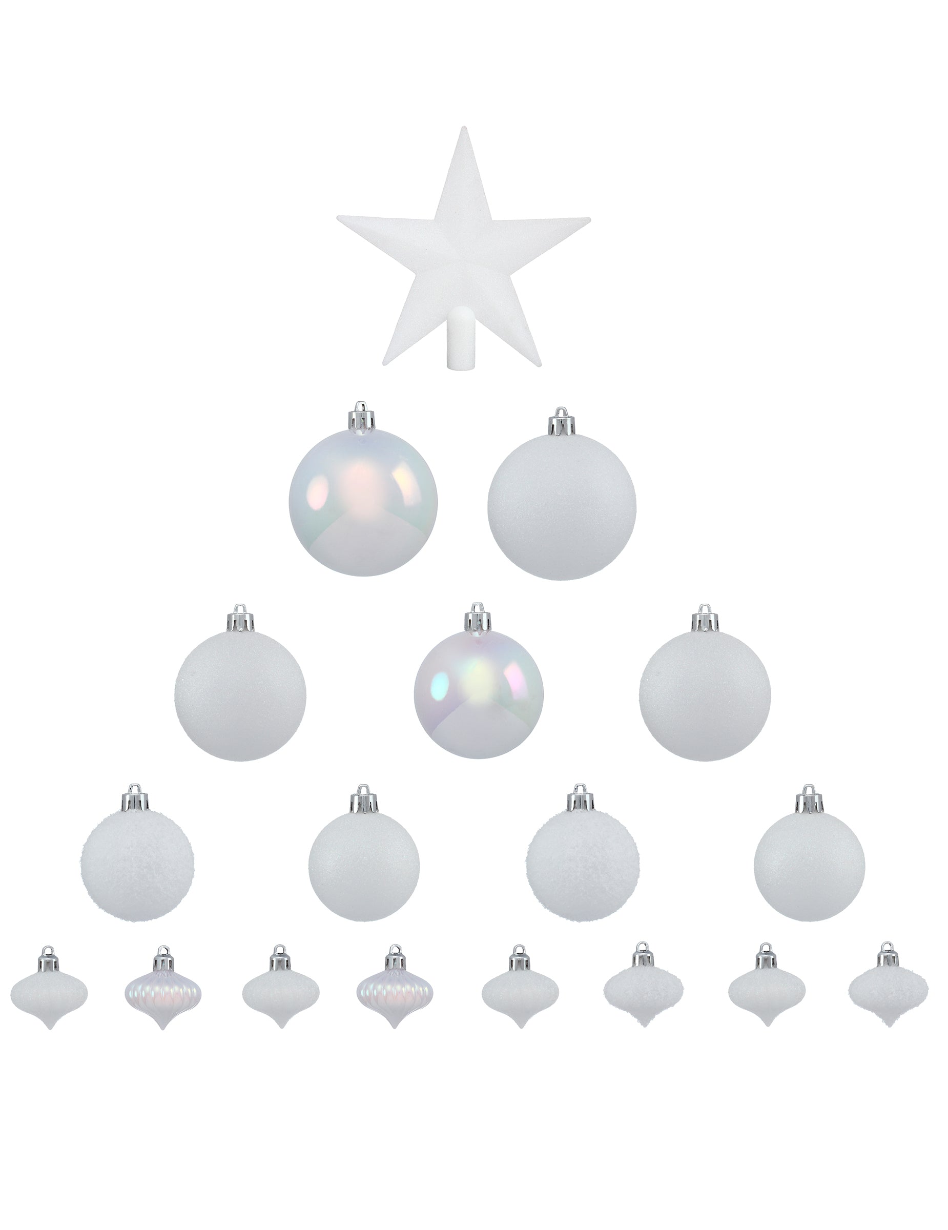 Apportez une touche de magie à votre intérieur avec cet ensemble de 18 décorations pour sapin blanches, déclinées en finitions mates, brillantes et pailletées.