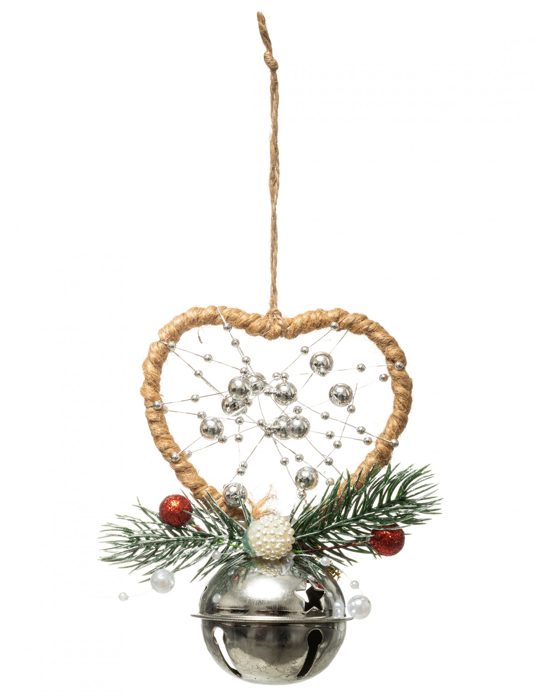 Okrasite svoj dom s tem vzmetenje od 12 cm v pristnem slogu. To srce je narejeno iz pletene vrvi in okrašeno s srebrnimi jagodami, jelkovimi vejicami in majhnim kovinskim zvončkom. Je popoln dodatek, ki doda pridih naravno vzmetenje k vaši dekoraciji med Božična praznovanja.