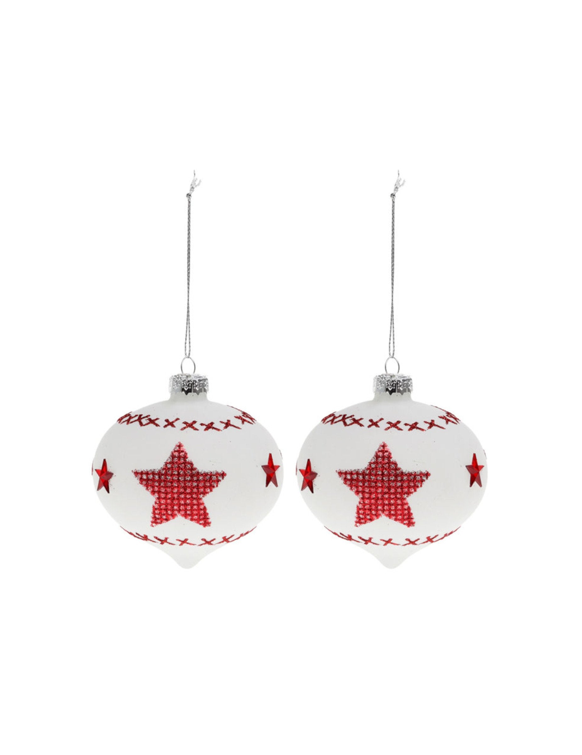 Ta komplet dveh Božične kroglice kozarec meri približno 8 cm v premeru. Čisto bele barve se odlikujejo po kontrastnih rdečih zvezdnih vzorcih. Te bele in rdeče kroglice popolnoma se integrira na Božično drevo s tradicionalnim videzom za uspešno vzdušje zabave.
