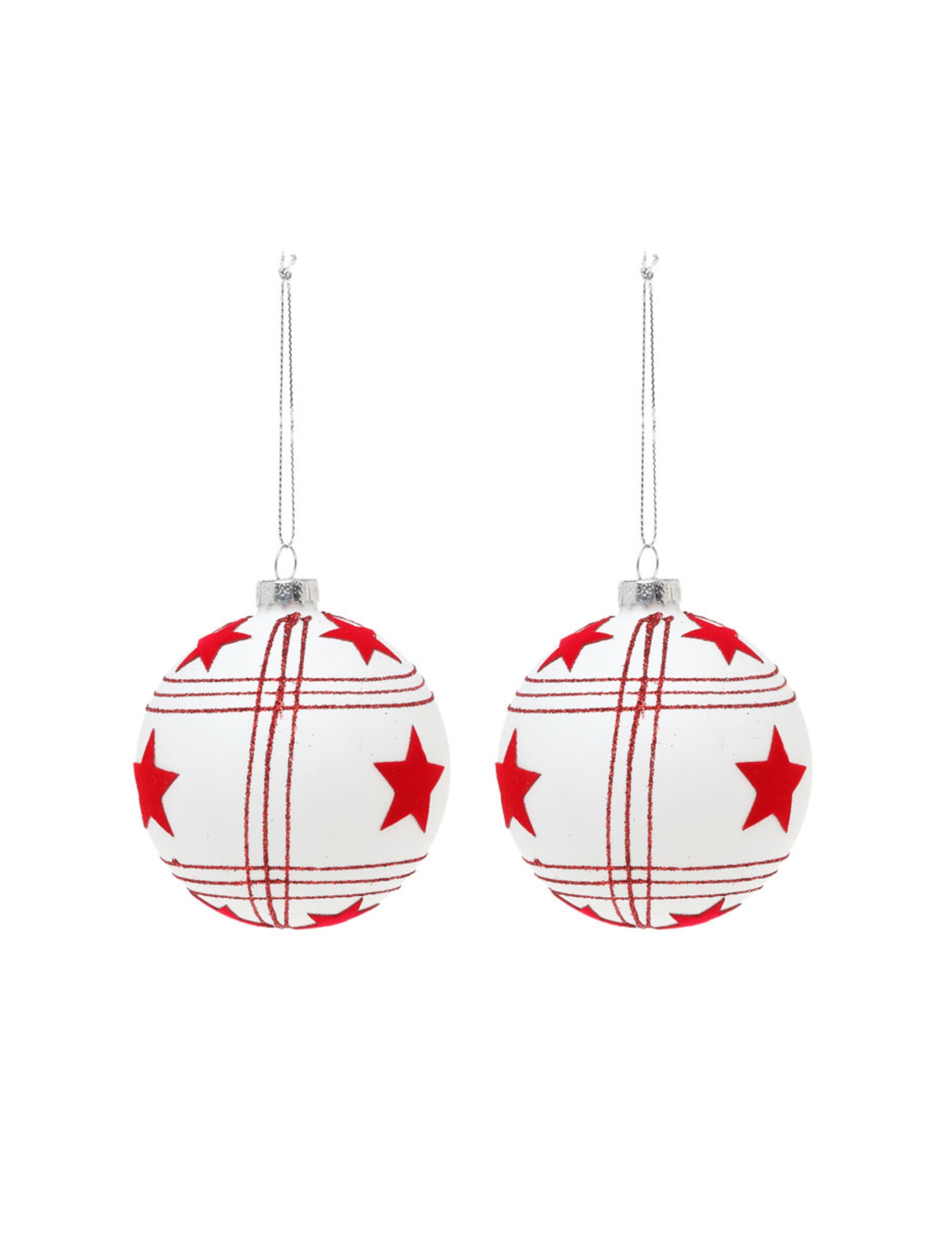 Polepšajte svoje praznične okraske s tem dvojcem dveh Božične kroglice izdelano iz 8 stekel cm premera. Njihovo belo ozadje je nežno okrašeno z linearnimi vzorci in majhnimi kontrastnimi rdečimi zvezdicami. Te tradicionalne kroglice so kot nalašč za okrasitev vej vašega Božično drevo z eleganco in prefinjenostjo.