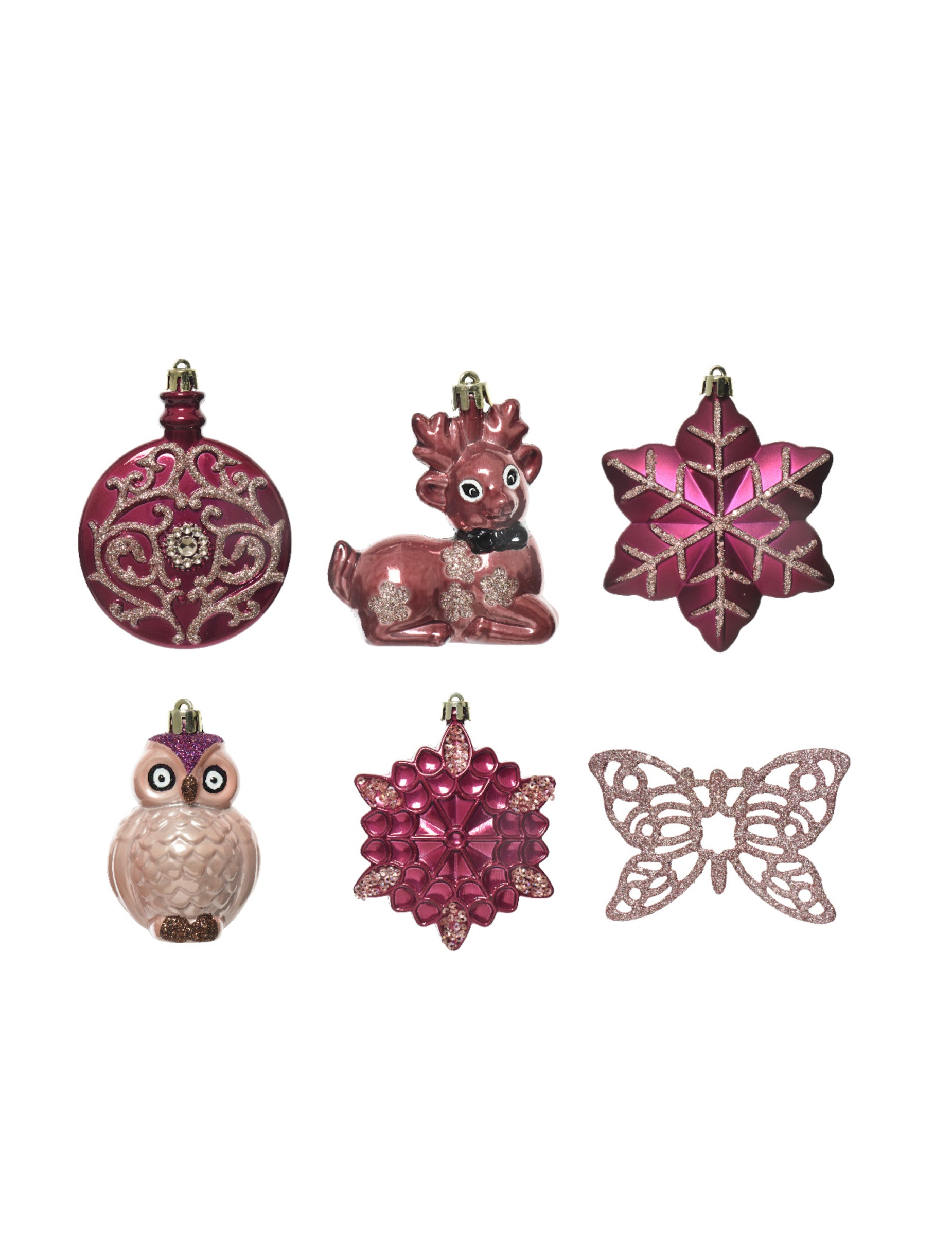 Ta komplet vključuje bleščeče božične kroglice, snežinke in rože v barvi marsale, ki jih dopolnjujeta rožnato zlati severni jelen in bledo rožnata sova.
