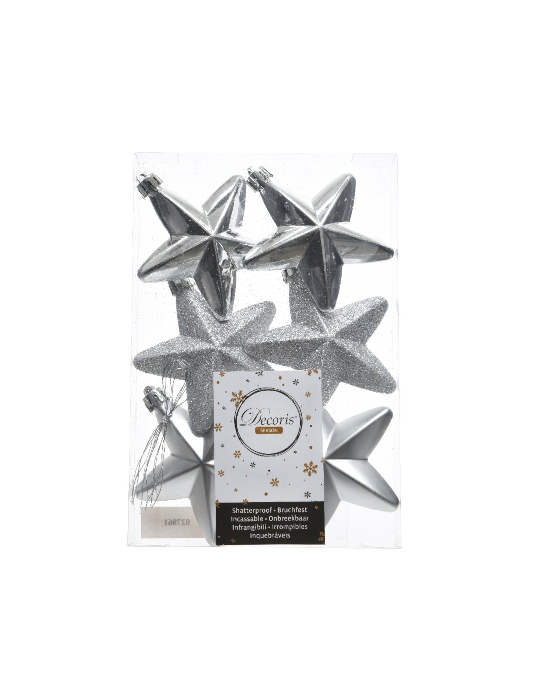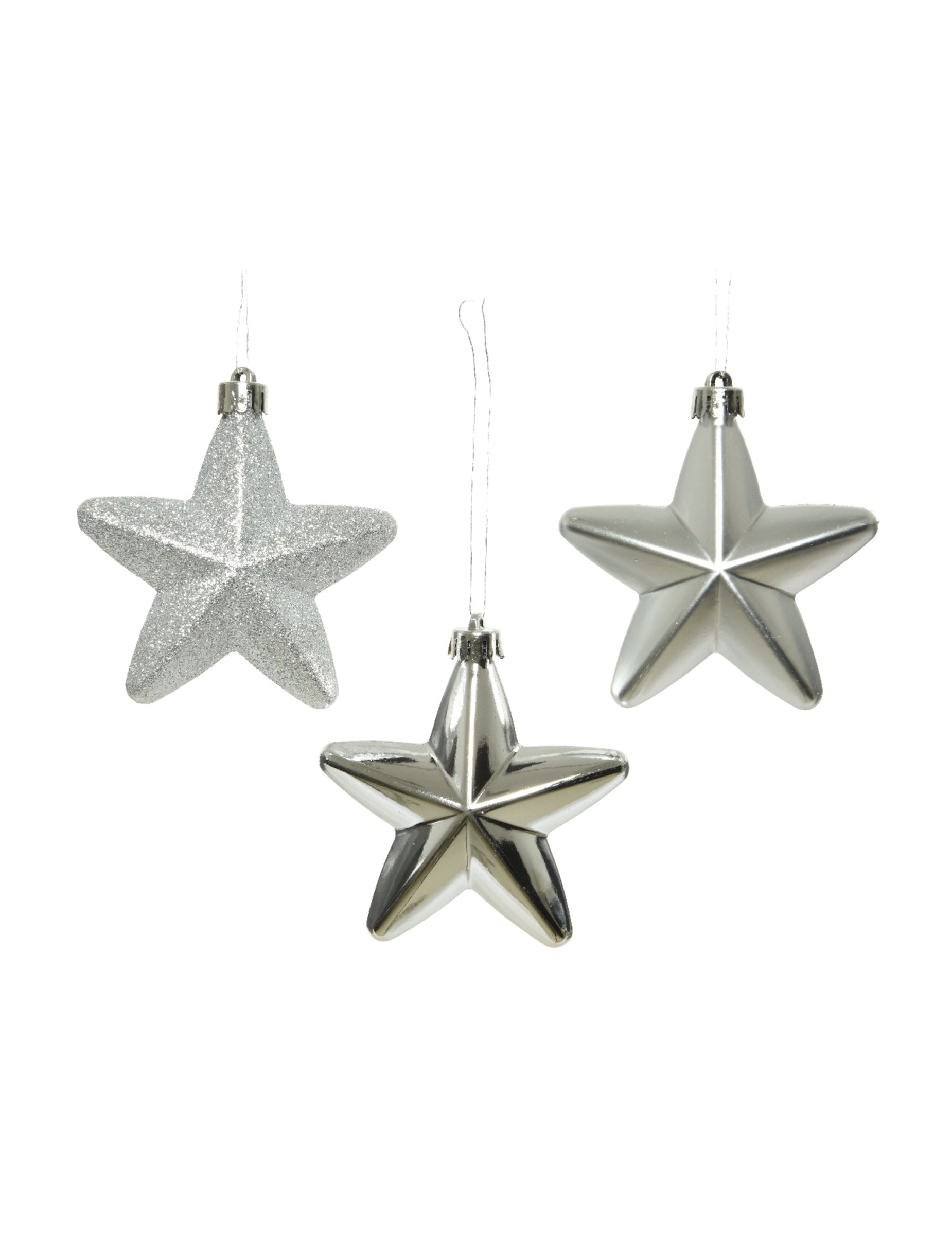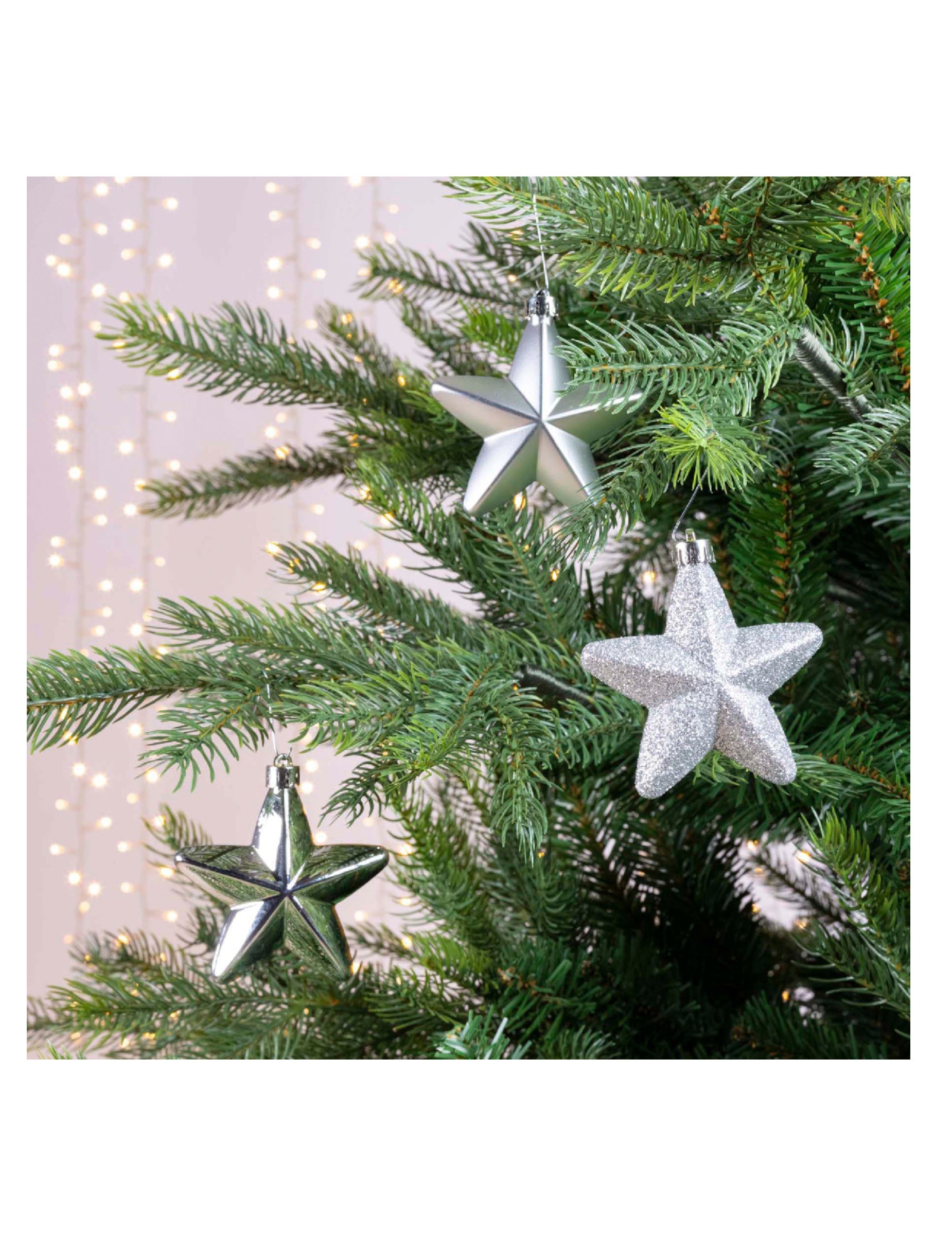 Ta komplet vsebuje 6 Okraski za božično drevo z dimenzijo 7,5 cm. Te lepe srebrne zvezde Ponujajo mešanico mat, sijajnih in bleščečih tekstur za ustvarjanje različnih odsevov. Je idealen dodatek za ustvarjanje šik, zimskega vzdušja med Božična praznovanja.