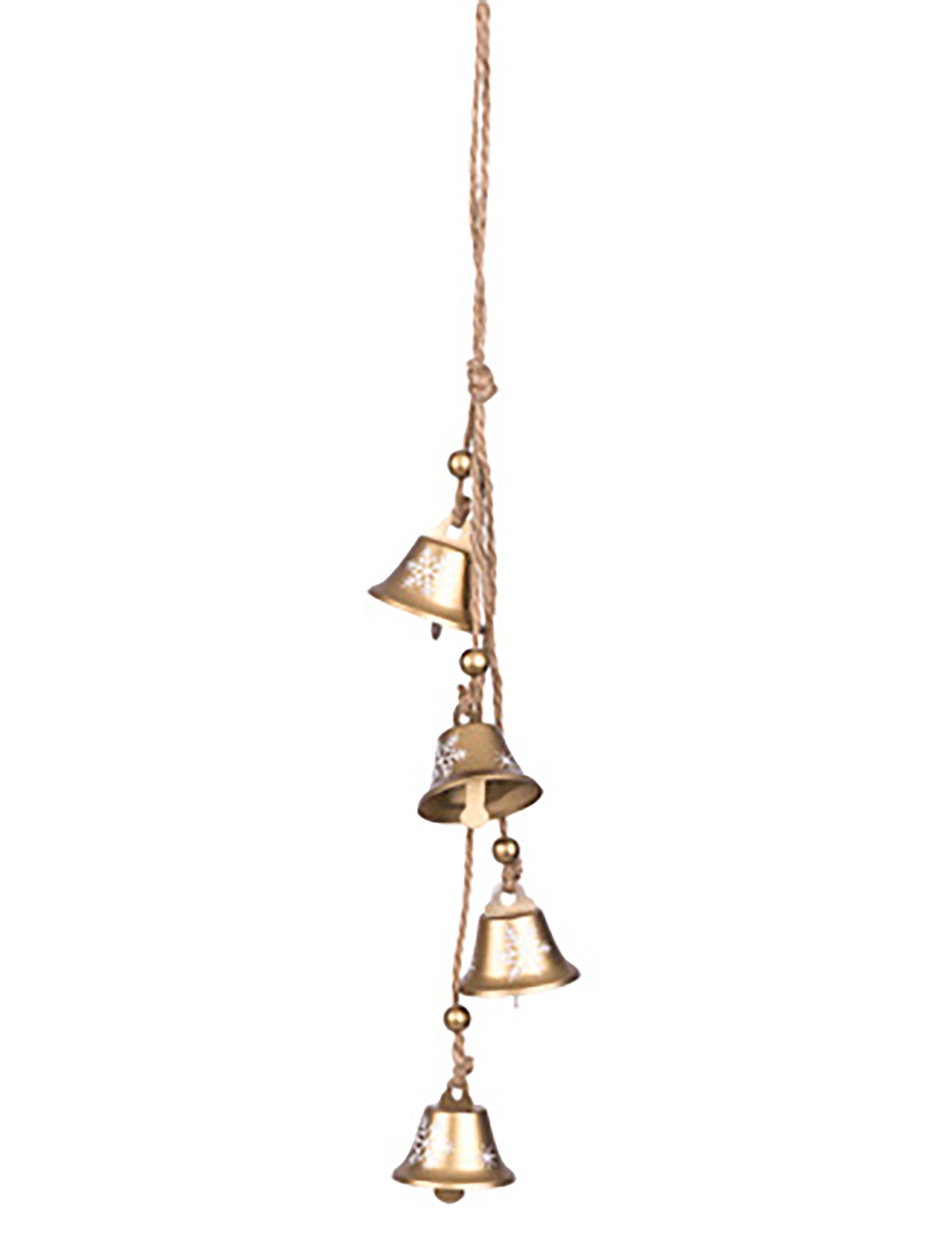 To vzmetenje okrasna, dolga 42 cm cm Sestavljen je iz več zlatih zvončkov, okrašenih z belimi vzorci snežink. Vsak element ima premer 4,5 cm in je pritrjen na tanko vrvico. viseči zvonovi so idealen dodatek za dokončanje vaše dekoracije Božič.