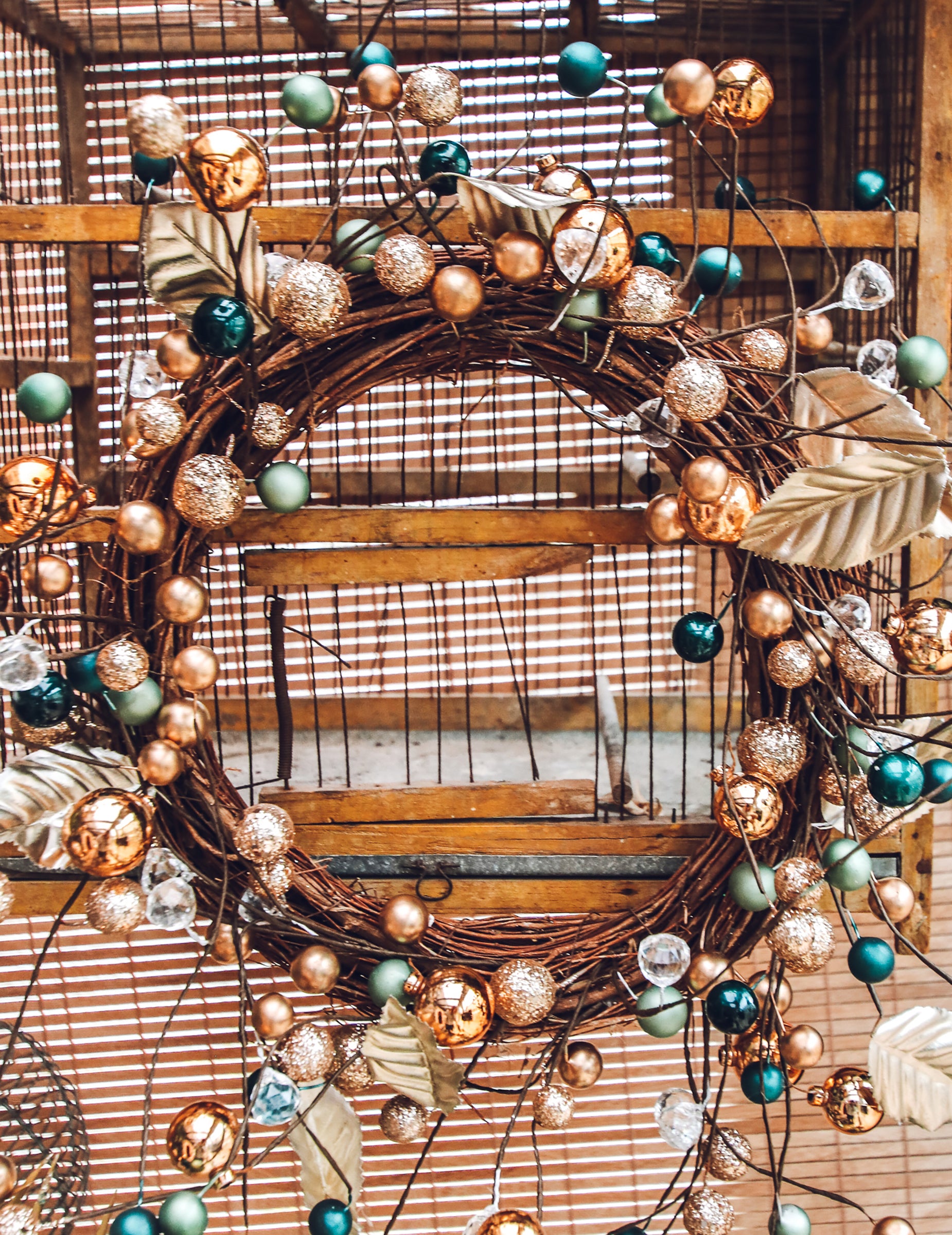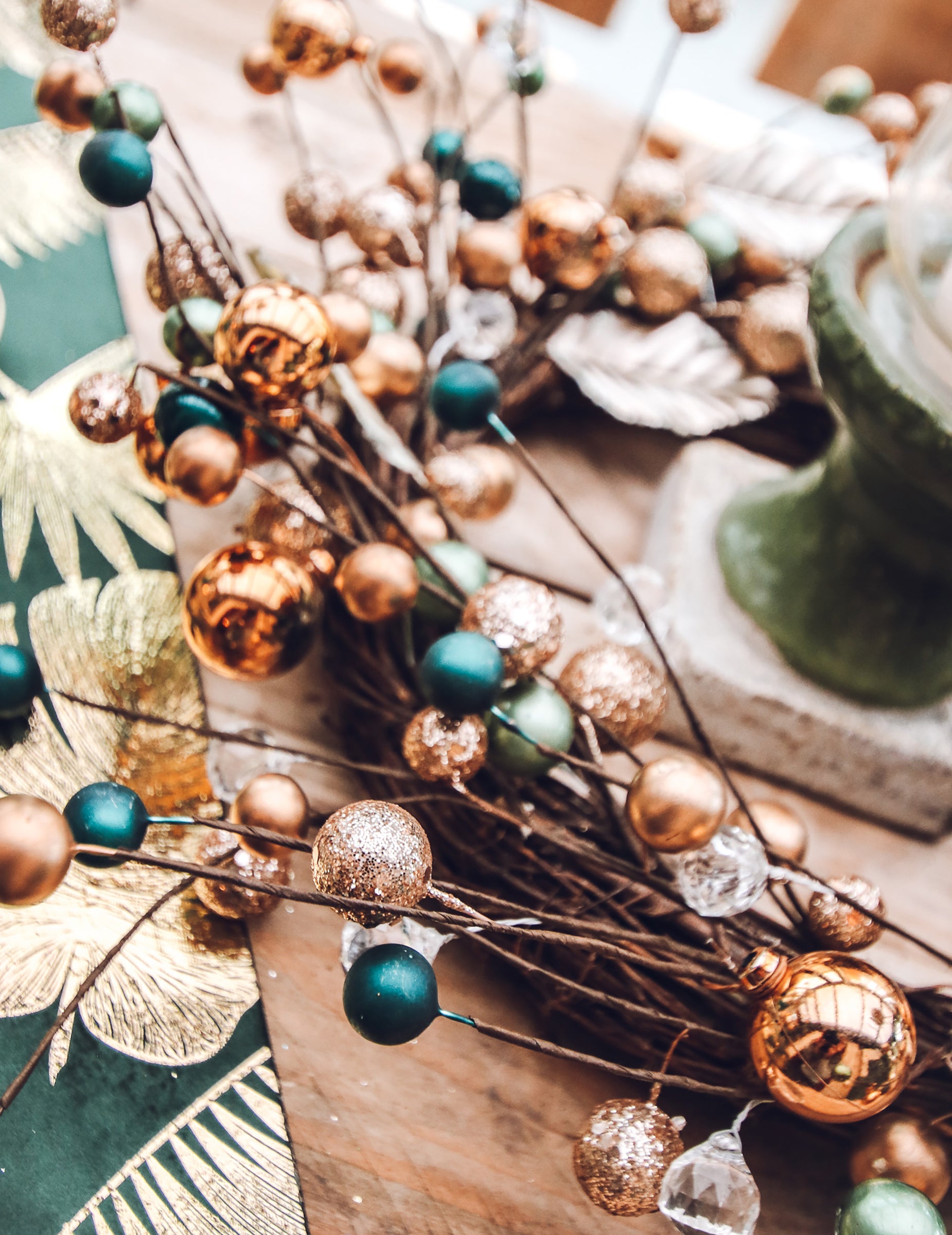 S premerom 40 cm, to okrasni venec bo vaši notranjosti dodal pridih elegance. Njegova zasnova harmonično združuje veje, liste z zlatimi poudarki in bleščeče kroglice v odtenkih zelene in turkizne barve. Je krona prefinjeno, idealno za ustvarjanje vzdušja Božič edinstveno in praznično.