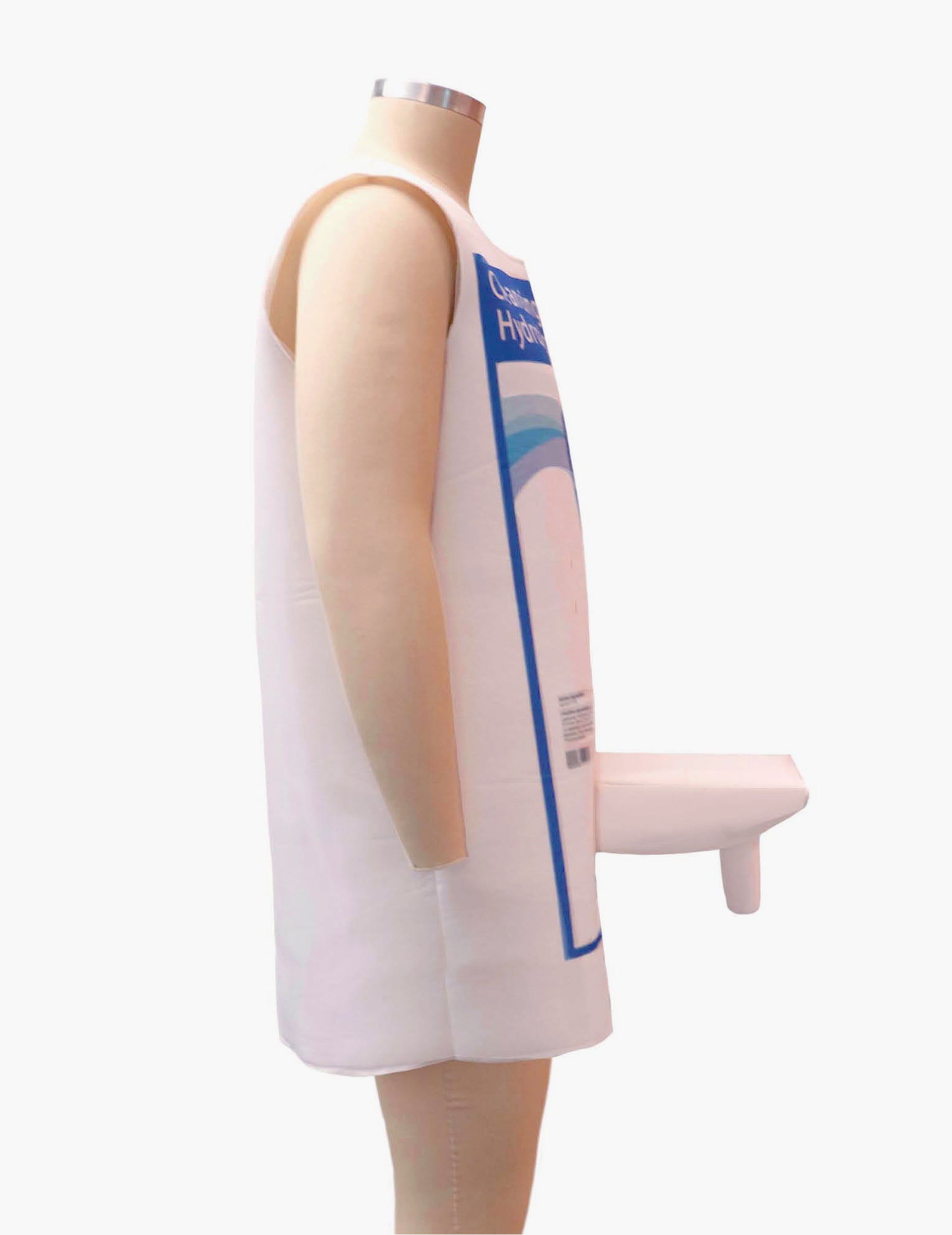 Ta šaljiva preobleka hidroalkoholnega gela je namenjena odraslim in je sestavljena iz tunike. Tunika je brez rokavov in bele barve. Ima hidroalkoholni nalepki gela z risbo modrega in belega križa in lažno črtno kodo. Prinaša napis "CleanSig Handy Gel Hydroalkoholni gel". Dno tunike predstavlja pipo hidroalkoholnega gela. Je bela. Ta šaljiv preoblečen hidroalkoholni gel bo originalen za praznovanje konca življenja samcev!