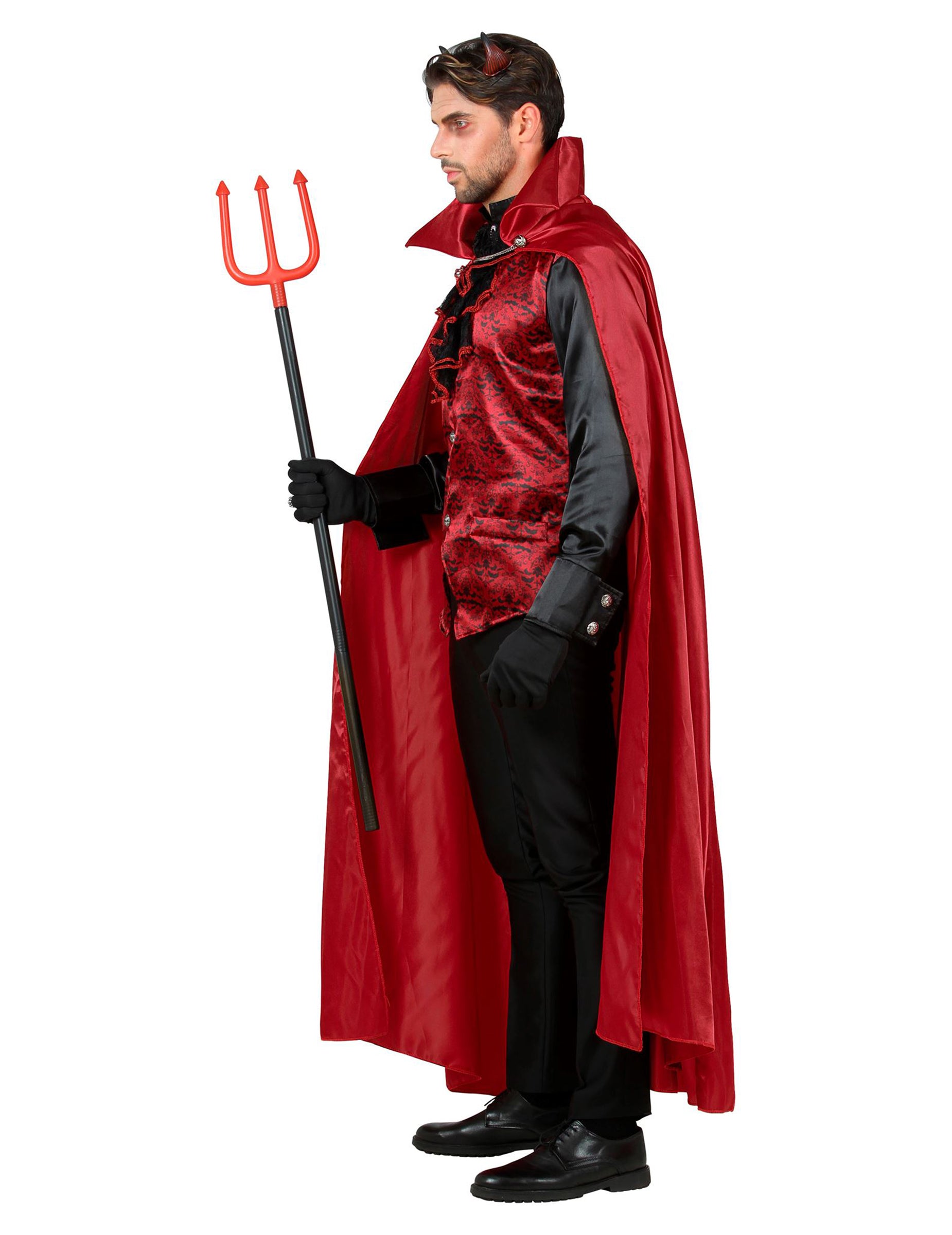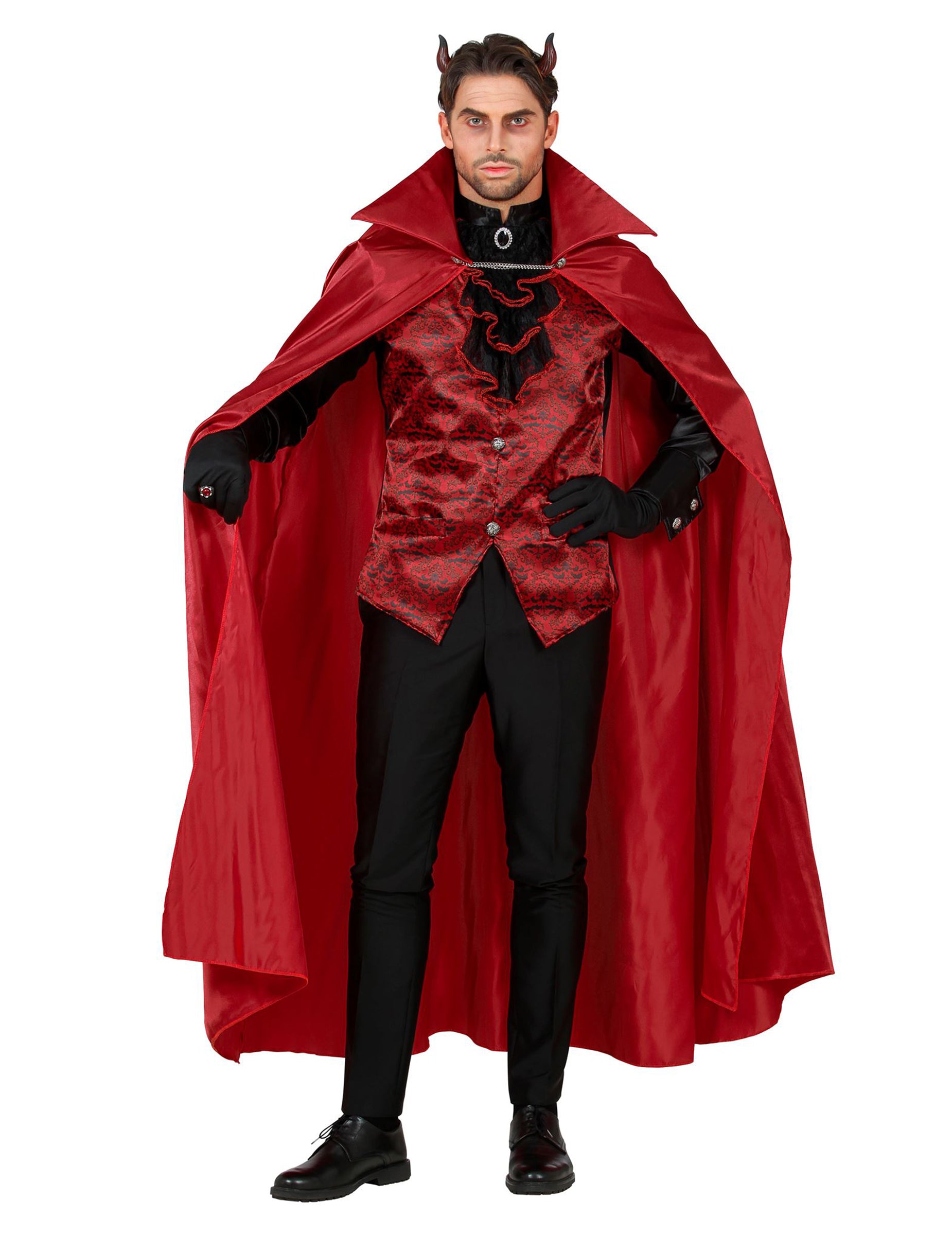 To štetje Diabolique Rouge je za moške. Sestavljena je iz majice s suknjičem in jabotom, medaljonom, plaščem in par rokavic. Dolg plašč demona vsebuje satenasto rdečo barvo. Kot zaprtje ima dvignjen ovratnik in kovinsko verigo. Vrh kostuma je sestavljen iz briljantne črne majice z rdečo jopičjo jopič z zasnovanim žametnim učinkom. Celotno spremljanje pridelka, da vse vzviše vse. Na ovratniku suknjiča je prisoten srebrni medaljon z imitacijo črnega kamna. Končno bo par rokavic iz črne barve izpopolnil vašo obleko. Ta demonski kostum vam bo postal kralj večera noč čarovnic!