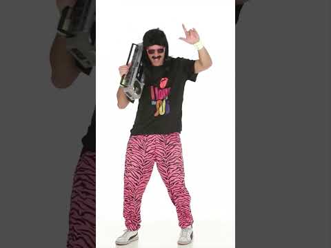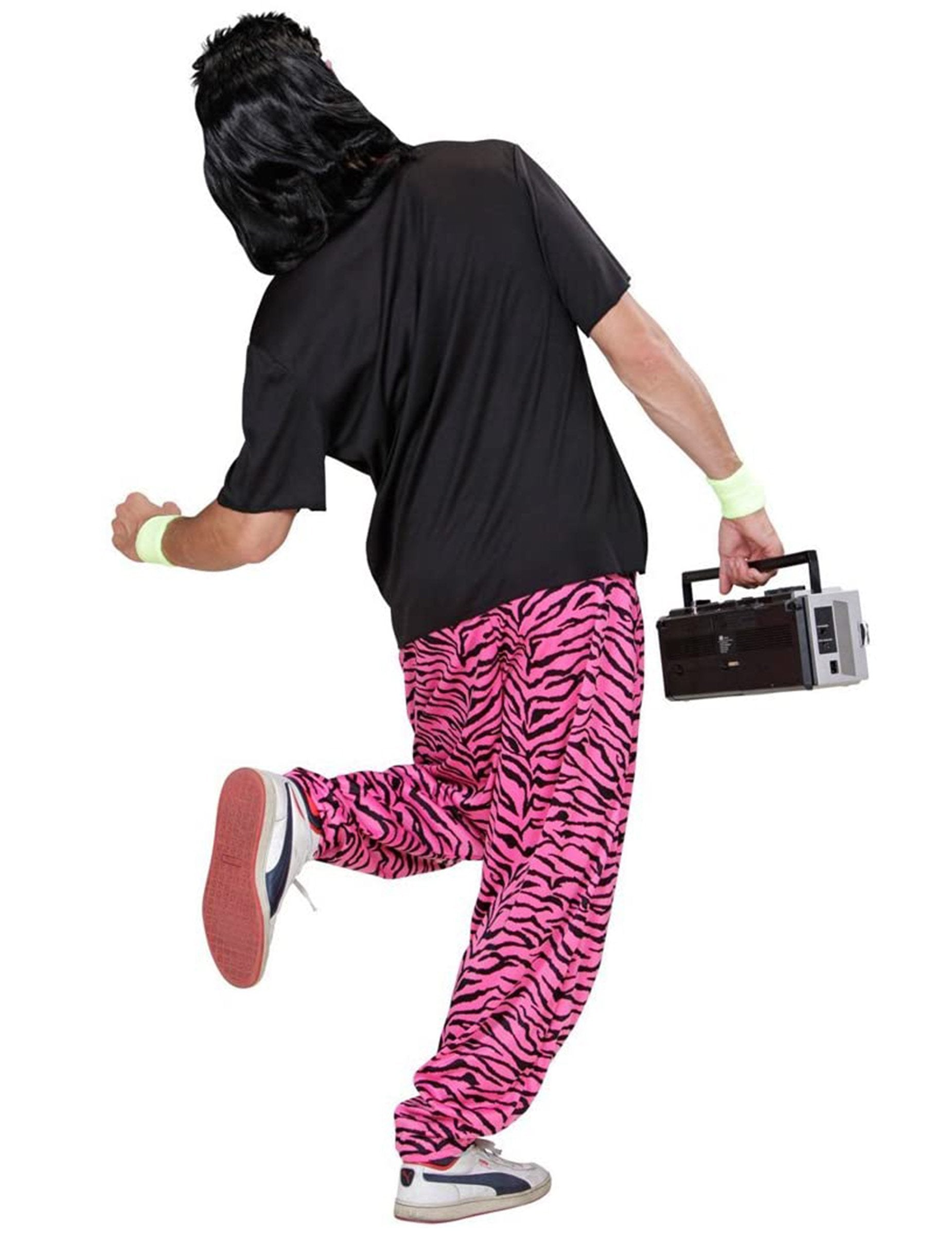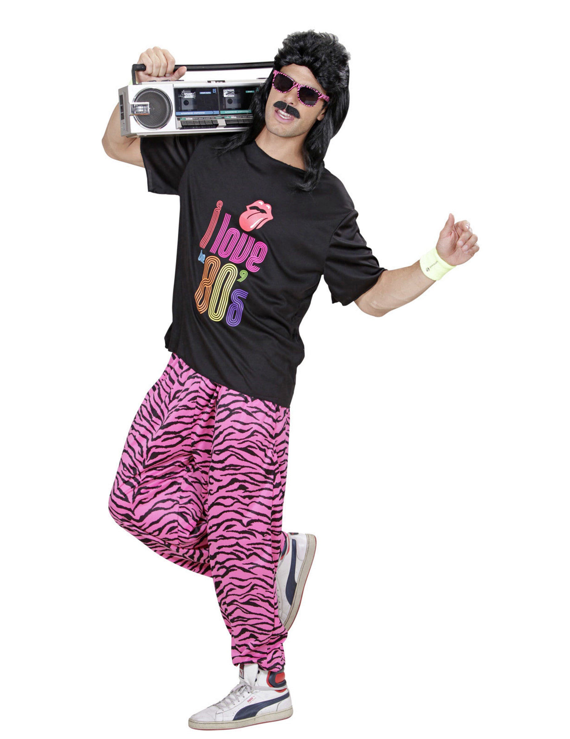 Ta tekaška preobleka, ki jo imam rada 80, je za velike moške. Sestavljena je iz majice in hlač. Nabor celote je črn in ima napis "Ljubim 80 -ih". Kostum spremljajo velike roza in črne hlače zebre, zaradi katerih ne bodo ostali neopaženi! Ta kostum bo zaveznik izbire za disko ali kičasti večer!