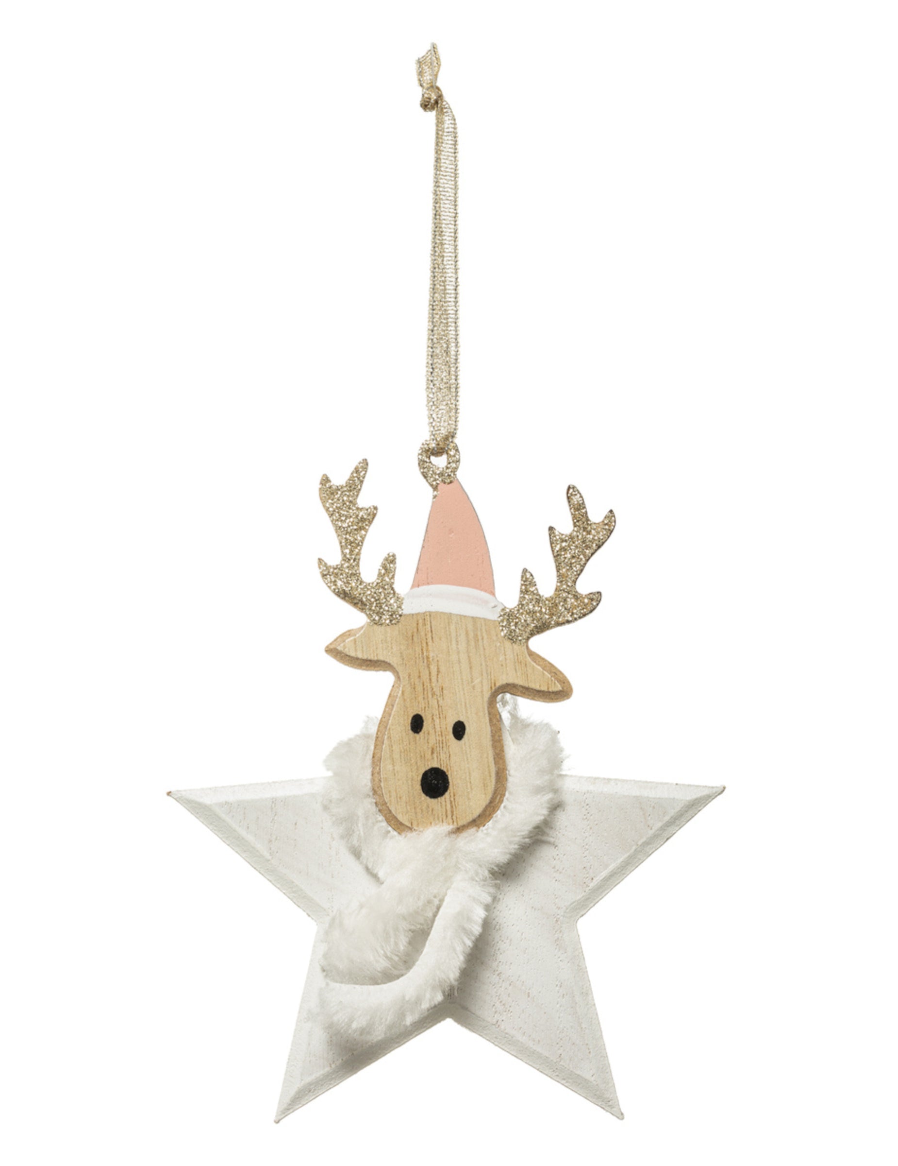 To vzmetenje približno 14 cm Njegova višina bo vaši božičnici dodala pridih nežnosti. Izdelana je iz lesa in je sestavljena iz bele zvezde, okrašene z glavo severni jeleni Z bleščečim lesom, oblečena v roza kapo in krznen šal. Eleganten trak iz organze barve šampanjca omogoča enostavno obešanje. viseča dekoracija prefinjeno je idealno za izpopolnjevanje vašega Božična dekoracija.