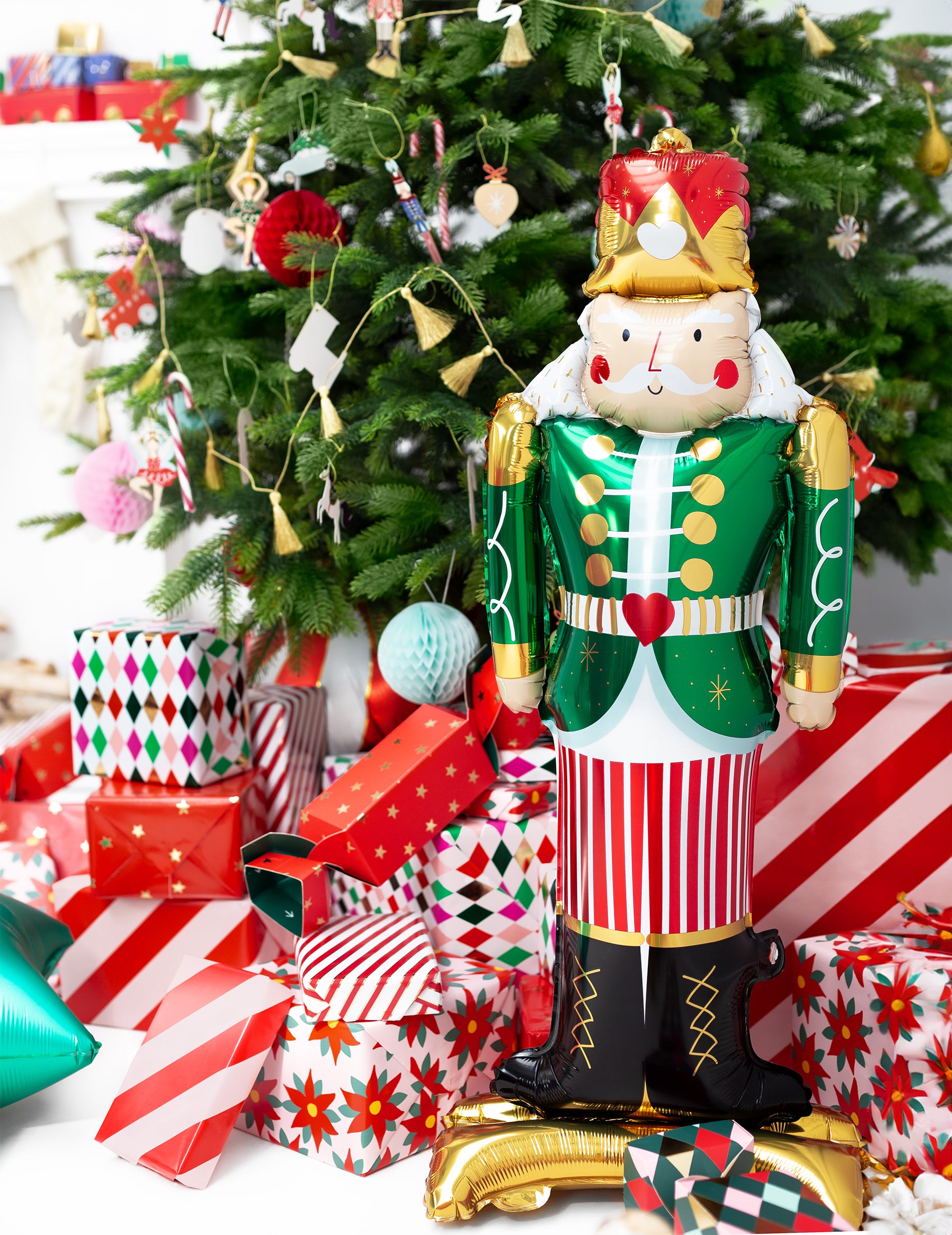 Ta velikanski božični balon je oblikovan kot vojak oreščkov in meri približno 85 x 34 cm. Narejena je iz aluminija in jo lahko napihnemo z zrakom, na svoji zlati podlagi bo stal pokonci. Izpolnite svojo božično dekoracijo s tradicionalno temo s tem balonom oreščkov!