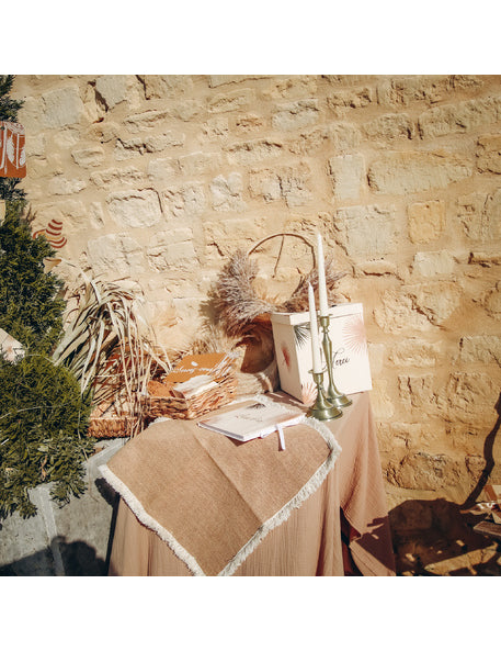 S tem dodajte svojemu sprejemu kanček sladkosti prt taupe, dimenzije 130 x 240 cm. Izdelana iz bombažne gaze ponuja tekočo in lahkotno drapiranje, idealno za dekoracijo boemska tema med poroka ali praznični dogodek.