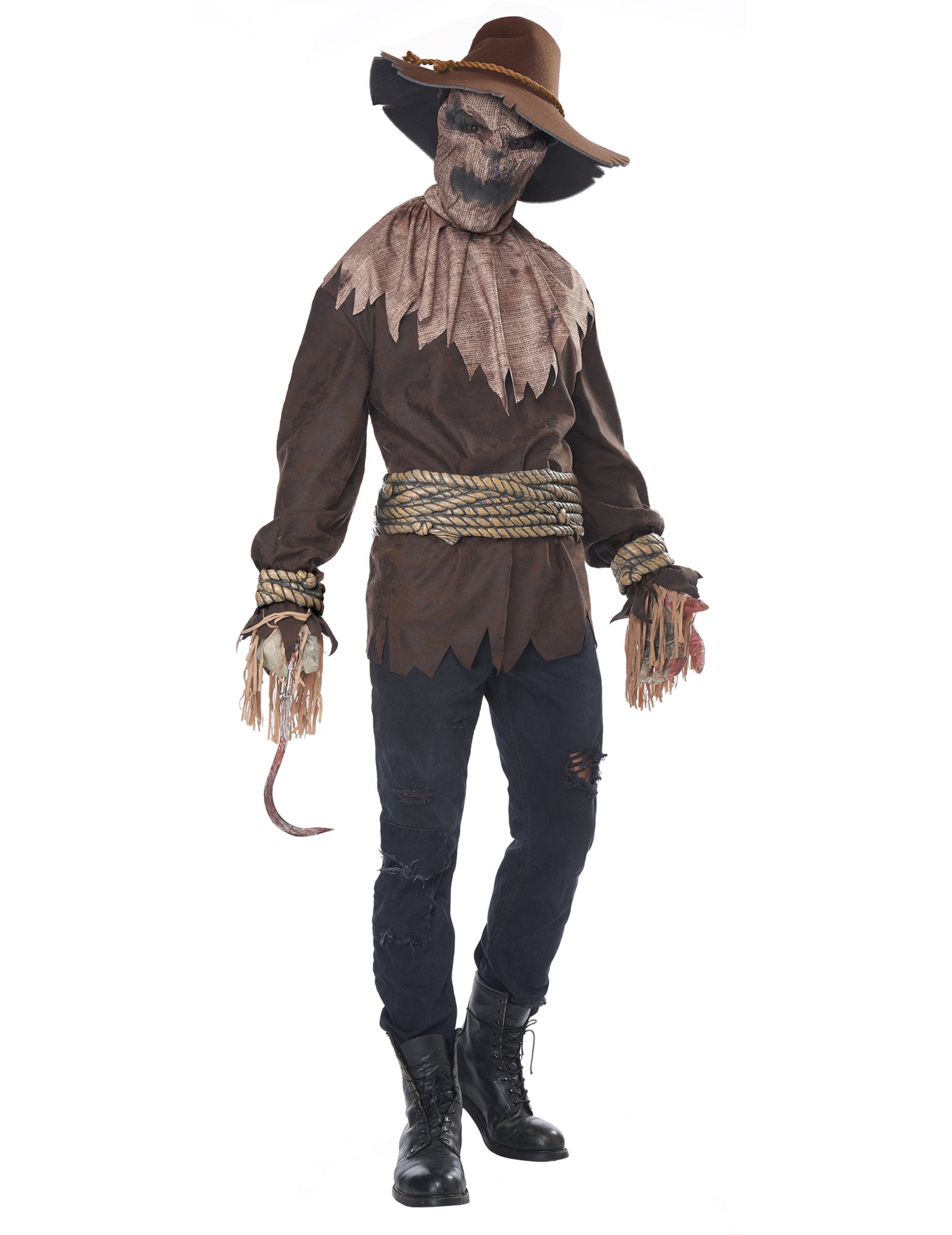 Ta grozljiva preobleka luksuznega terorizma je namenjena odraslim. Vključuje klobuk, masko, ogrlico, majico, pas in manšete. Majica prikrivanja je dolga v robu in rjavi barvi. Nad tem bo okoli vašega pasu nastavljen pas v stilu. Manšete so okrašene z vrvicami. Pokrov kostuma je rjava barva, okrašena z majhno vrvico, nameščeno okoli nje. Zgoraj lahko nataknete zastrašujočo masko tipa kapuce. Ta preobleka bo idealna za večer, preoblečen v noč čarovnic ali drugega tematskega dogodka!