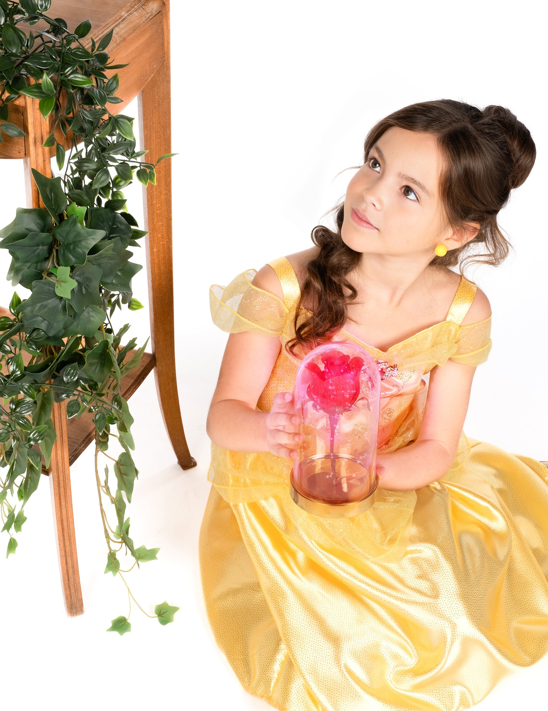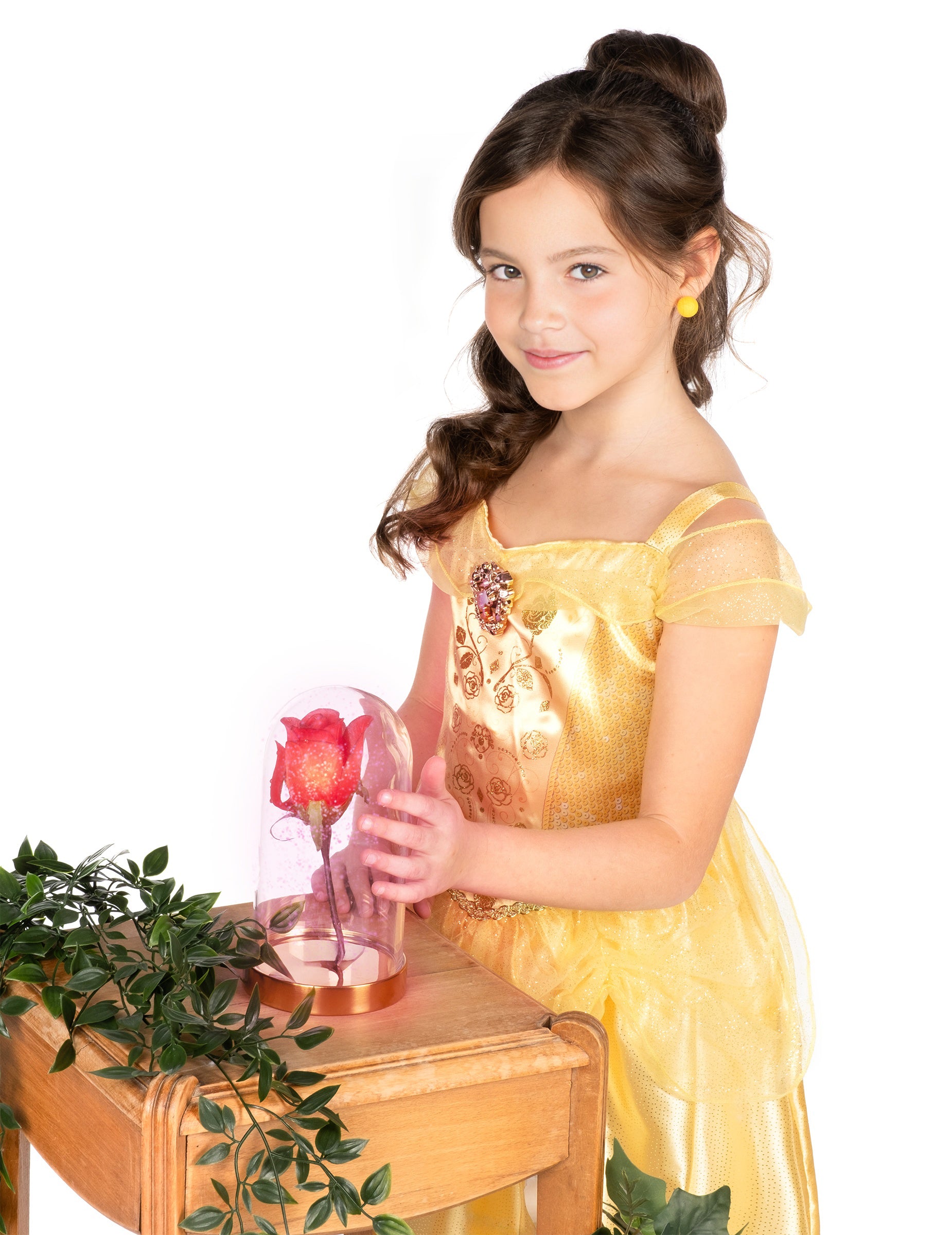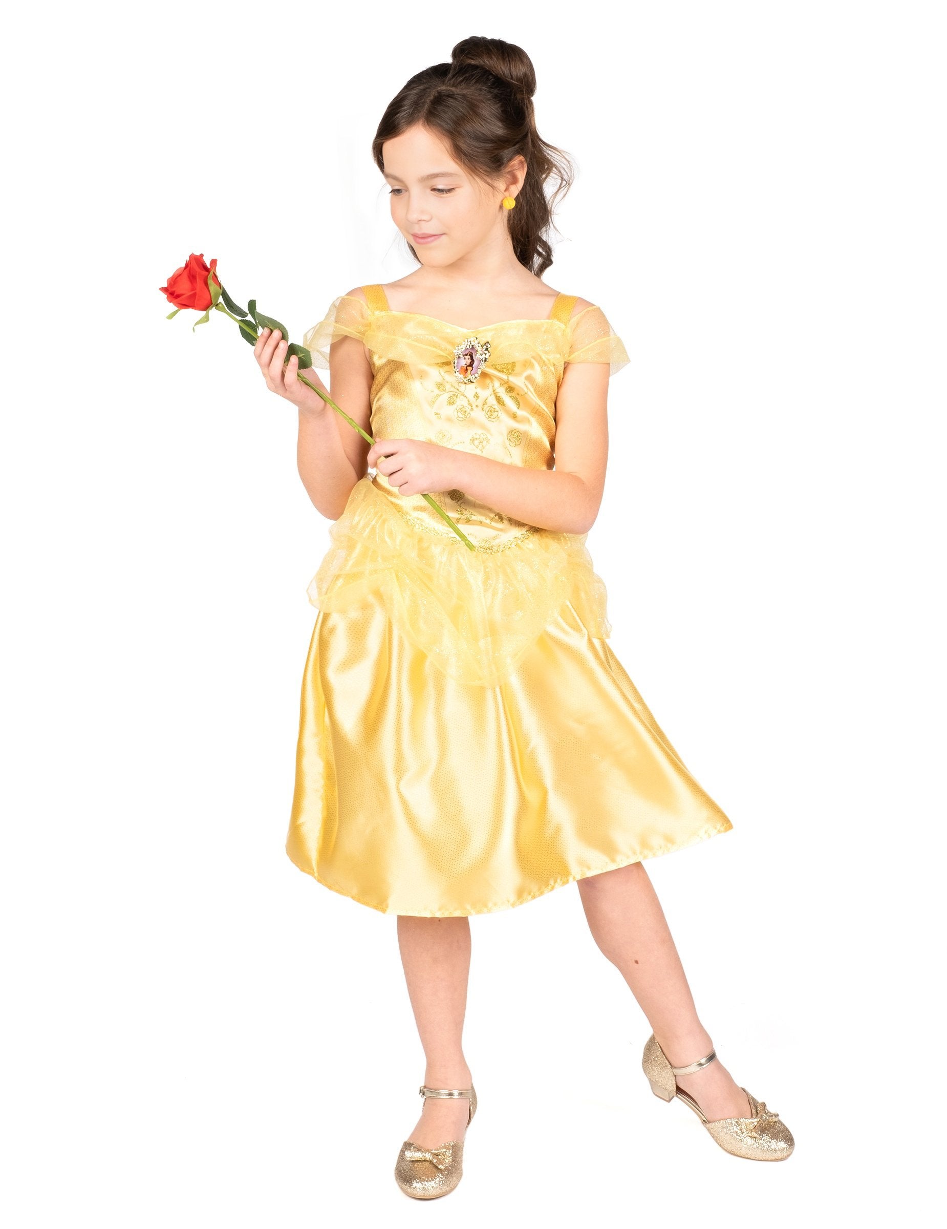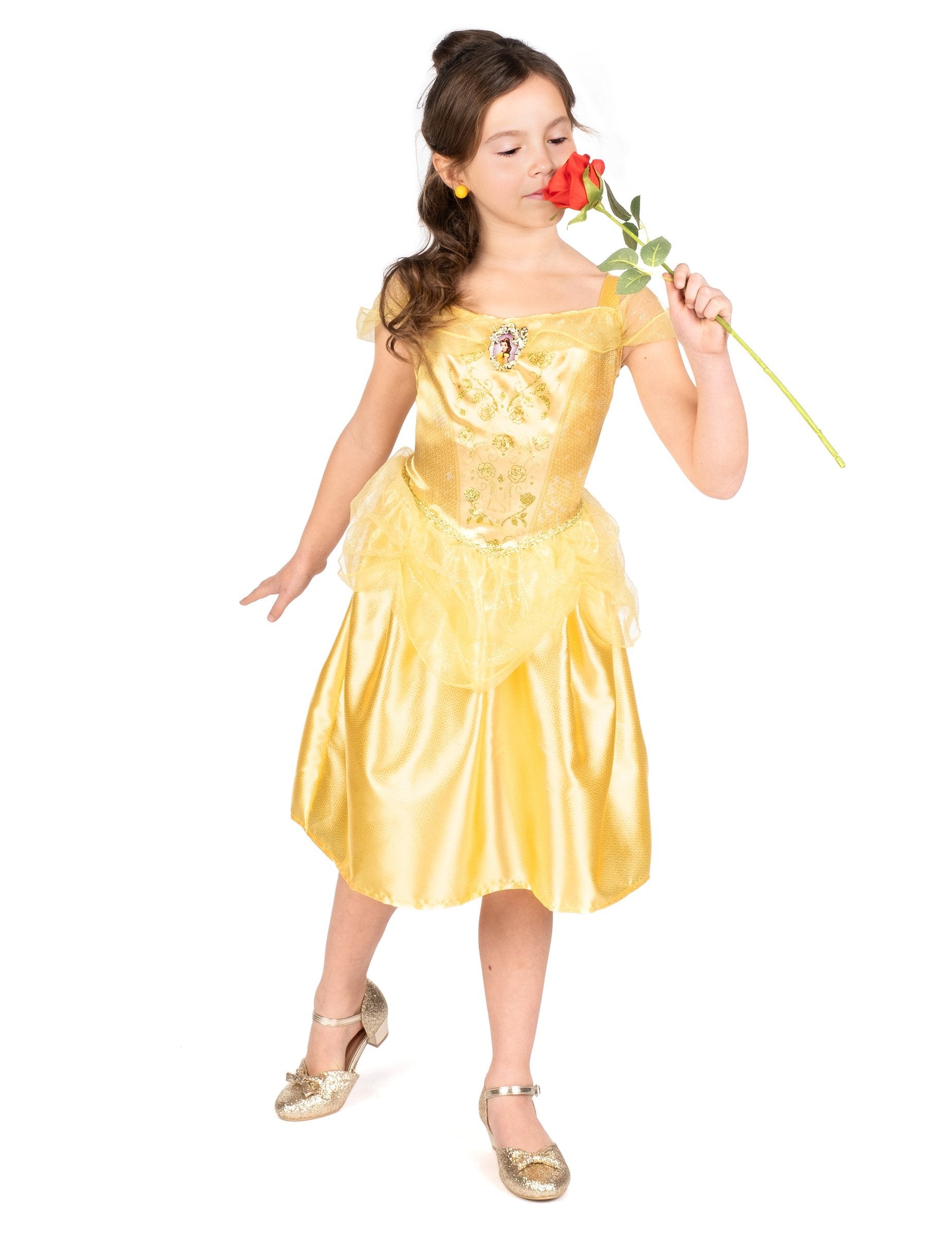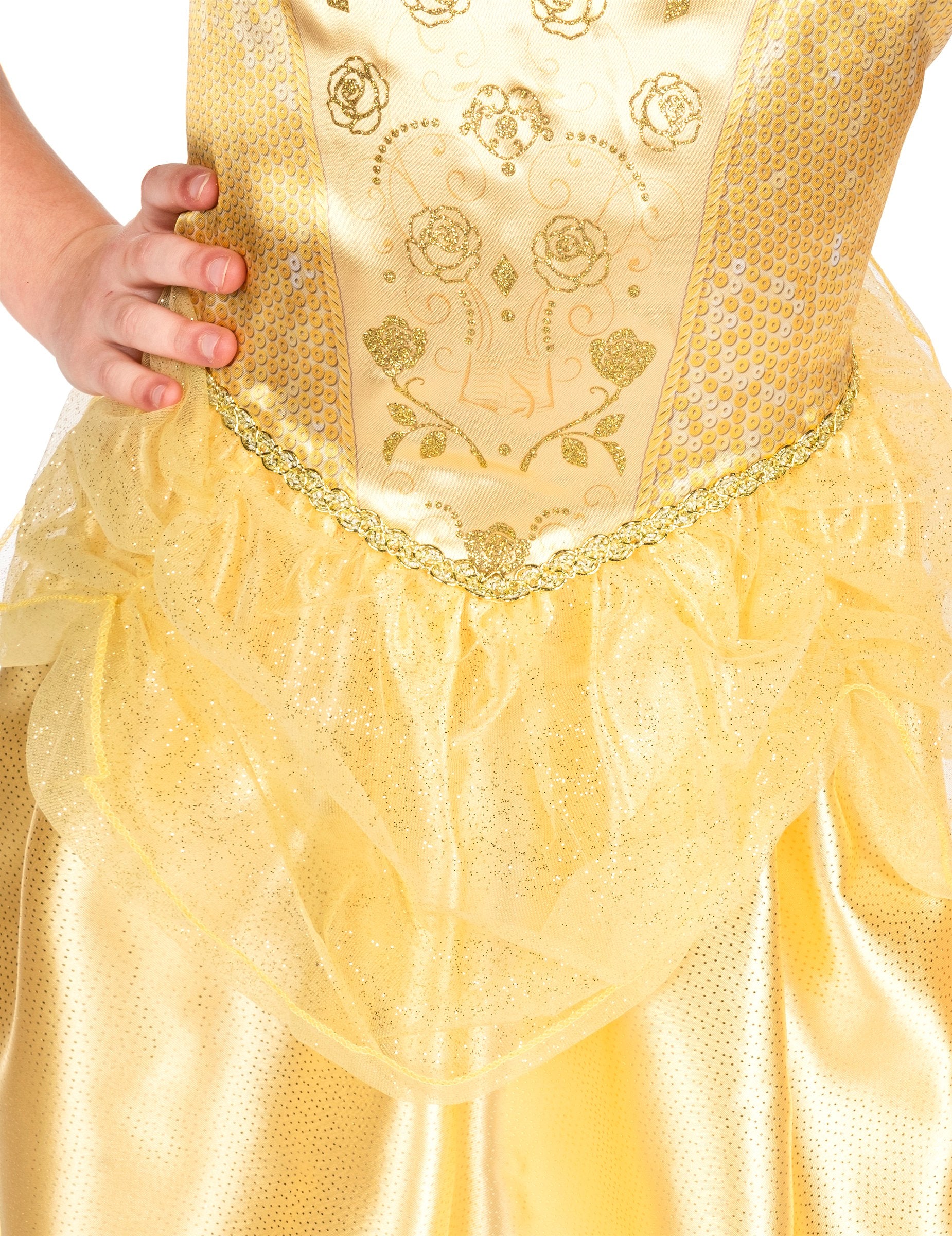 Ta klasična preobleka Lepa deklica je pod Disneyjevim uradnim licenco. Vključuje samo obleko. Obleka kostuma je srednja dolžina in nima rokavov. Rezano je v rumeni tkanini s satenastim učinkom. Na vrhu je portret "lepega" na prsih. Krilo je zabuhlo in nato okrašeno z rumeno prozorno tančico, obešeno neposredno na obleko. Fini trakovi bodo omogočili, da se vaši hčerki premika, ne da bi obleka padla. Ta princeska obleka bo idealna za izpopolnjevanje prigrizka za rojstni dan ali vaš dogodek, preoblečen ob karnevalu!