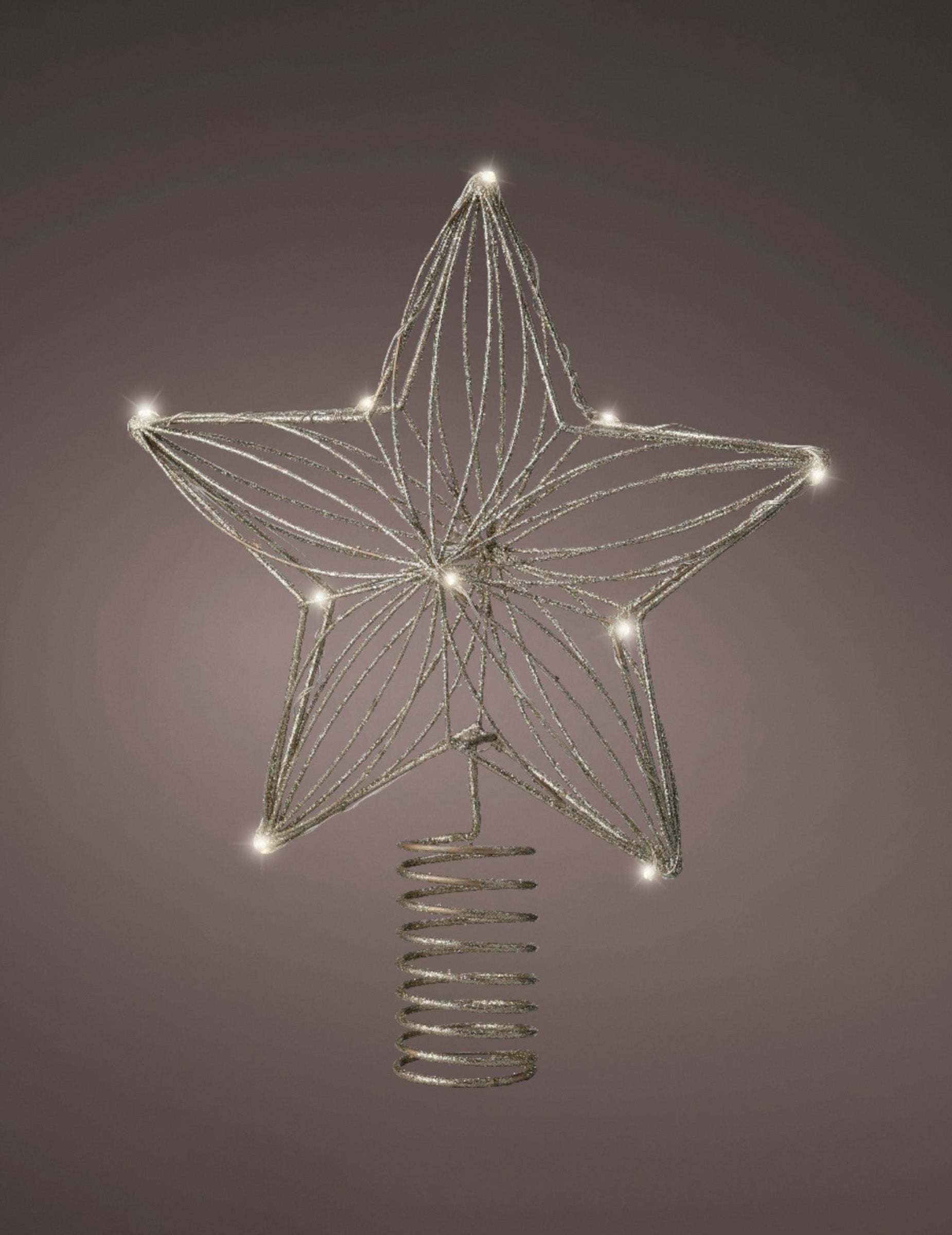 Olepšajte svoje drevo s tem Božična svetlobna dekoracija z višino 25 cm. Izdelana je iz plastike in ima obliko zlata zvezda Okrašeno z bleščicami za bleščeč učinek. Ta model ima LED diode, ki za svetlobo potrebujejo 2 bateriji AA (nista priloženi). Vzmetno podnožje omogoča enostavno namestitev. svetleči greben na vrhu tvojega Božično drevo.