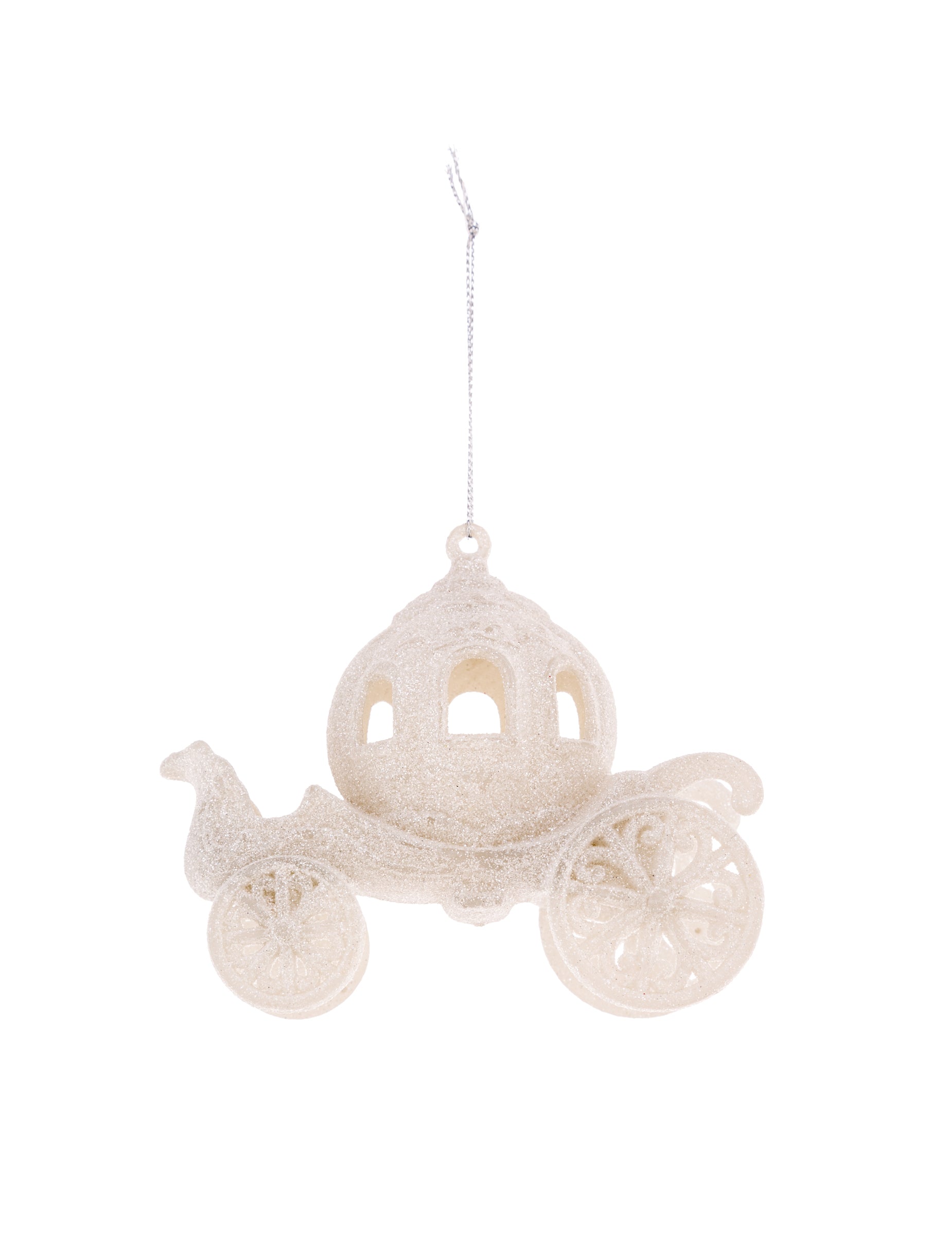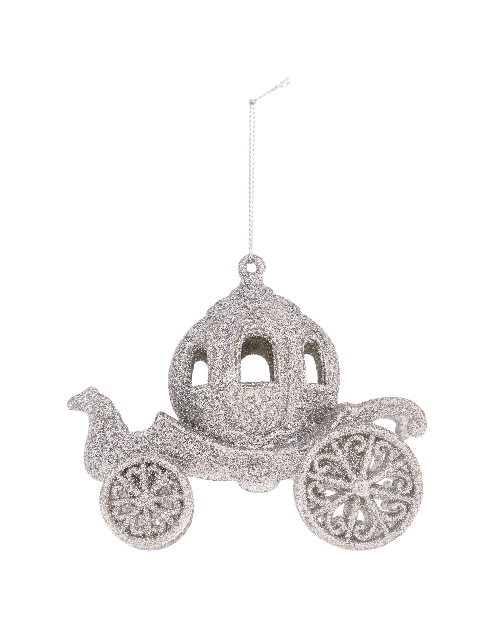 Okrasek za božično drevo v obliki vilinske kočije 11 cm s srebrnimi bleščicami