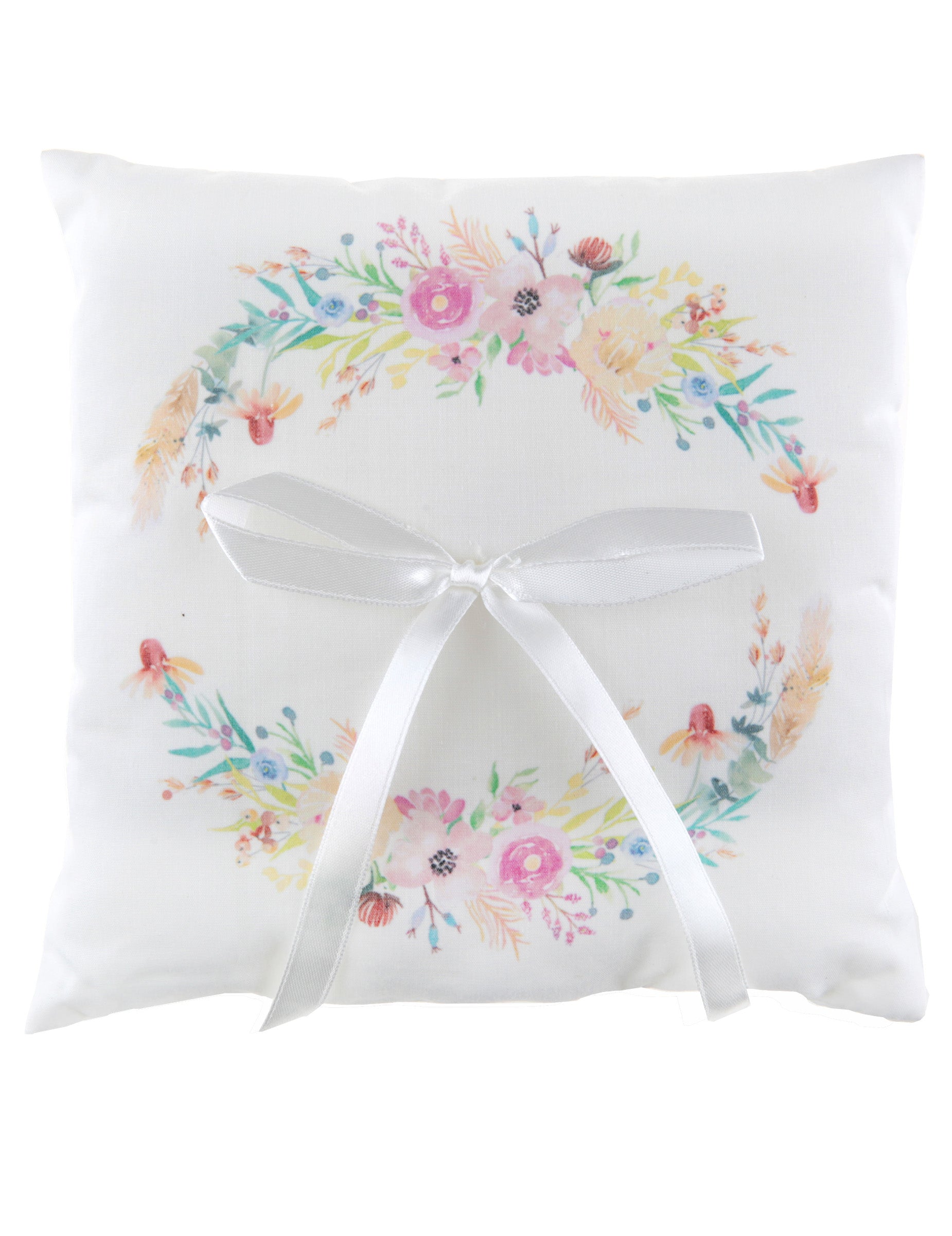 To veličastno blazina za prstan Ta bela bombažna obleka je nepogrešljiv dodatek za vašo slovesnost. Okrašena z nežno cvetlično krono v akvarelnih odtenkih, blazina za prstan 18 x 18 cm popolnoma se prilega dekorju poroka v podeželskem slogu ali pomlad. Bel satenast trak varno pritrdi vaše prstane, tako da jih lahko priča ali paži varno nosijo. To blazina za nosilca prstana bo vašemu obisku mestne hiše ali cerkve dodal romantičen in cvetličen pridih. Idealen za stil Liberty, ta cvetlična blazina za prstane bo okrepilo izmenjavo vajinih zaobljub.