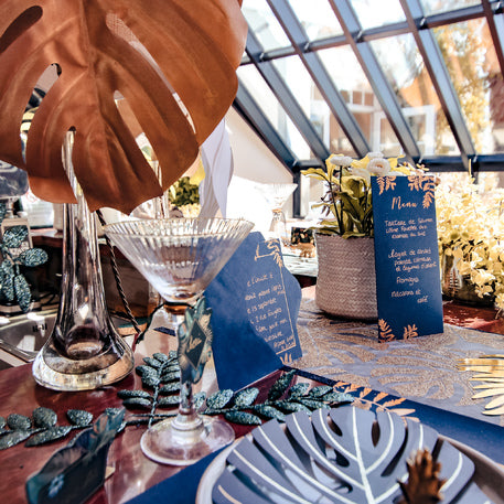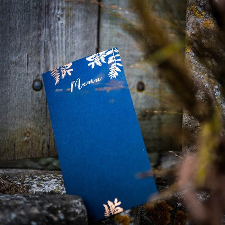 Ta komplet vsebuje 10 meniji kartonske škatle dimenzij 22,5 x 11 cm približno. V prefinjeni temno modri barvi so ponazorjeni z besedo meni in lepe praproti v bakreni barvi. Preprosto jih dopolnite s svojim najboljšim pisalom, ki bo vašim gostom pomagalo med obrokom. Ti pisarniški pripomočki so idealni za sprejem. poroka ali zabavo na tropska tema.