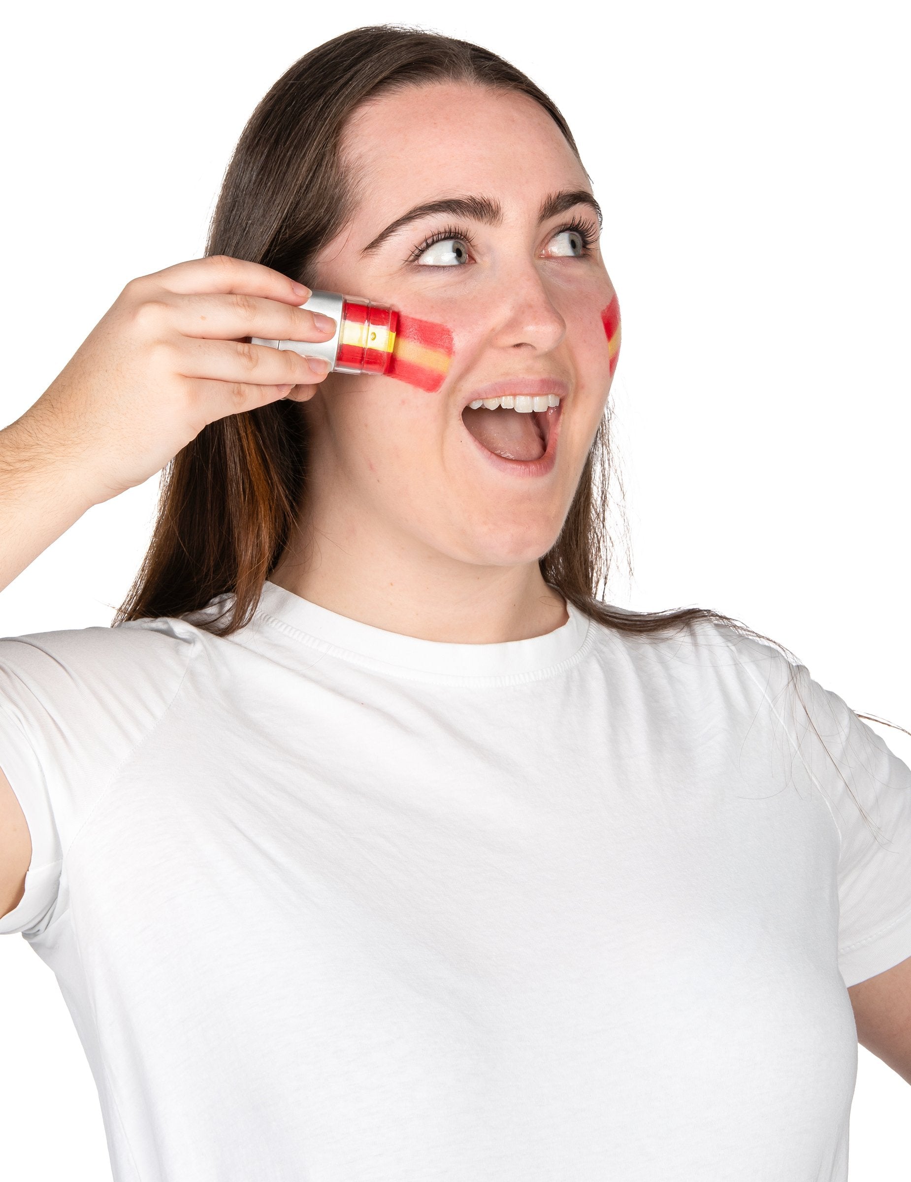 Ta podpornica ličil ustreza barvam Španije. Je v obliki trikolorne (zelene, rumene in rdeče) palice, ki vam bo omogočila enostavno in enakomerno nanašanje barv španske zastave. Ta dodatek bo kot nalašč za podporo vaše najljubše ekipe med športnim tekmovanjem, kot je nogometni svetovni pokal! Sestavine: Ceteareth-2, Ceteareth-25, Copernicia Cerifera, Rinicus Communis (Castor), izopropil, palmitat, sorbitanski oleat, talc, fenoksietanol, imidazolidinil severa. Maj vsebuje: titanov dioksid, črni železov oksid, kislina rumena 23/fd+c rumena 5 aluminijasta jezera, fd+modro št. 1 aluminijasto jezero, d+c, rdeča 28