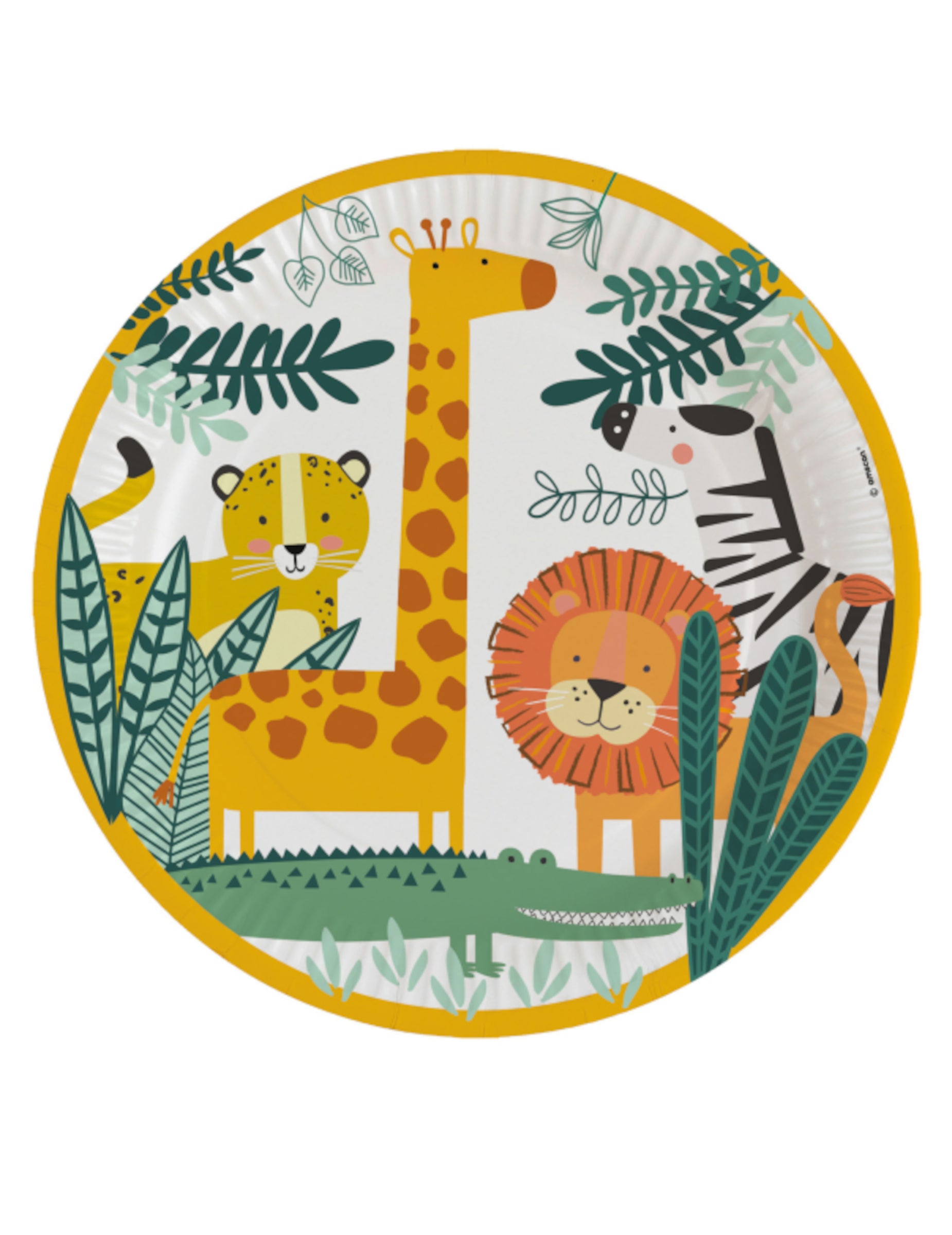 Ta sklop vključuje 8 krožniki kartonske škatle za enkratno uporabo s premerom 23 cm. Te bele podpore z rumenimi robovi poudarjajo živali od džungla kot lev, THE tiger, THE zebra, THE krokodil in žirafaVeč tropski listi okrasite tudi sredino za slog džungla popolna. Ta zbirka privoščite si divji safari idealno za dekoracijo mize otroški rojstni dan ali praznovanje za živalska tema divji.