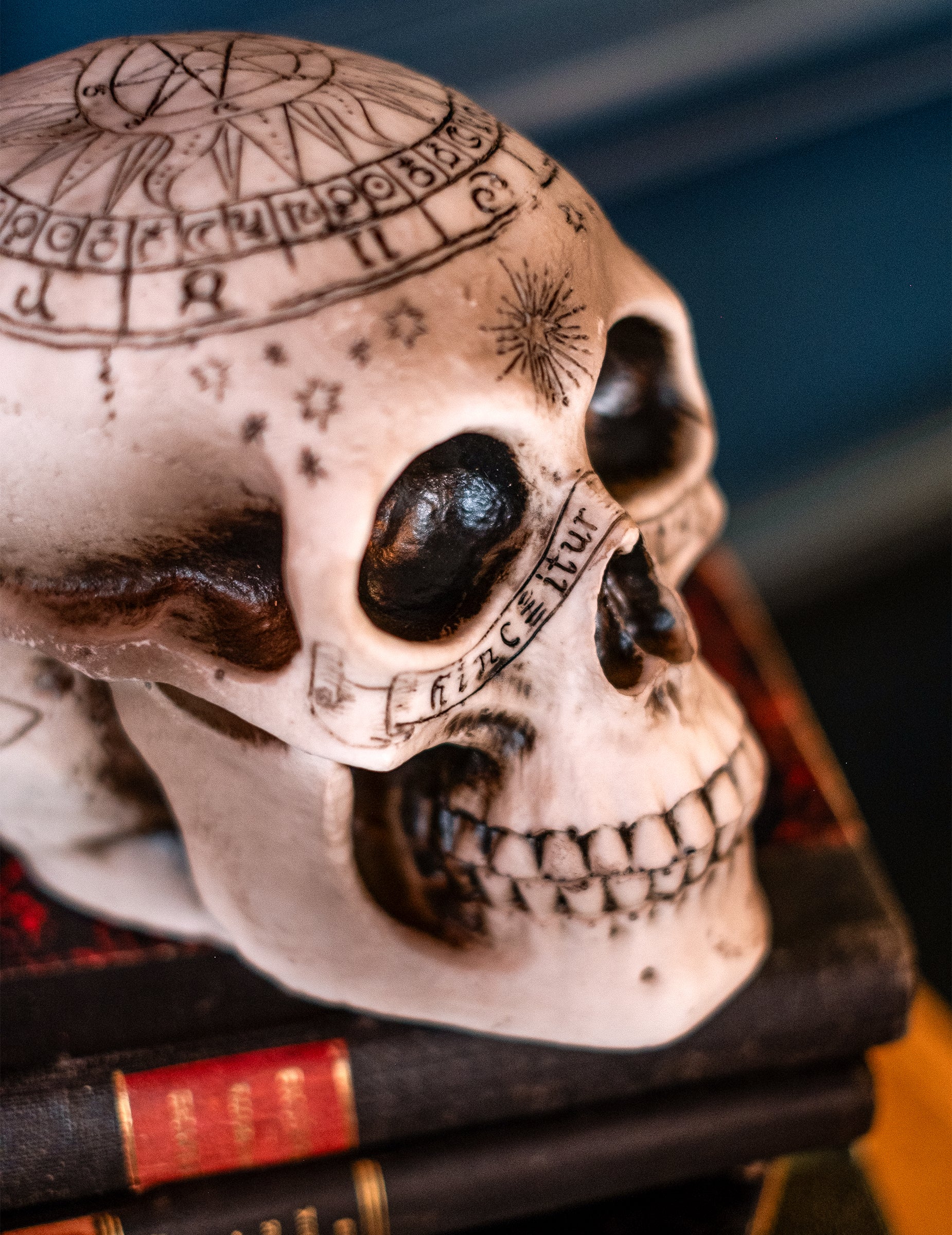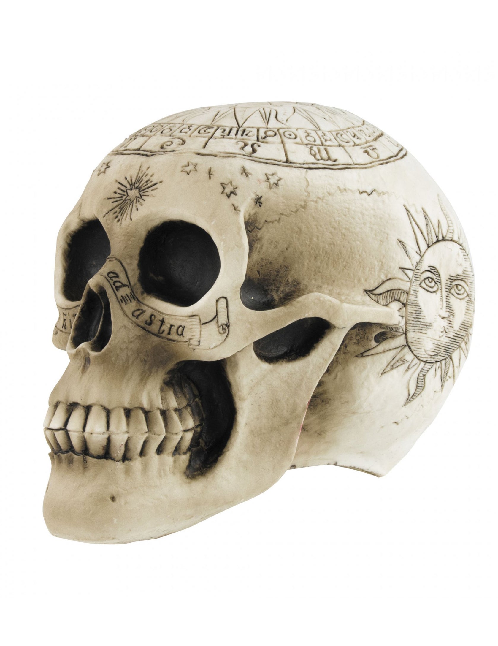 Ta skeletna lobanja ima približno 18 x 12 x 15 cm. Na splošno je bela barva, zanj pa je značilen pentagram (petkratna zvezda z različnimi vzorci) nad njim. Na njegovi strani je tudi risalno sonce. S prijatelji dokončajte notranjo opremo ali zunanjo dekoracijo s prijatelji!