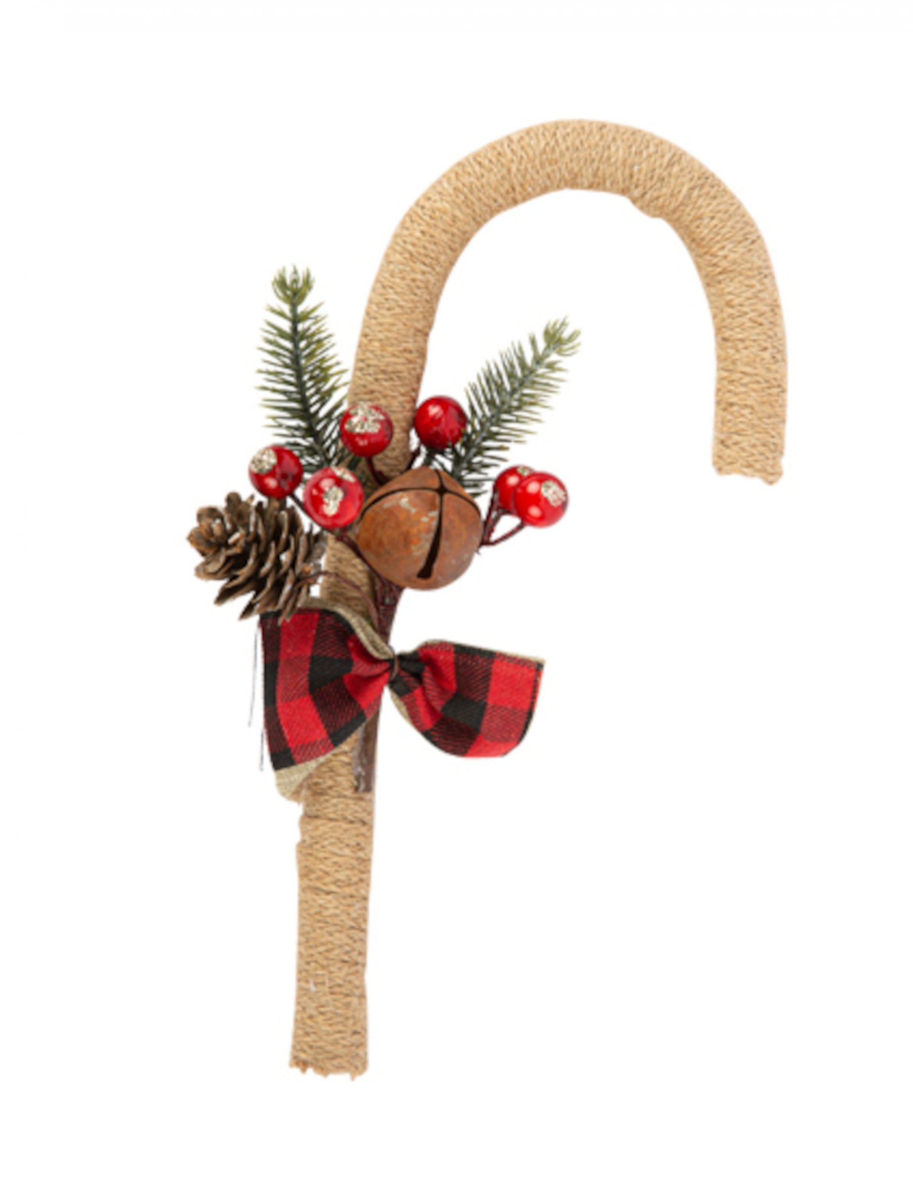 S to visečo svetilko iz jute dimenzij 12 x 23 vnesite v svojo notranjost naraven pridih. cm približno. Ima obliko sladkorni trs Bež barve, očarljivo okrašena z borovim storžem, rdečimi jagodami in jelkovimi listi. Rdeč in črn karo trak dopolnjuje ta rustikalni slog. sladkorni trs je idealen dodatek za popestritev vaše dekoracije Božič v duhu tradicionalno in toplo.