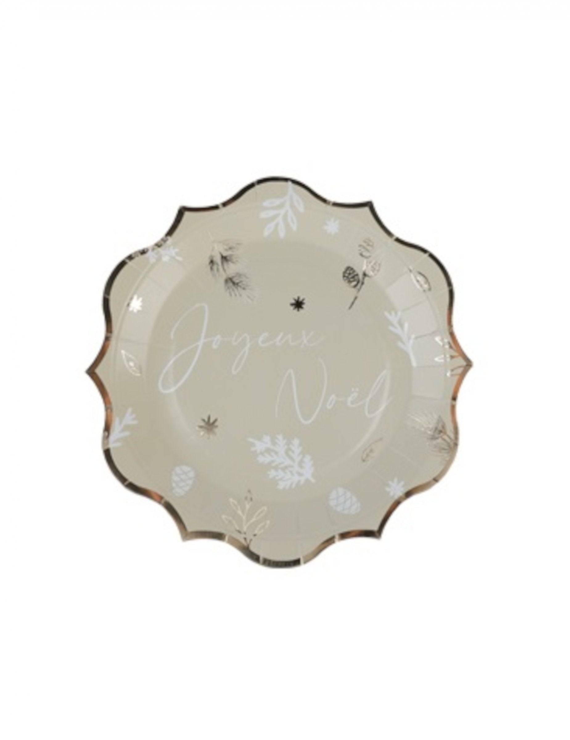 Ta komplet 8 krožniki Izdelana iz kartona, bo vašemu sprejemu dodala pridih elegance. Vsak kos meri 23 cm Ponuja prefinjeno sivo-zeleno barvo, ki jo poudarjajo kovinsko beli okraski, ki prikazujejo veje in storže. Omemba Vesel božič je nežno centriran, obdan z izklesanim robom z zlatimi zaključki. Je idealna izbira za temo Božič osredotočeno na narava.