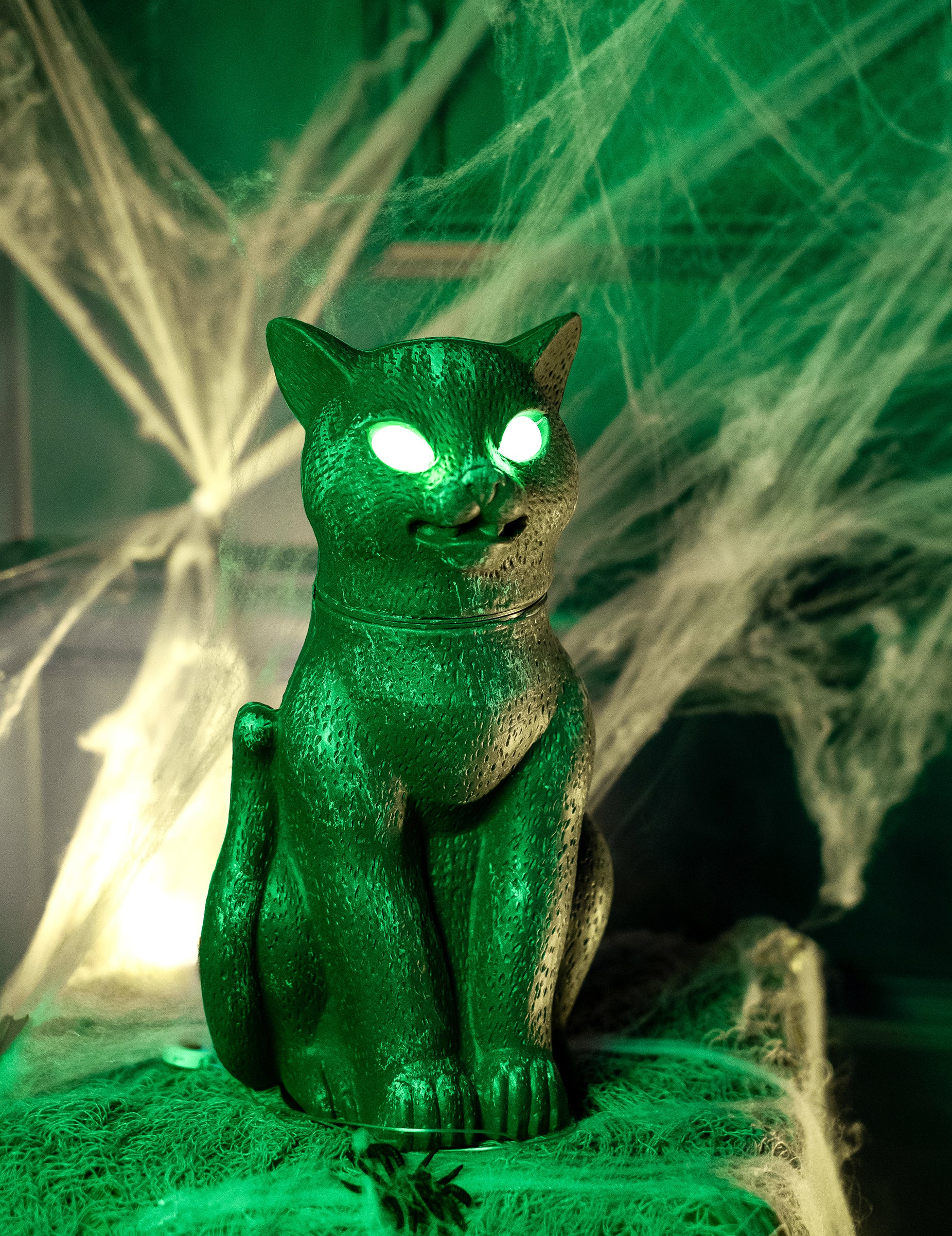 Ta zvočna in svetla črna mačka meri približno 30 cm visoko. Preprosto ga morate vklopiti tako, da se mu glava obrne in oči se svetijo v zeleni barvi. Za še bolj zastrašujočo stran ta mačka potisne zavijanje. Ta dekoracija deluje z uporabo 3 aa baterij, ki niso vključene. Ta črna mačka bo kot nalašč za dokončanje vaše grozljive dekoracije ob večernem večeru!