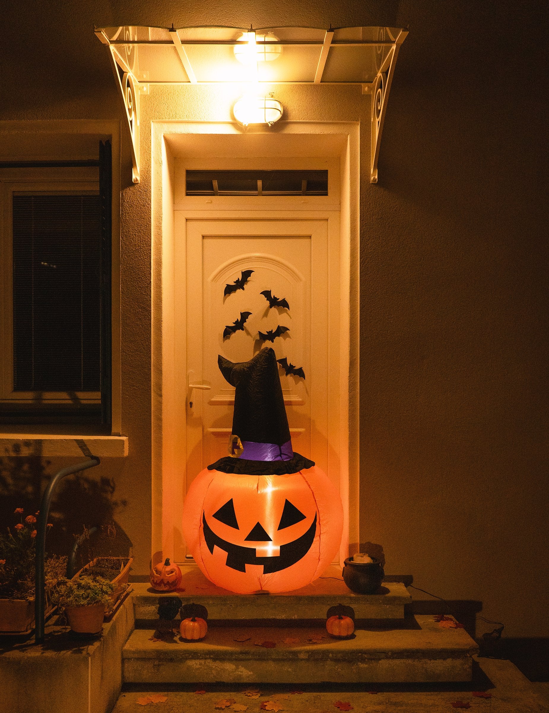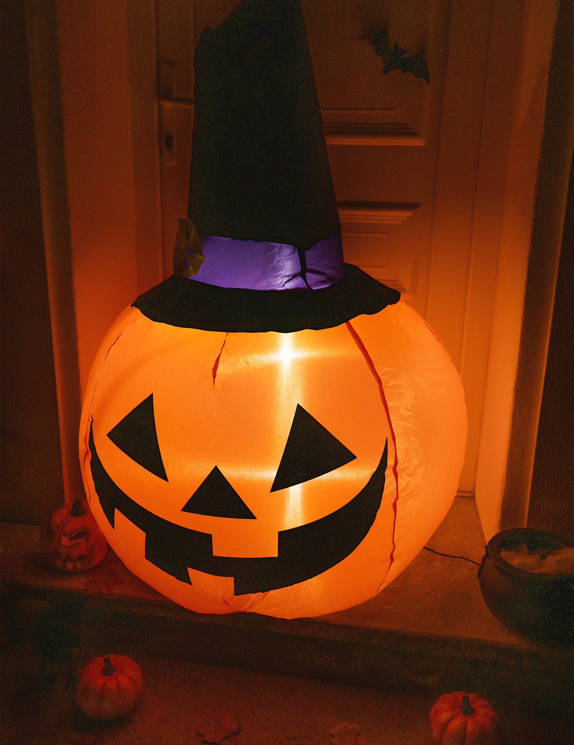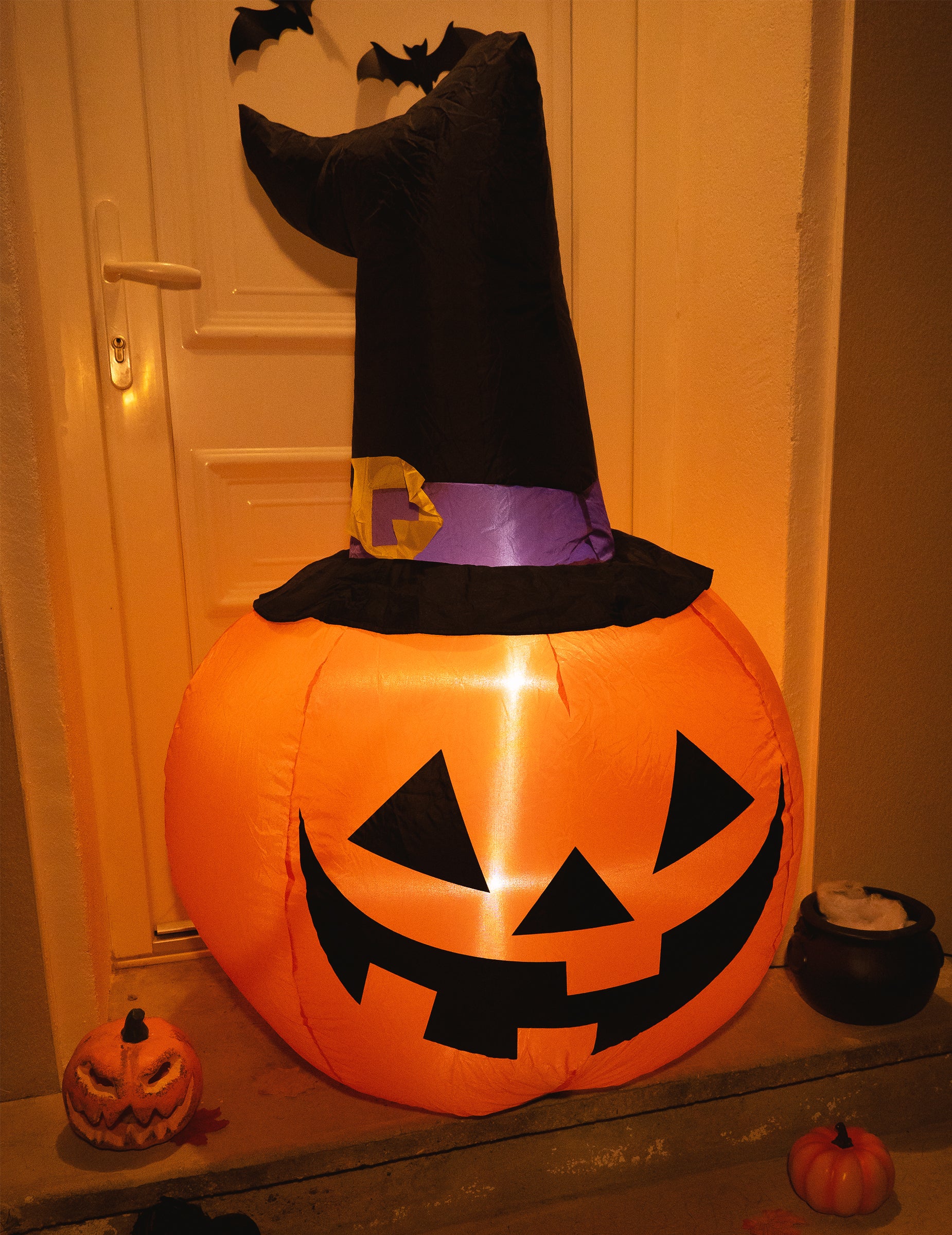 Ta svetlo napihljiva buča meri 120 cm višine, dolga 70 cm in široka 70 cm. Zasnovan je v najlonu. Predstavlja oranžno bučo s črnim obrazom in čarovniškim klobukom na vrhu. Klobuk je črn z vijoličnim trakom in zlatim kvadratom. Ta lahka buča bo idealna za dokončanje vaše zunanje dekoracije za naslednje praznovanje čarovnic!