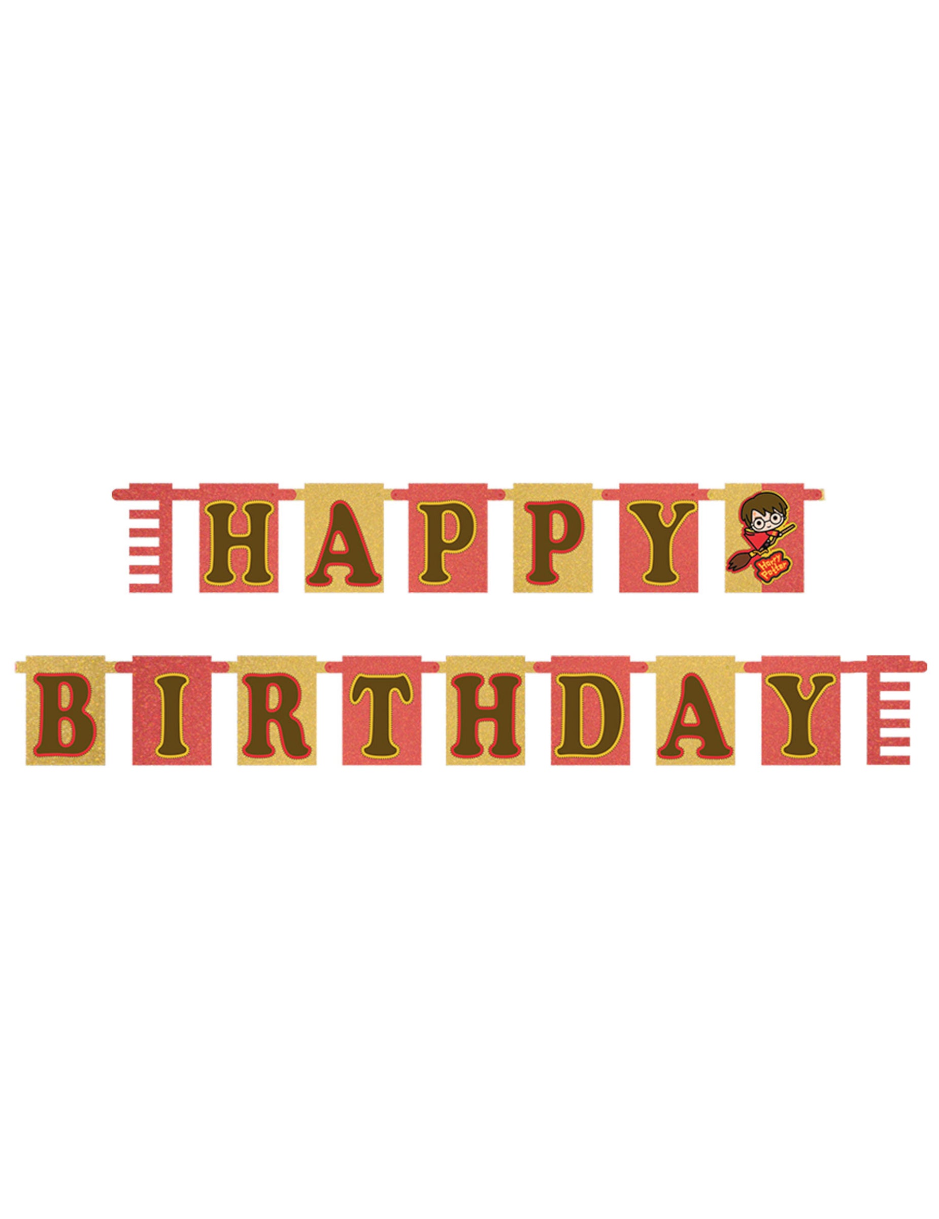 Ta kartonski garland za rojstni dan je pod uradnim licenco Harry Potter. Ta girlanda meri približno 180 cm in je sestavljen iz 14 zastavic s črkami, ki tvorijo sporočilo "Happy Birthday", in ponazoritev slavnega čarovnika vajencev na njegovi metli Quidditch. Ta lepa girlanda bo kot nalašč za dopolnitev dekoracije za rojstni dan na temo Harry Potter.