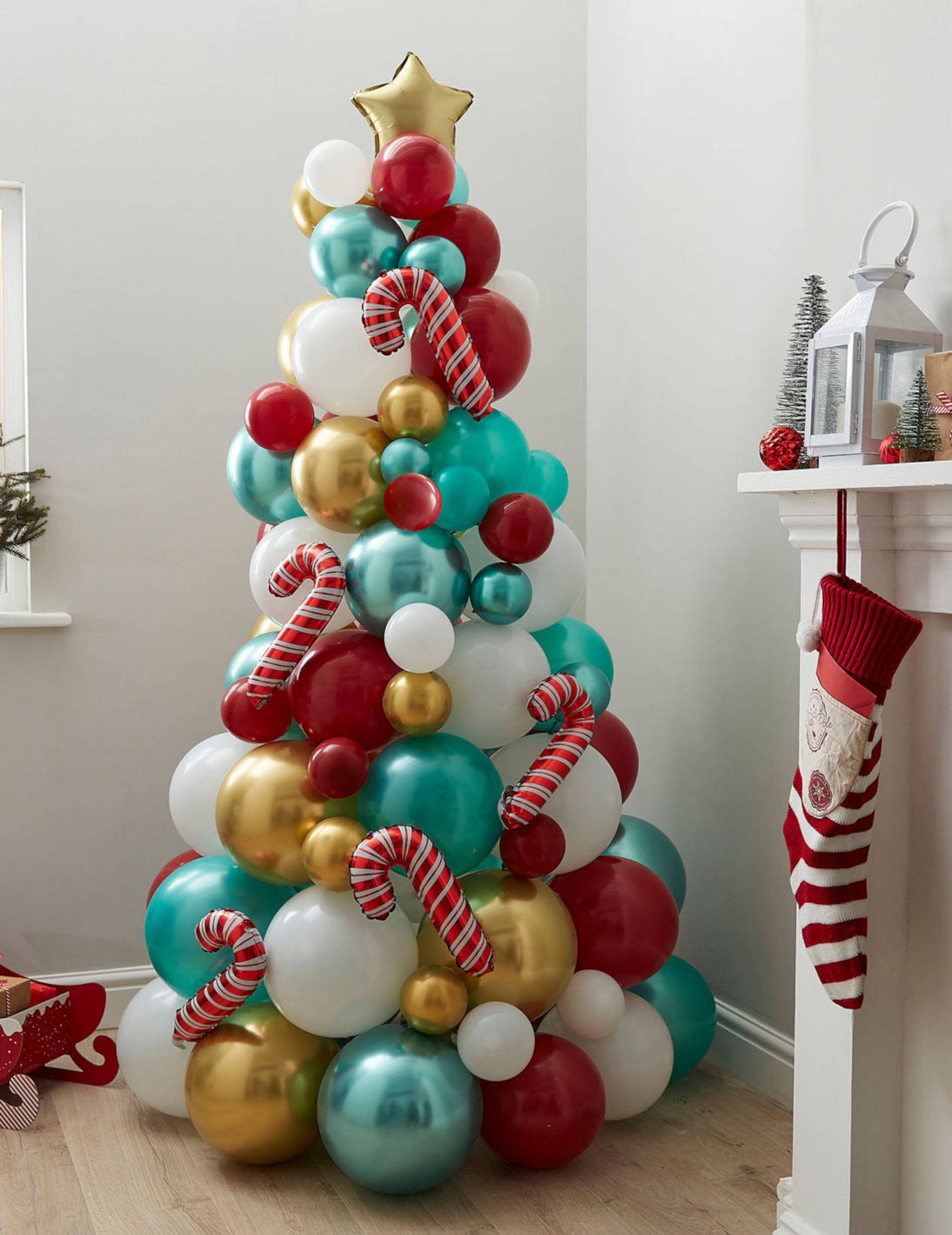 Božično drevo iz rdečih, zelenih in zlatih balonov s sladkorno palico 180 cm