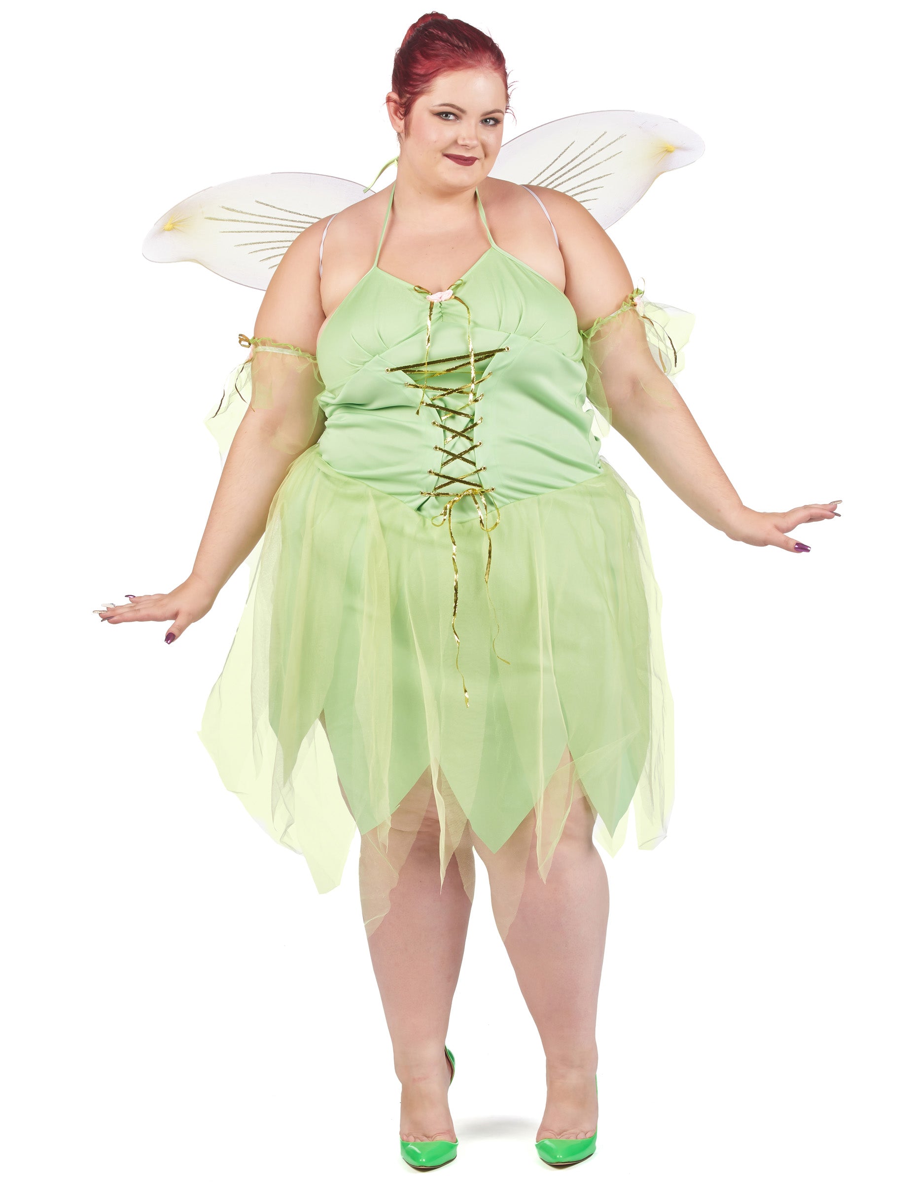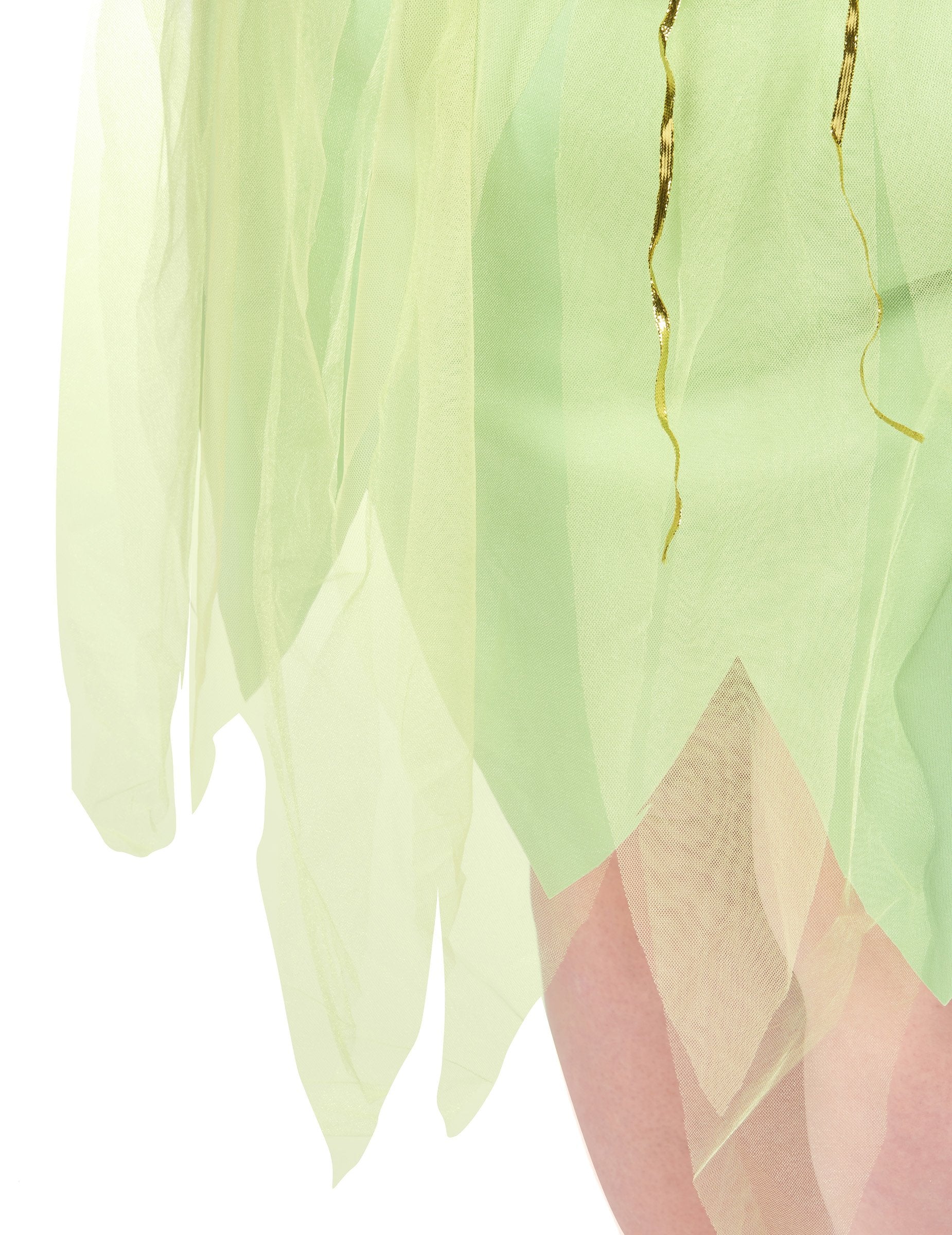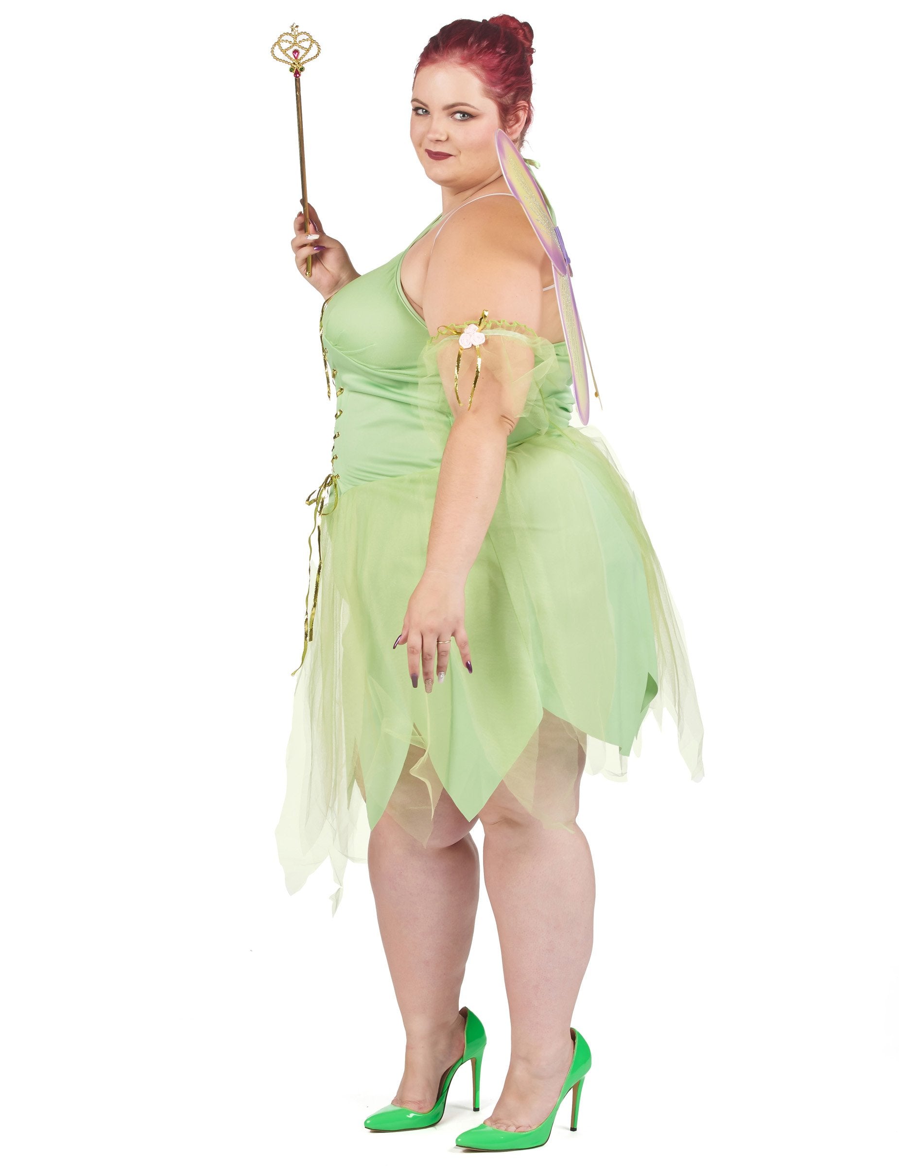 Ta velik seksi vilinski kostum je namenjen ženskam. Sestavljen je iz obleke, par kril in dveh zapestnic. Obleka preobleke je zelena barva na celotni barvi. Zanj je značilna lepa odprtina na zadnji strani, zlahka pritrjena okoli vratu. Na zadnji strani boste našli zadrgo. Obleka je okrašena z nastavljivim steznikom z zlatim trakom. Majhne vrtnice se neposredno širijo z obleko v rokah, zapestnicami, pa tudi na vratu. Kar zadeva dno obleke, jo bo značilno sijoče tančice. Krila sestavljajo tudi isto tančico, ki jo spremljajo bleščice. Krila so pritrjena kot nahrbtnik, z majhno belo elastiko. Ta pravljični kostum bo idealen za izpopolnjevanje vašega tematskega večera, kot so karneval, novo leto ali za šolsko predstavo!
