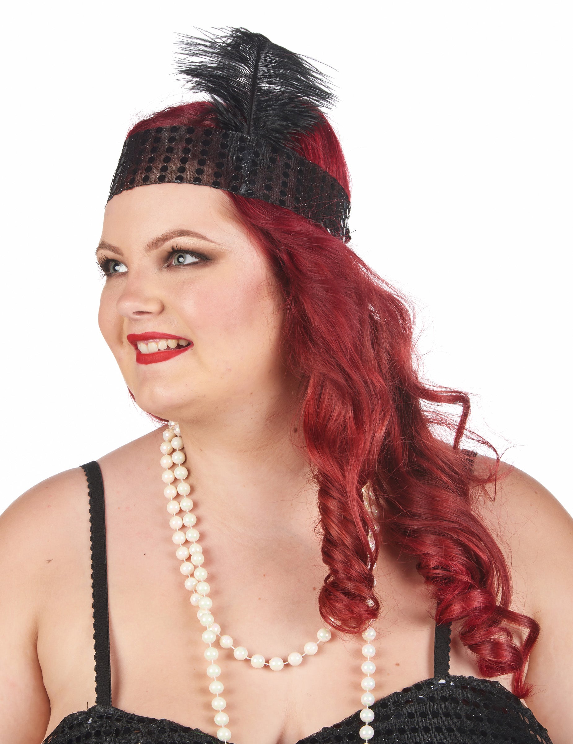 Bleščeč naglavni trak je okrašen s črnim peresom.