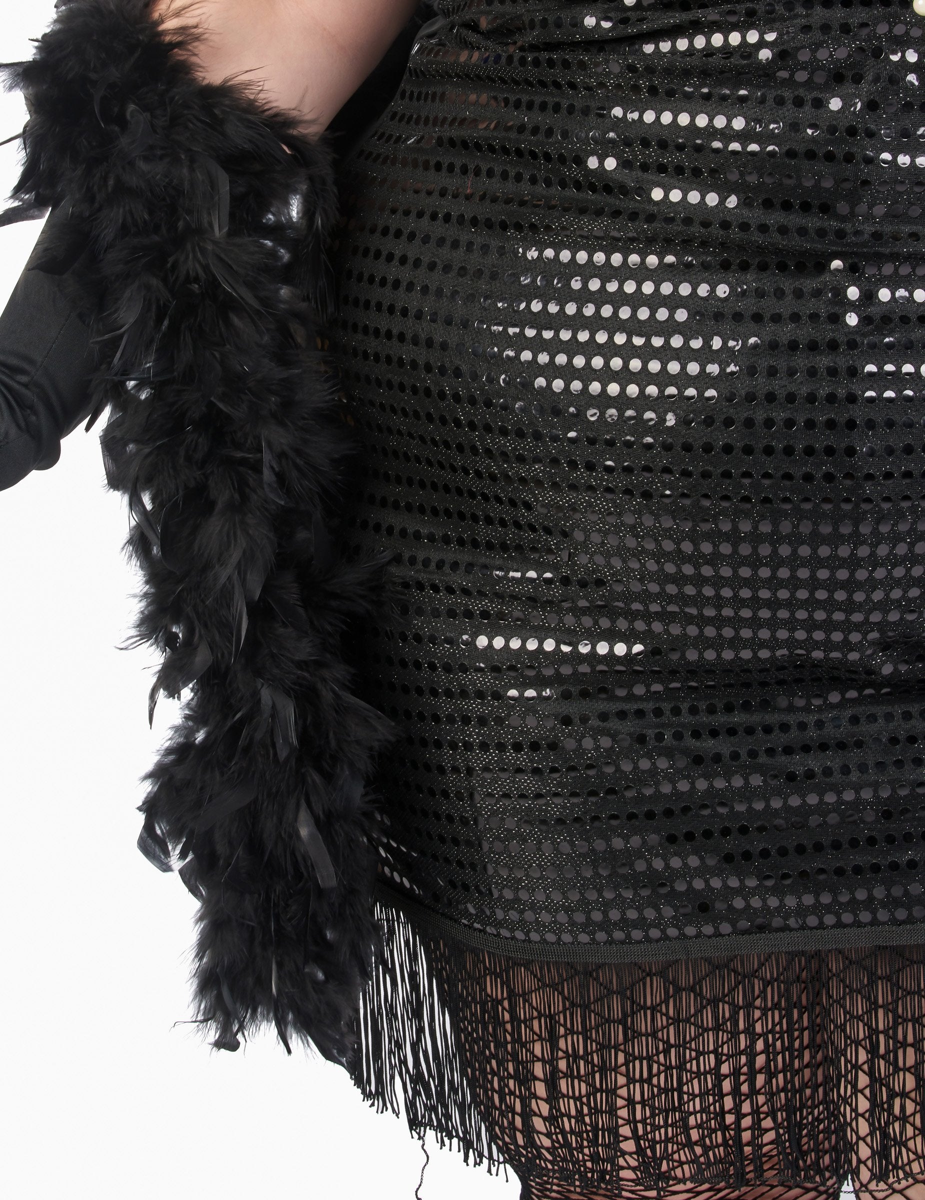 Obleka srednje dolžine je v celoti črna. Ima sijoč satenast učinek z bleščicami in resicami na spodnjem delu.