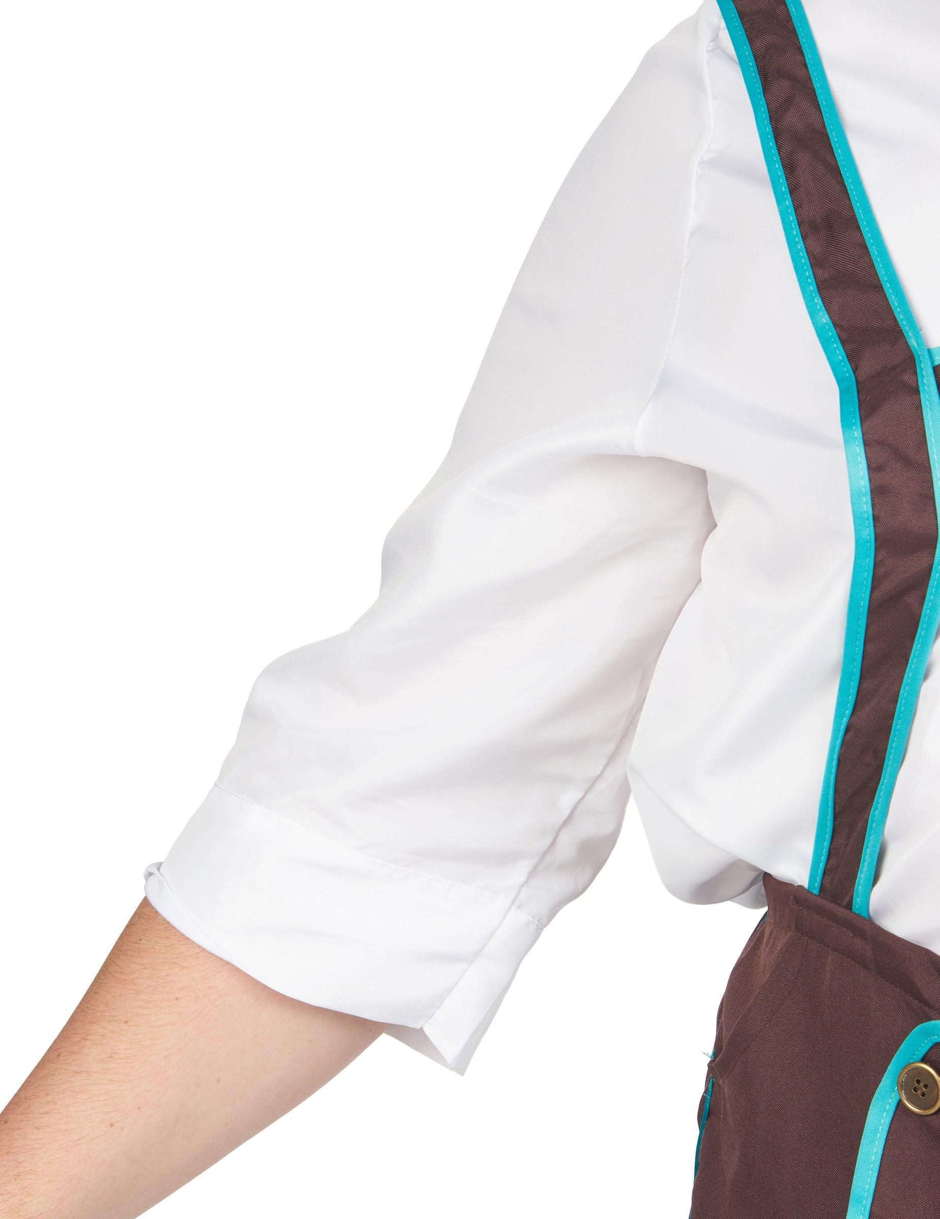 Ta bavarska bavarska na splošno je za odrasle. Vključuje kombinezone, vrh in klobuk. Kombinizoni so rjave barve in nosi zeleno obrobo. S kratko dolžino bo prišel nad kolena in ga krasili vzorci na zgornjem delu. Na voljo je bela majica, ki lahko gre s celoto. Končno bo rjavi klobuk dokončal vašo bavarsko obleko! Ta preobleka bo kot nalašč za vaš večer na temo festivala piva!