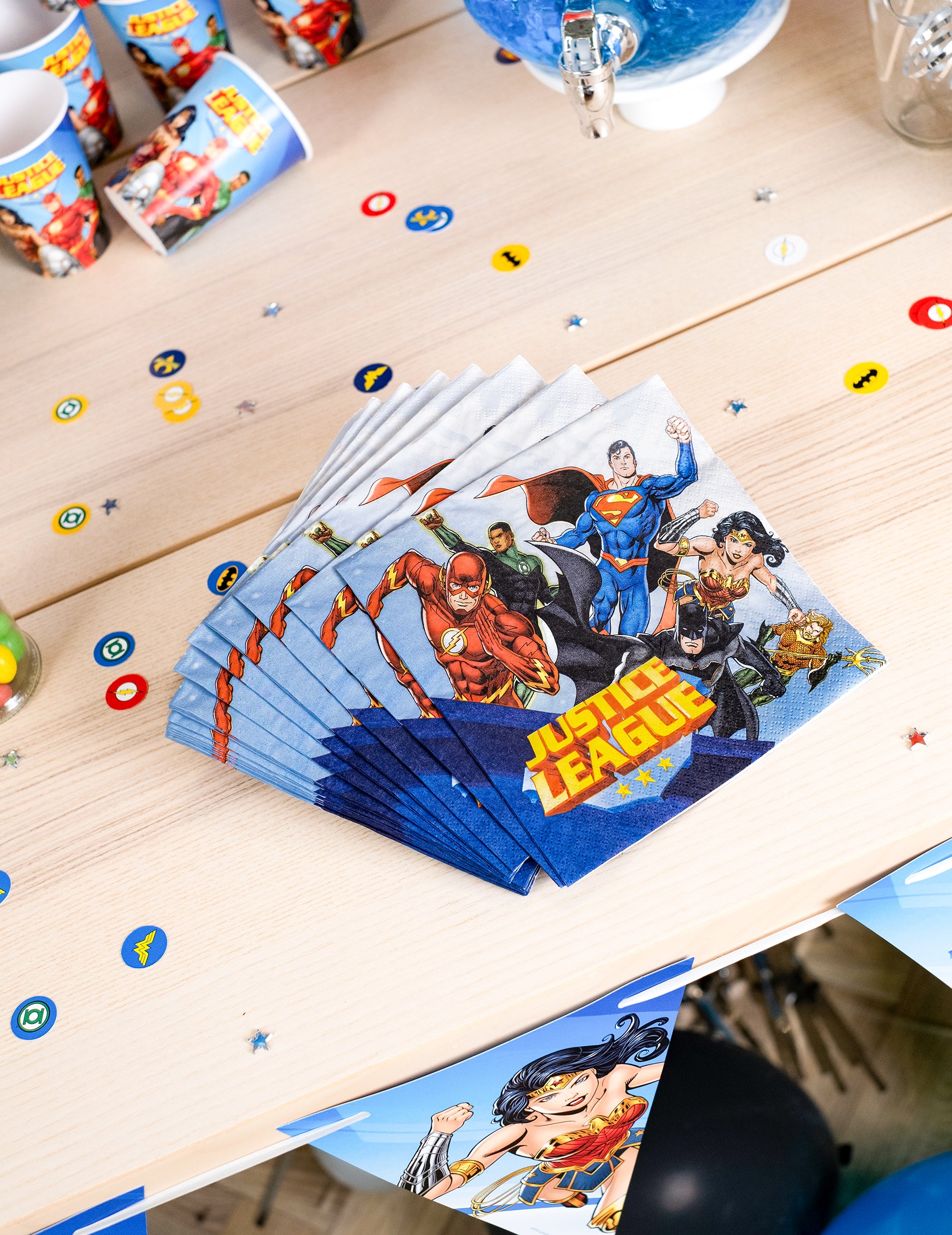 Ta sklop je sestavljen iz 20 brisač po uradni licenci Justice League. V papirju vsaka brisača meri približno 33 x 33 cm. Vsi bodo okrašeni z motivom znanih vigilantov, kot so slavni Flash, Superman, Wonder Woman, Batman ali Green Lantern! Te brisače bodo idealne za izpopolnjevanje dekoracije mize ob rojstnem dnevu na temo superjunakov!