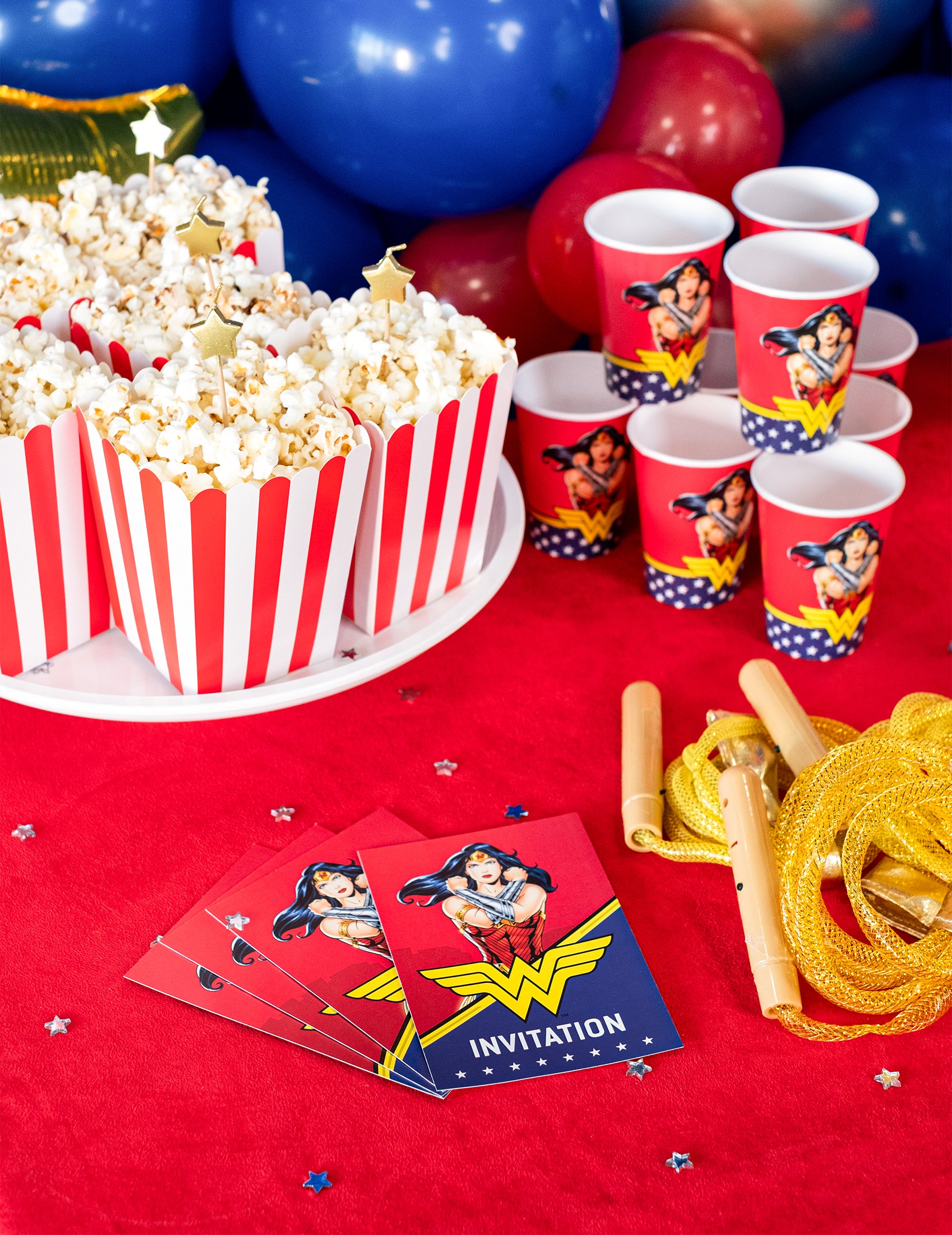 Pod uradno licenco Wonder Woman ta sklop vključuje osem kartonskih vabilnih kartic dimenzij 10 x 16 cm. Na voljo je z ovojnicami. Te vabilne kartice bodo otroku omogočile, da povabi svoje prijatelje na prigrizek za rojstni dan ali na katero koli drugo zabavo na temo Wonder Woman!