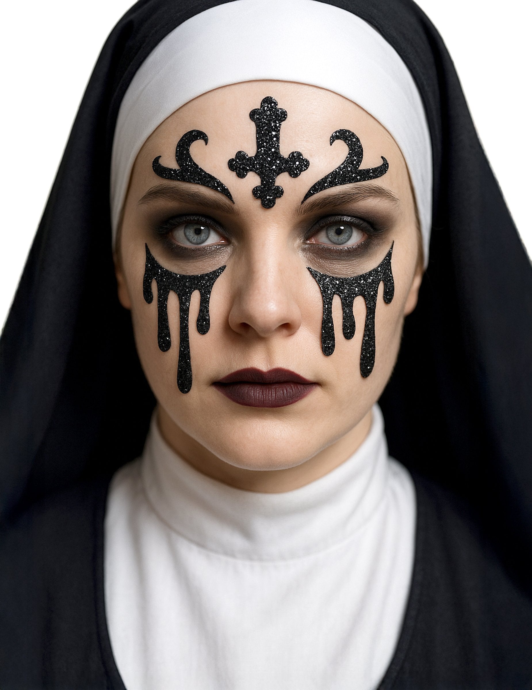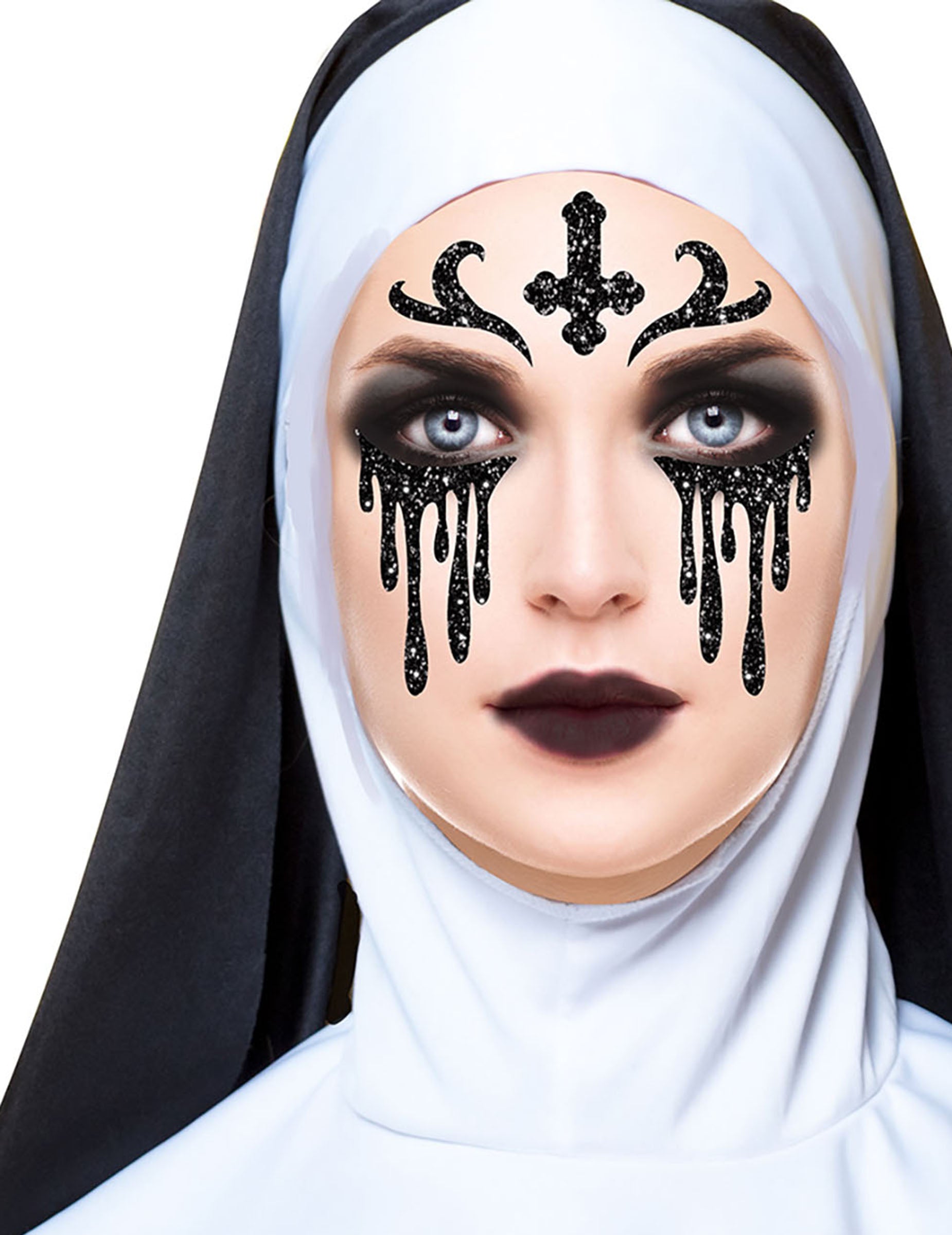 Ta tetovaža Black Nun Glitter je namenjena odraslim. Predstavlja solze na licih, pa tudi križno glavo na čelu. Vsi elementi so črni in obarvani v barvi. Ta ličila bo kot nalašč za dotikanje glamuroznega dotika vaše obleke za noč čarovnic!