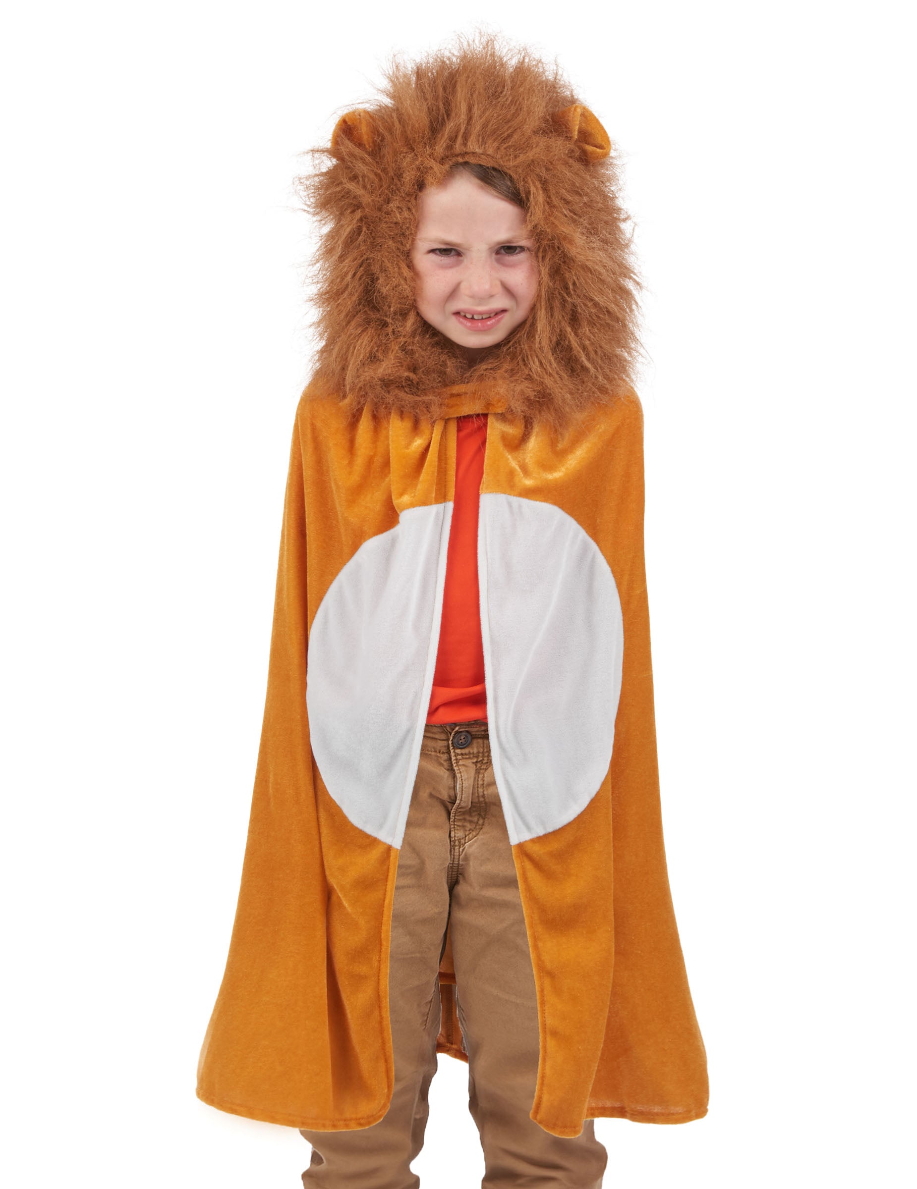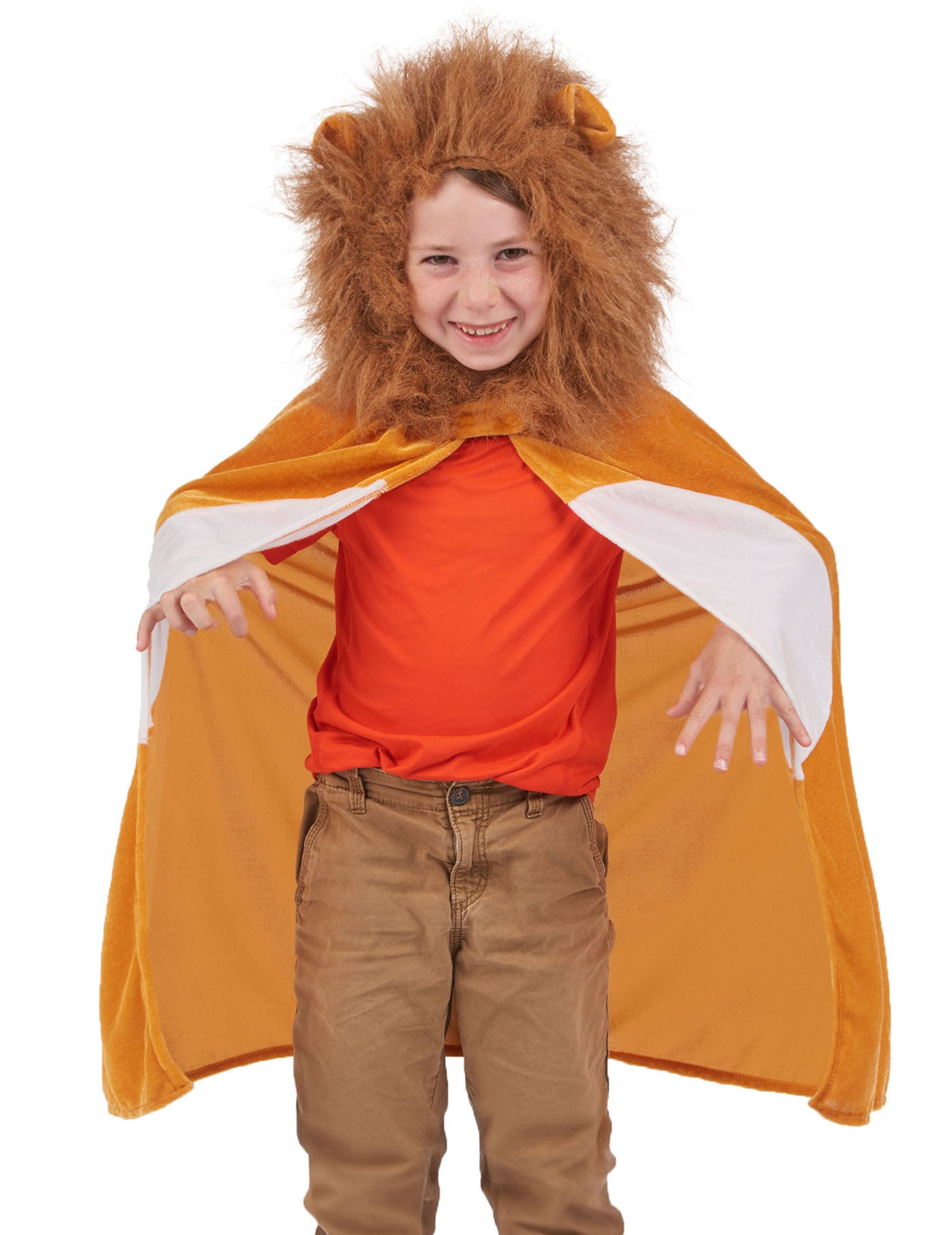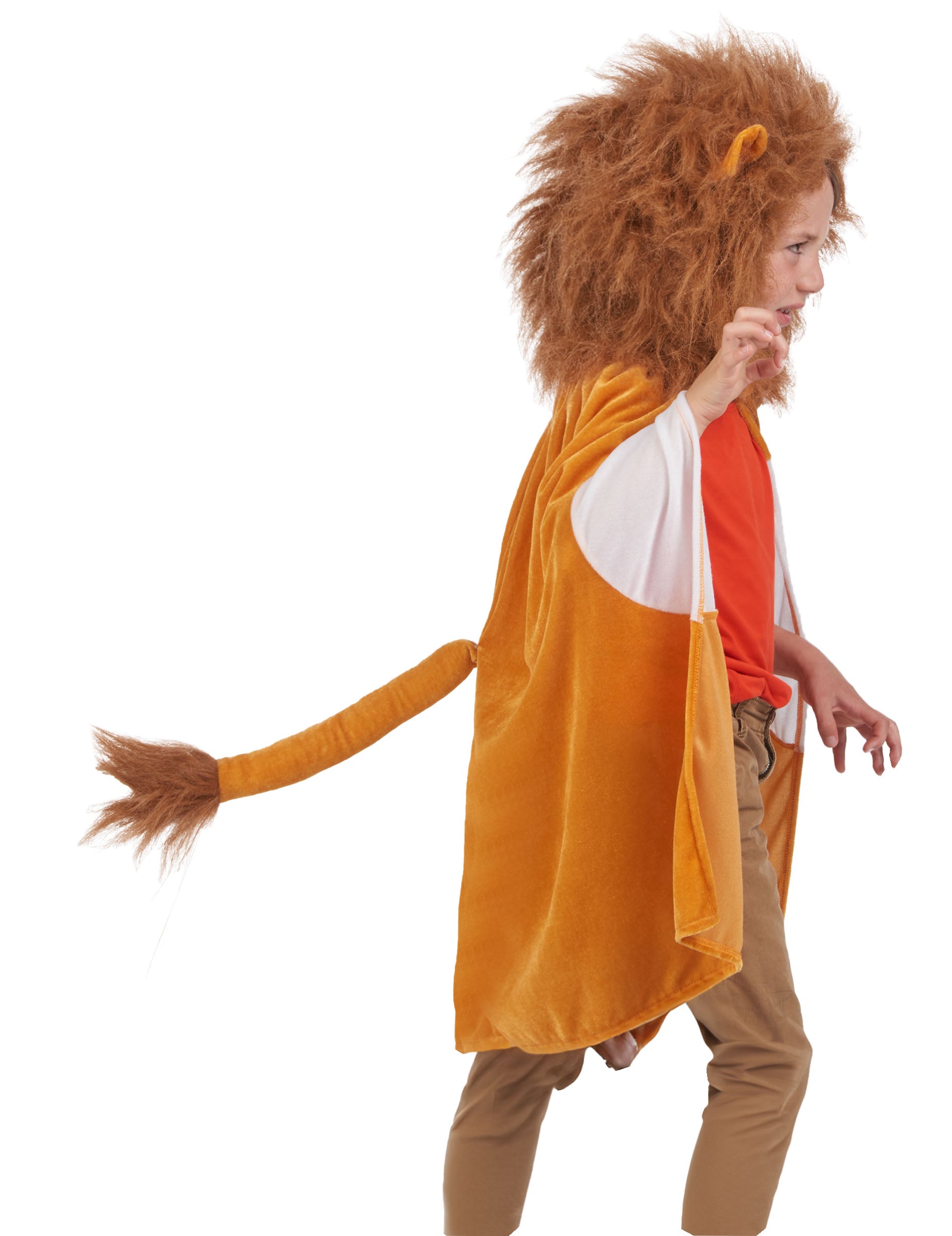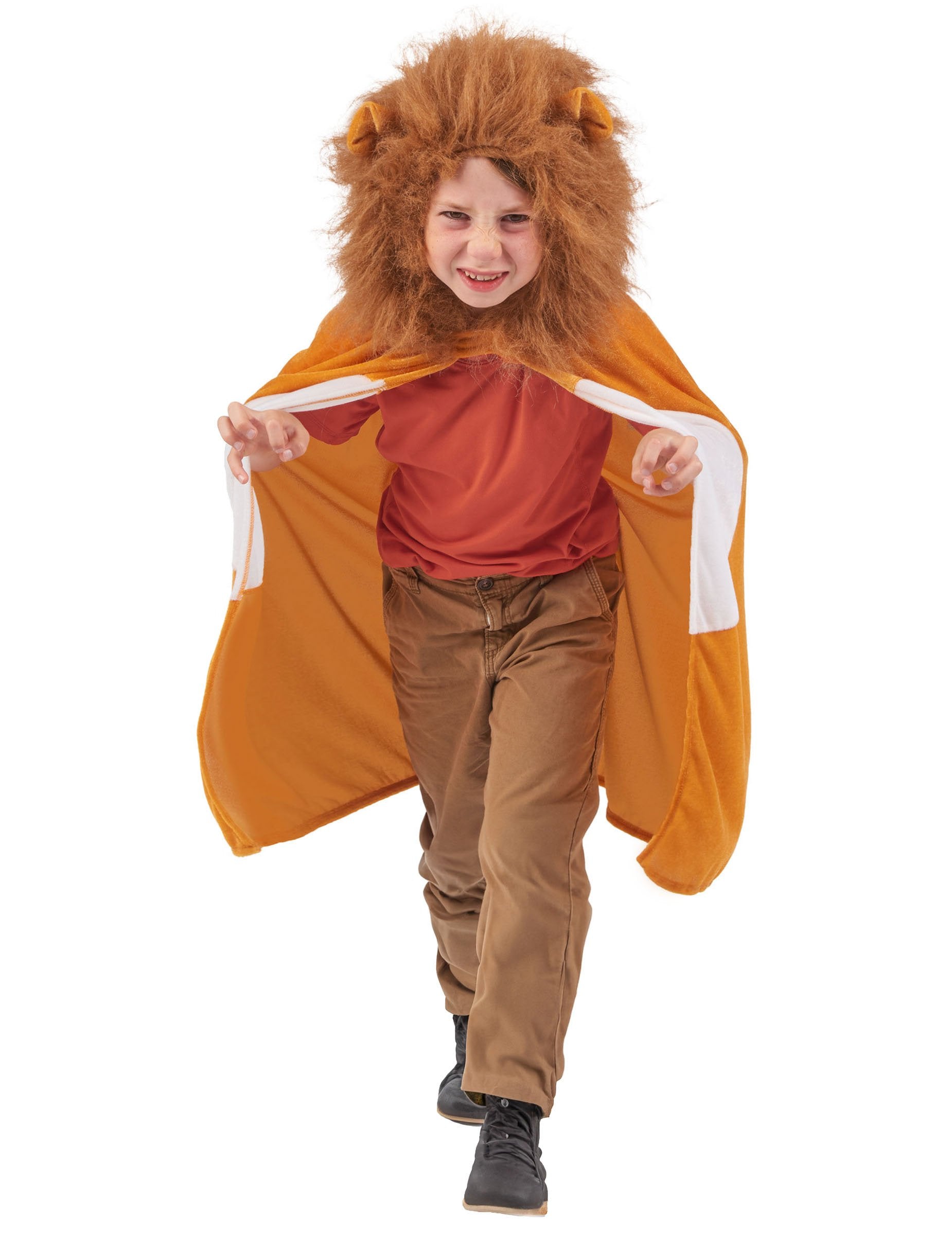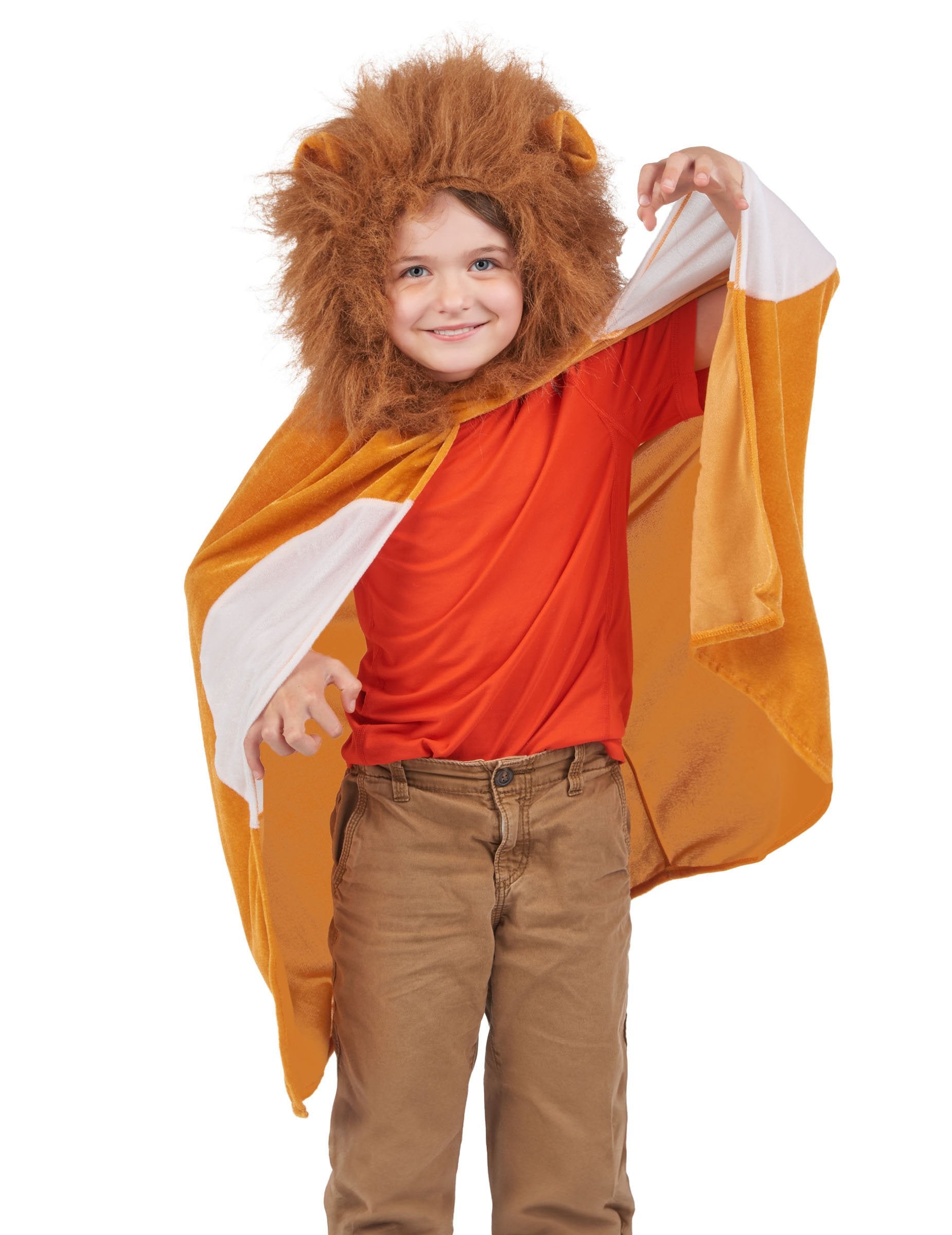 To preobleko predstavlja levji rt, namenjen otrokom. Oglje z žametnim učinkom je v barvi na voljo s pokrovom, okrašenim z veličastno zlato lažno grivo, kjer si lahko ogledate tudi par ušes. Zaprite se zahvaljujoč praske, ki je prisotna na ravni ovratnika. Na zadnji strani tega leva je rep, okrašen z lažnim krznom, ki najbolje predstavlja kralja džungle. Ta levji orig bo kot nalašč za večer na temo živali, na temo Savane ali za karneval.