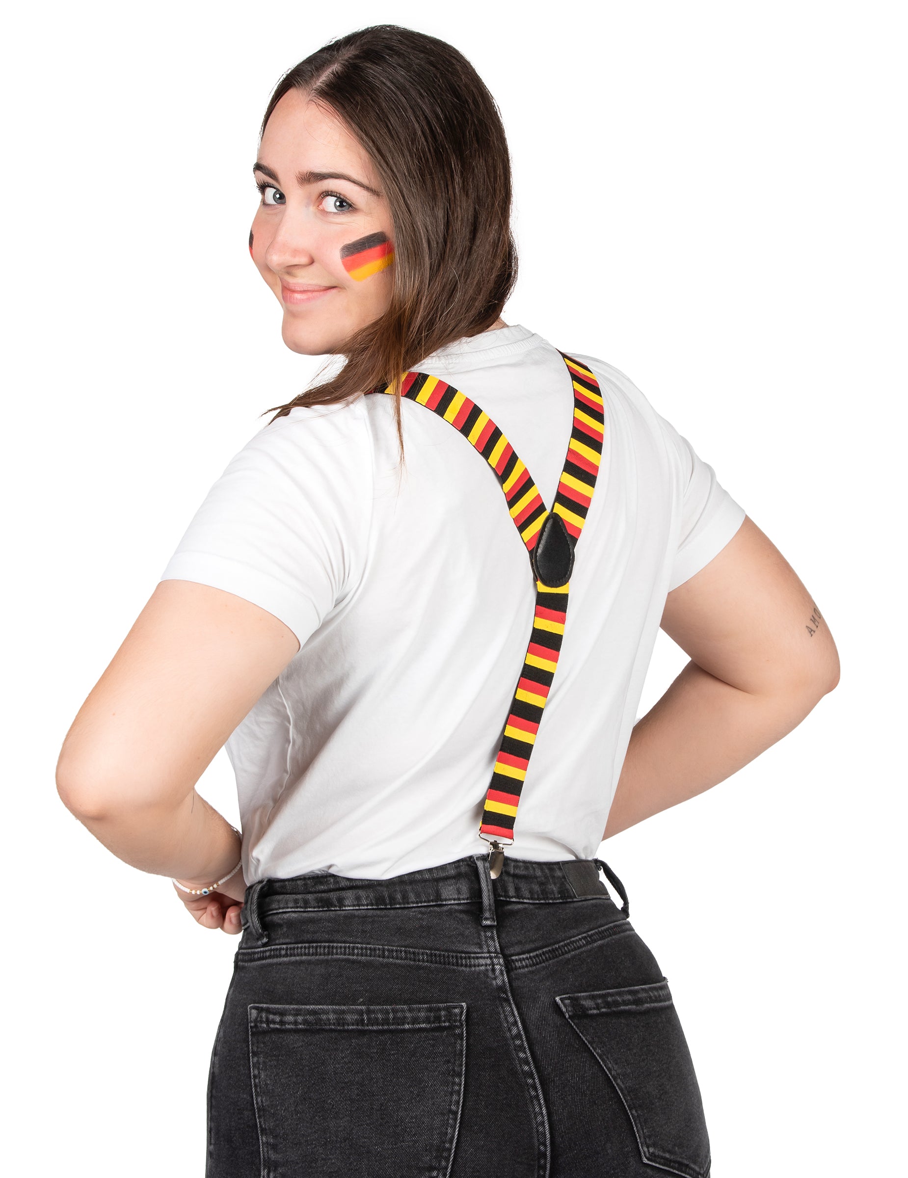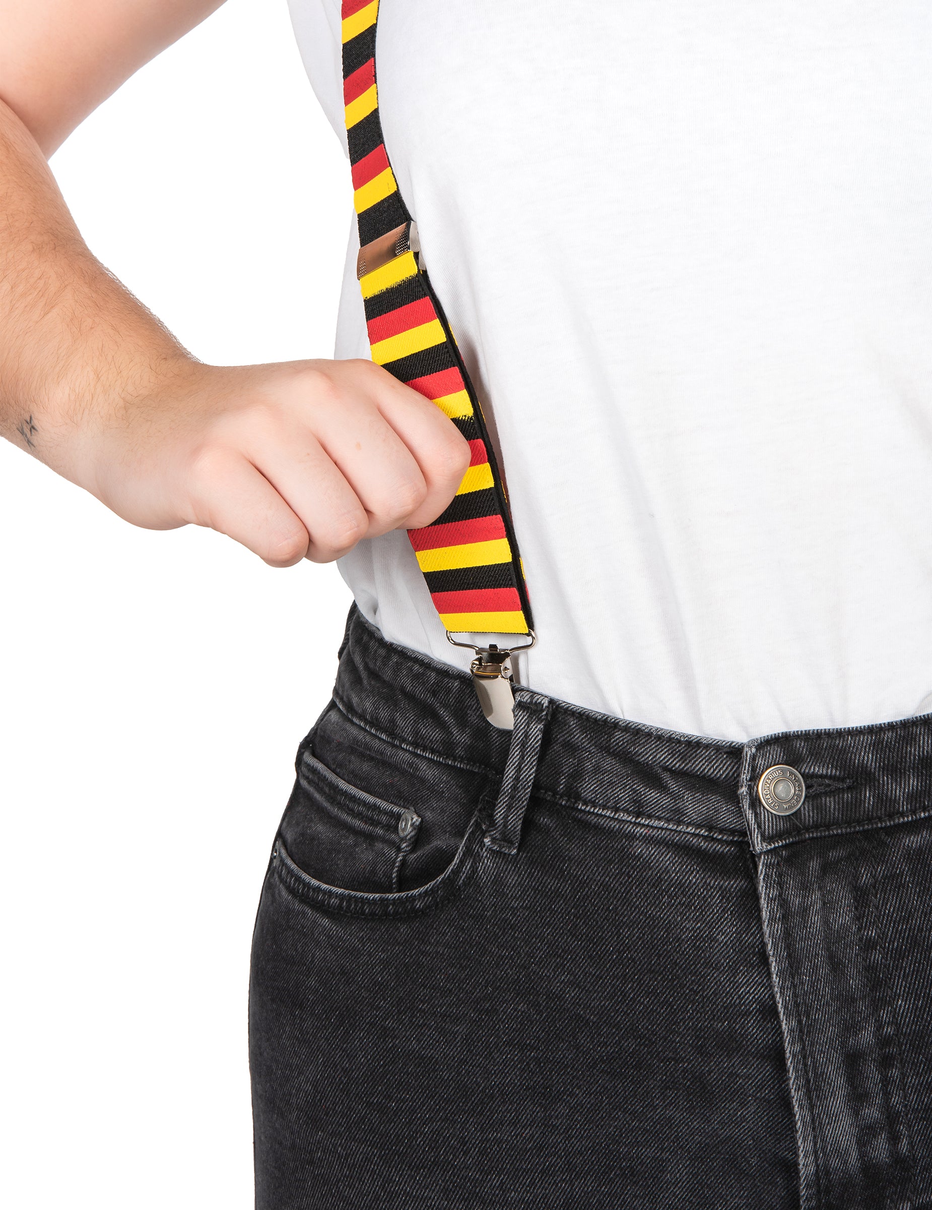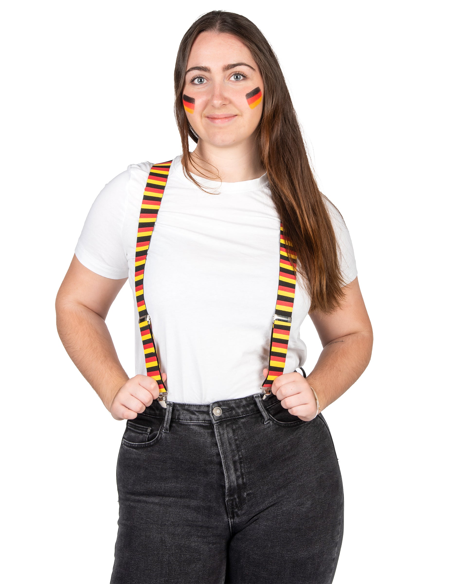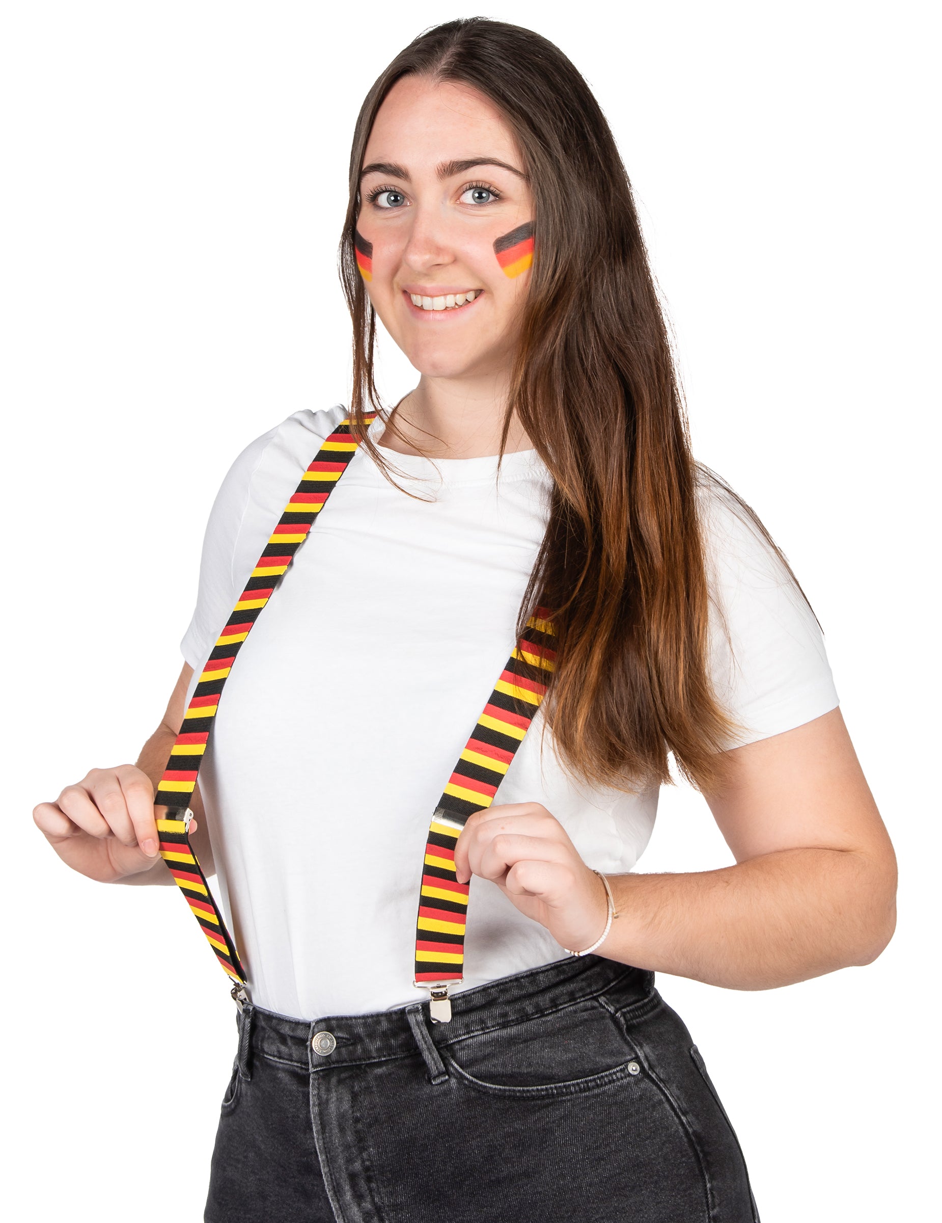 Ti nemški trakovi so za odrasle. So z izlivom nemške zastave s črno, rdečo in rumeno barvo. Vezi vam bodo omogočile, da jih enostavno pritrdite na hlače. Nosite te obešalnike za celoten videz podpornikov med športnimi tekmovanji, kot so nogometni svetovni pokal ali olimpijske igre!