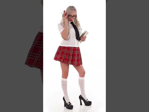 Ta prikrita šolarka je namenjena ženskam in je sestavljena iz majice, kravate, krila in 2 vozlov. Kravata je kratka in bela barva. Je upognjena v velikosti. Na sprednji strani ima gumbe, da ga lahko enostavno zaprete. Krilo je zloženo in rdeče. Okrašena je z različnimi ploščicami, ki spominjajo na šolsko obleko. Črna kravata in lok za lase bosta v tej obleki prinesla končni pridih. Ta celoten kostum šolarke bo kot nalašč za vaše tematske večere!
