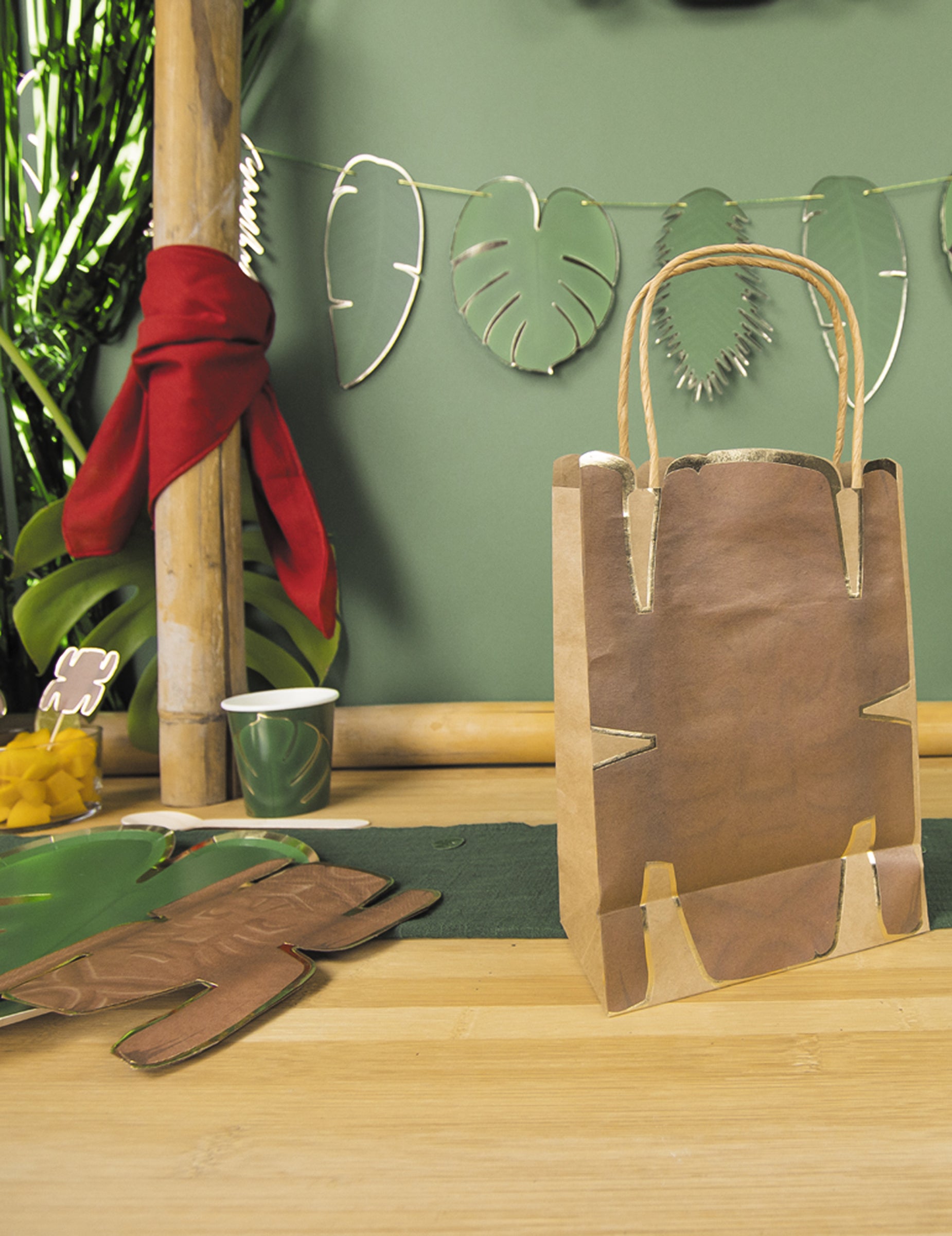 Ta komplet vsebuje 4 totem papirnate vrečke Namenjene so mladim raziskovalcem. kraft papirnate vrečke 28,5 x 15 cm Opremljeni so z dvema ročajema za lažje prenašanje. Odlikuje jih eksotičen totemski dizajn v rjavih in zlatih tonih. majhne darilne vrečke so idealne za zavijanje priboljškov ali igrač za razdeljevanje med rojstni dan na temopustolovščina.