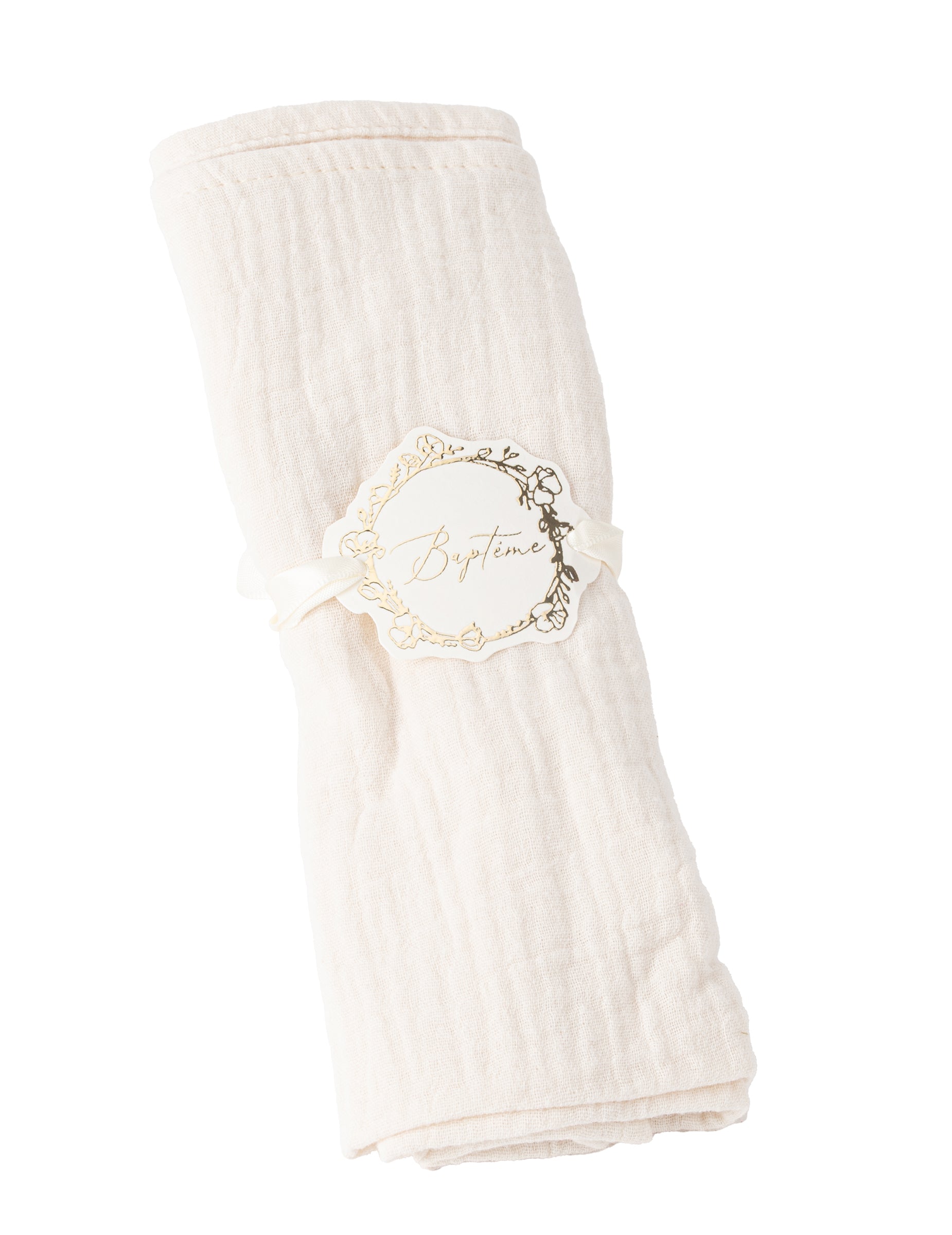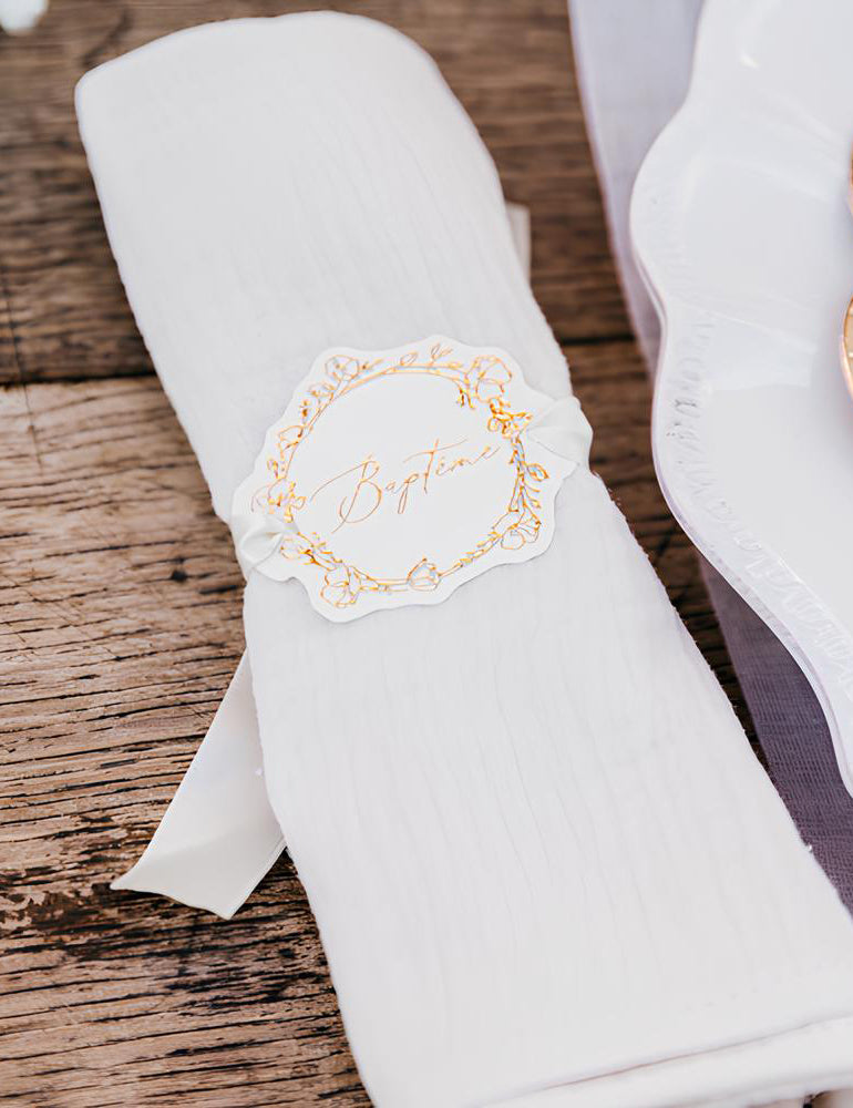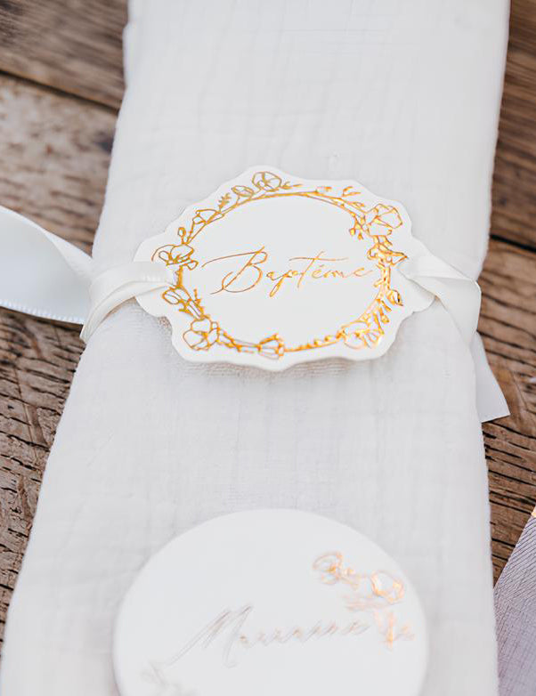 Izboljšajte svojo mizo s tem kompletom, ki vključuje 10 obročki za prtičke kartonske škatle s približno 5 cm premera in kremnega satenastega traku. V umazano belem odtenku imajo vzorec cvetoč okrožnica, kot tudi omemba krst z zlatimi črkami. Ta komplet je idealen za popolno vzdušje tematske zabave cvetlični Ali Zlata.