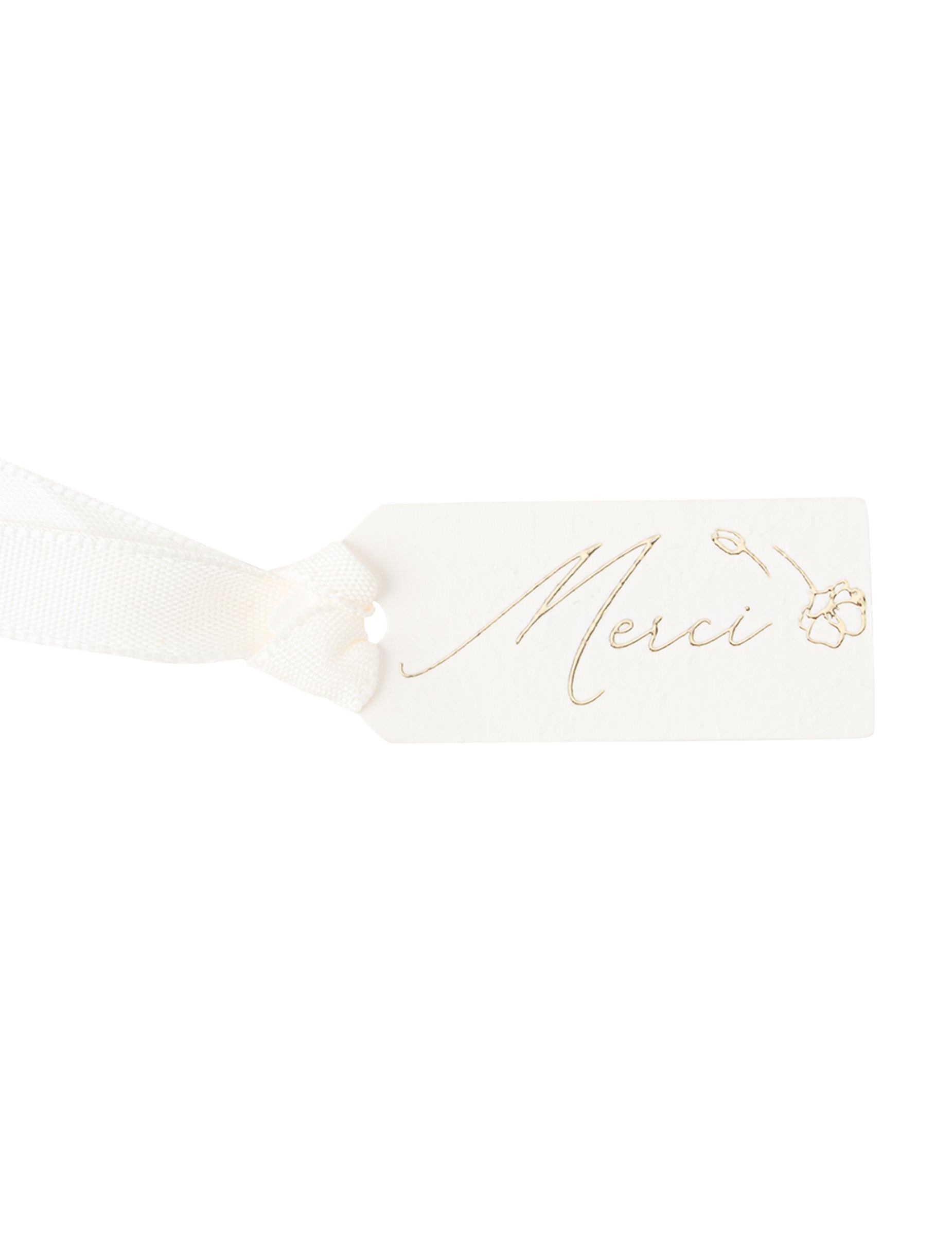 Ta komplet vsebuje 10 kartonskih etiket velikosti 5 x 2 cm. Ti pravokotni beli nosilci nosijo napis HVALA z zlatimi črkami, okrašena z dvema lepima rože Ujemanje. Kravato je enostavno narediti z elegantnim kremnim satenastim trakom. To je prefinjena izbira za izkazovanje hvaležnosti med poroka, A krst ali praznovanje rojstnega dne.