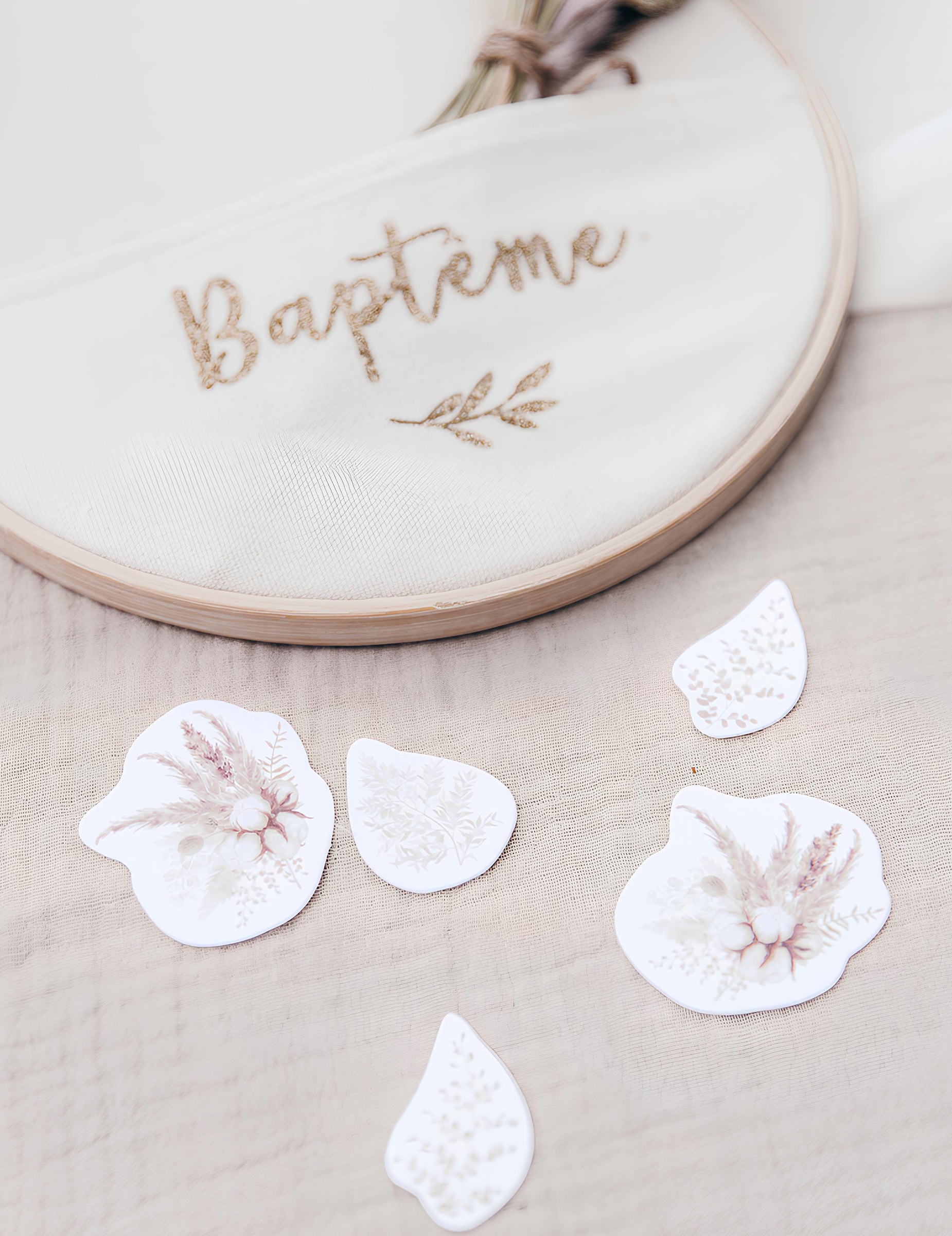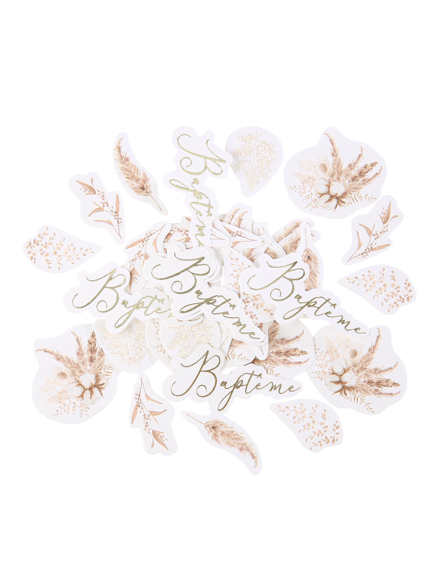 Okrasite svoj sprejem s tem kompletom 100 kosov namizni konfeti teme. Ta mešanica kartonov vsebuje motive lovilca sanj, oranžnih rož in besede krst Napisano z živahnimi zlatimi črkami. Ti elementi so kot nalašč za polepšanje mize na tematski zabavi. cvetlični.