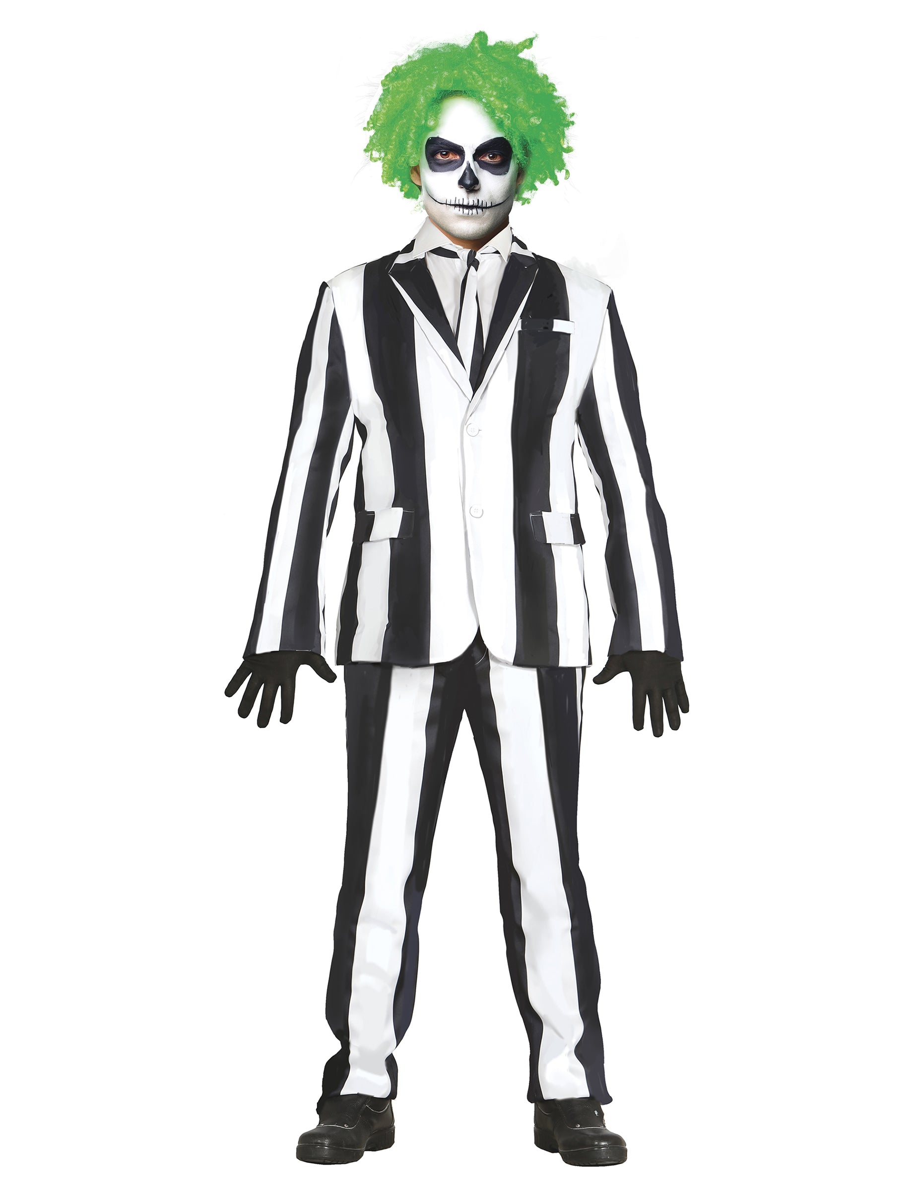 Ta črno-bel črtast kostum za duha večje velikosti za odrasle vključuje suknjič, hlače in kravato. Ta kostum izstopa s črno-belimi navpičnimi črtami, ki ponujajo takoj prepoznaven videz najbolj norega duha v kinu. Jakna z dolgimi rokavi je opremljena z dvema gumboma spredaj za enostavno zapenjanje in je okrašena z umetnimi žepi za realističen in uglajen slog. Ujemajoče se hlače so oblikovane tako, da zagotavljajo udobno prileganje, hkrati pa ohranjajo eleganco izrazitih črt. Obleko dopolnjuje črno-bela kravata, ki daje piko na i temu srhljivemu in šik kostumu. Idealen za zabave ob noči čarovnic ali kakršen koli modno oblečen dogodek, bo ta kostum večje velikosti zagotovo povzročil občutek s svojim ikoničnim in izvirnim slogom!