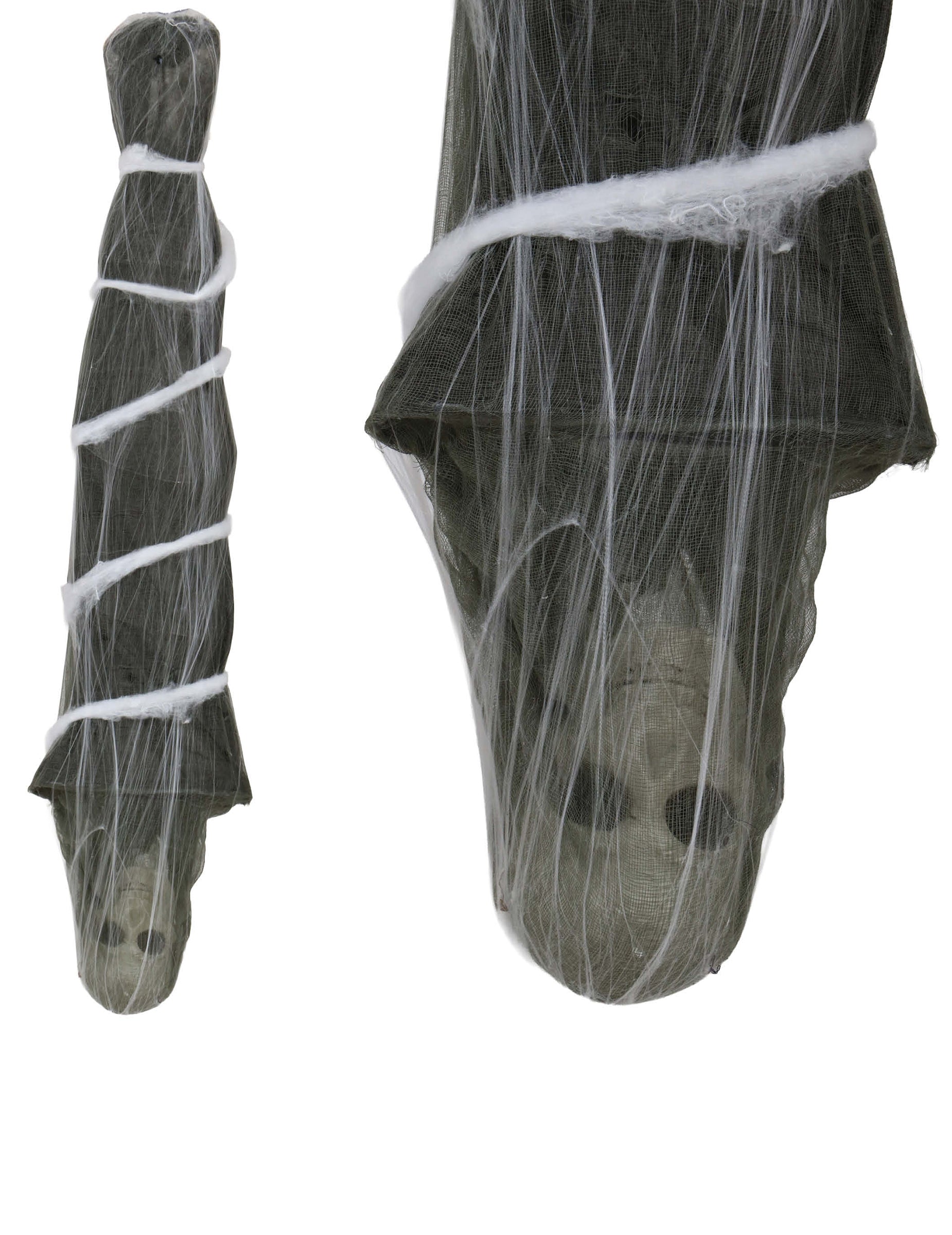Ta svetleča viseča dekoracija mumija meri približno 75 cm. Izdelan je iz poliestra in PVC-ja, ima realistične podrobnosti in svetlobne učinke (baterije niso priložene) za strašljiv učinek. Mumija je ovita v povoje, ki ji dajejo pristen in grozljiv videz. Previdni detajli in integrirane luči pomagajo ustvariti skrivnosten ambient. Enostaven za obešanje, lahko ga postavite na različne lokacije za optimalen vizualni učinek. Kot nalašč za noč čarovnic, zabave z egipčansko tematiko ali dogodke v hiši straši, bo ta svetleča mumija dodala dramatiko vašemu dekorju, še posebej, če jo obesite na temnem mestu, da poudarite njen sijoč učinek.