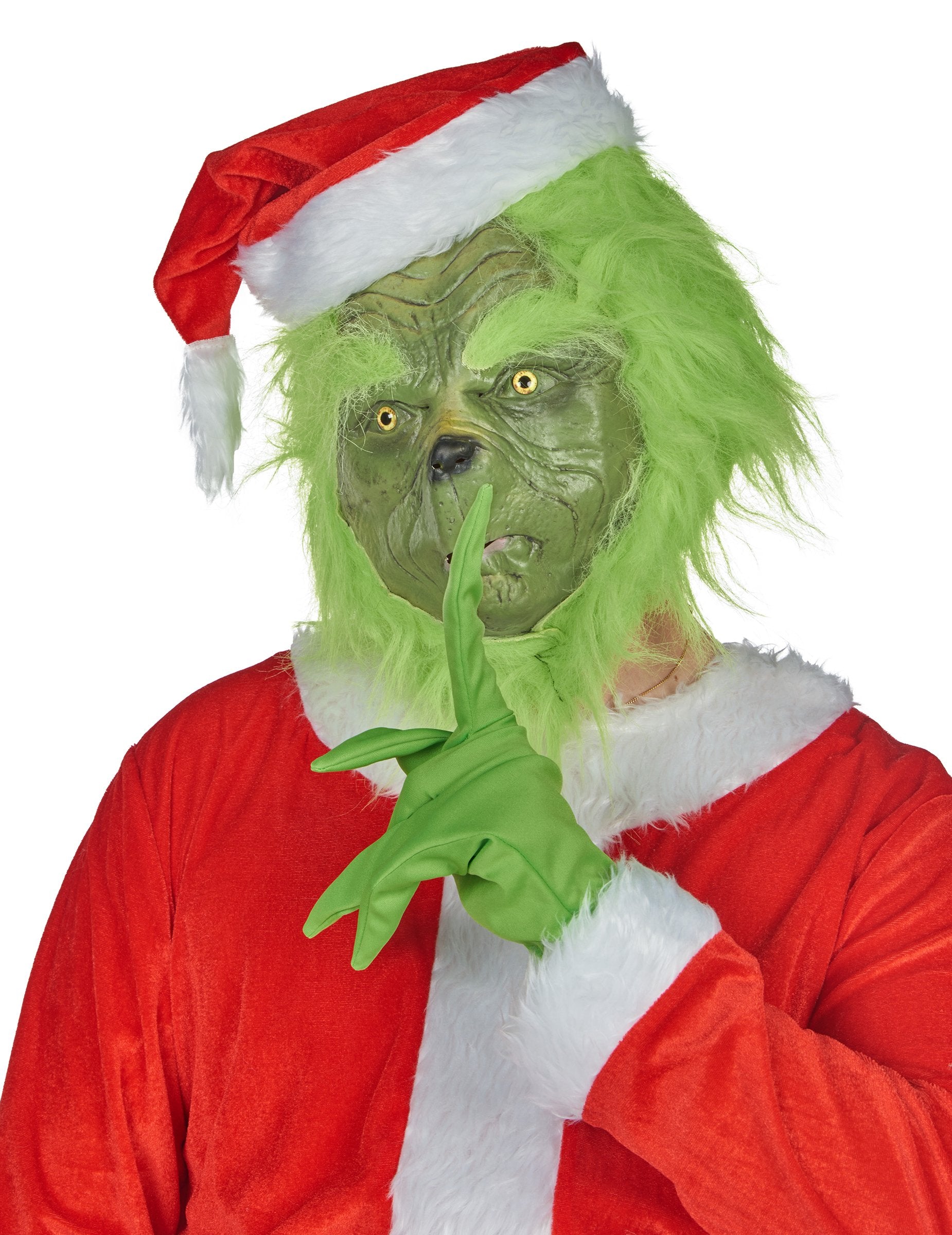 Podaljšane zelene rokavice popolno posnemajo dolge in ukrivljene prste lika, medtem ko rdeče-bela božična kapa doda zaključni praznični pridih tej nepozabni preobleki.