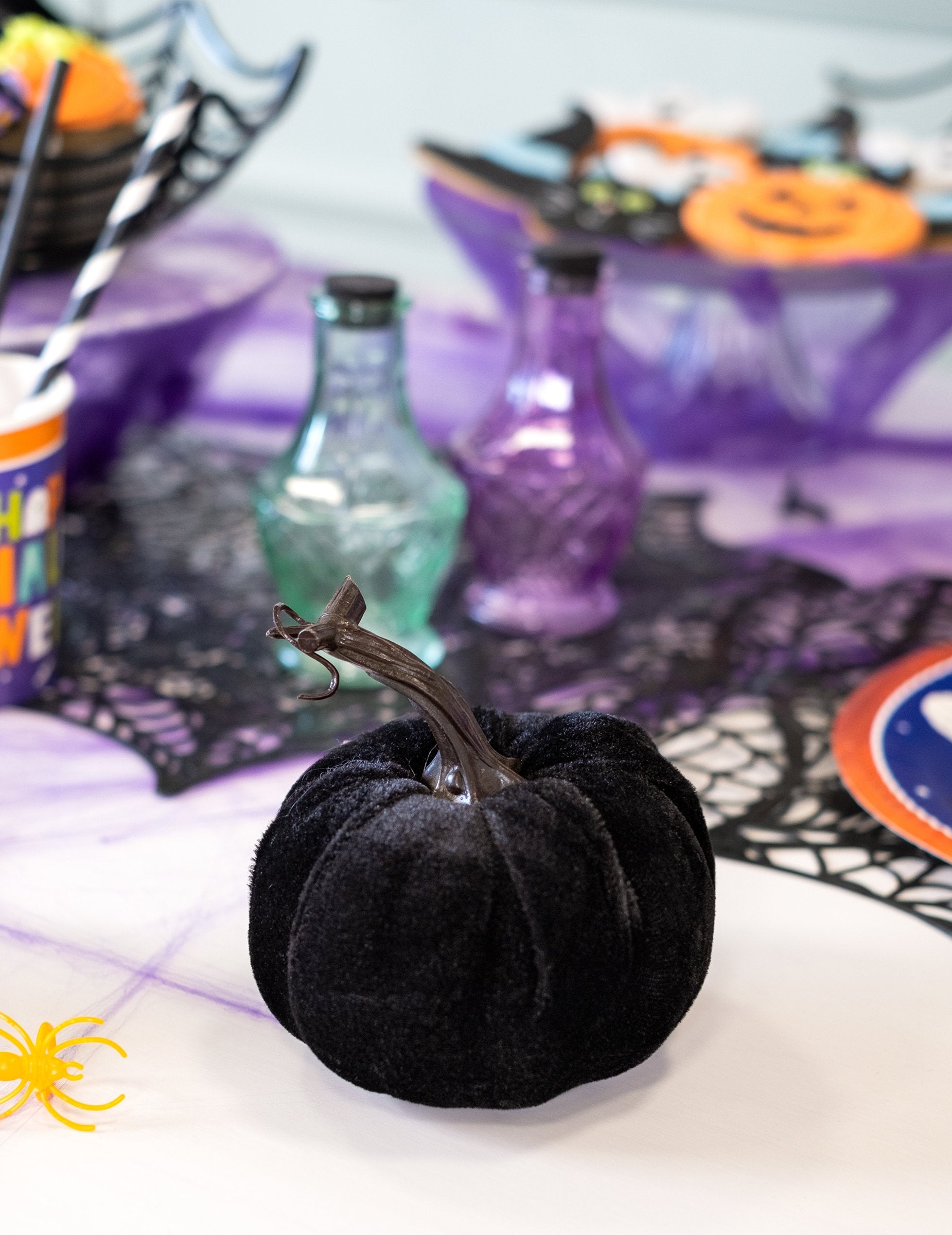 Ta dekoracija predstavlja veliko bučo. Meri približno 10 cm, zanj je značilen žametni material, ki mu daje eleganten in svilnat videz. Prav tako je okrašen z velikim steblom, ki ga lahko odstranite ali ne glede na vaše udobje. Ta buča bo idealna za okrasitev vaše sobe za noč čarovnic!