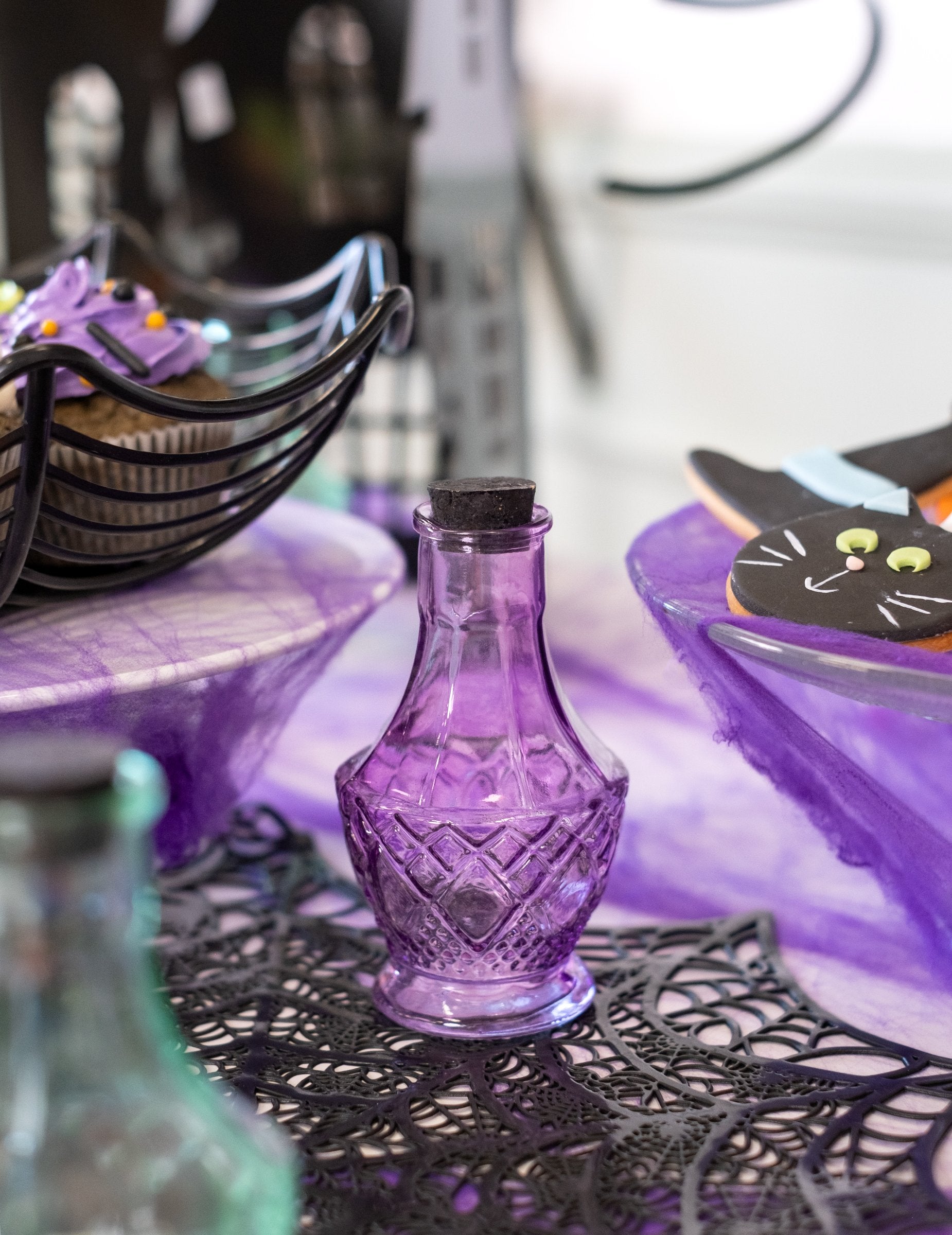 Ta steklena viala meri 6,5 cm premer in 11,5 cm Visoka je in se ponaša z vijoličnim odtenkom. Majhen, rustikalen črn plutovinast zamašek tesno zapre steklenico, zaradi česar je idealna za shranjevanje mističnih napojev. Ta vijolična steklenička je odlična kot osrednji okras ali dodatek v čarovniškem laboratoriju. S to majhno stekleničko dodajte kanček čarovnije svoji zabavi za noč čarovnic. Popolna je za ustvarjanje očarljivega vzdušja na vaših prazničnih ali nočnih srečanjih.