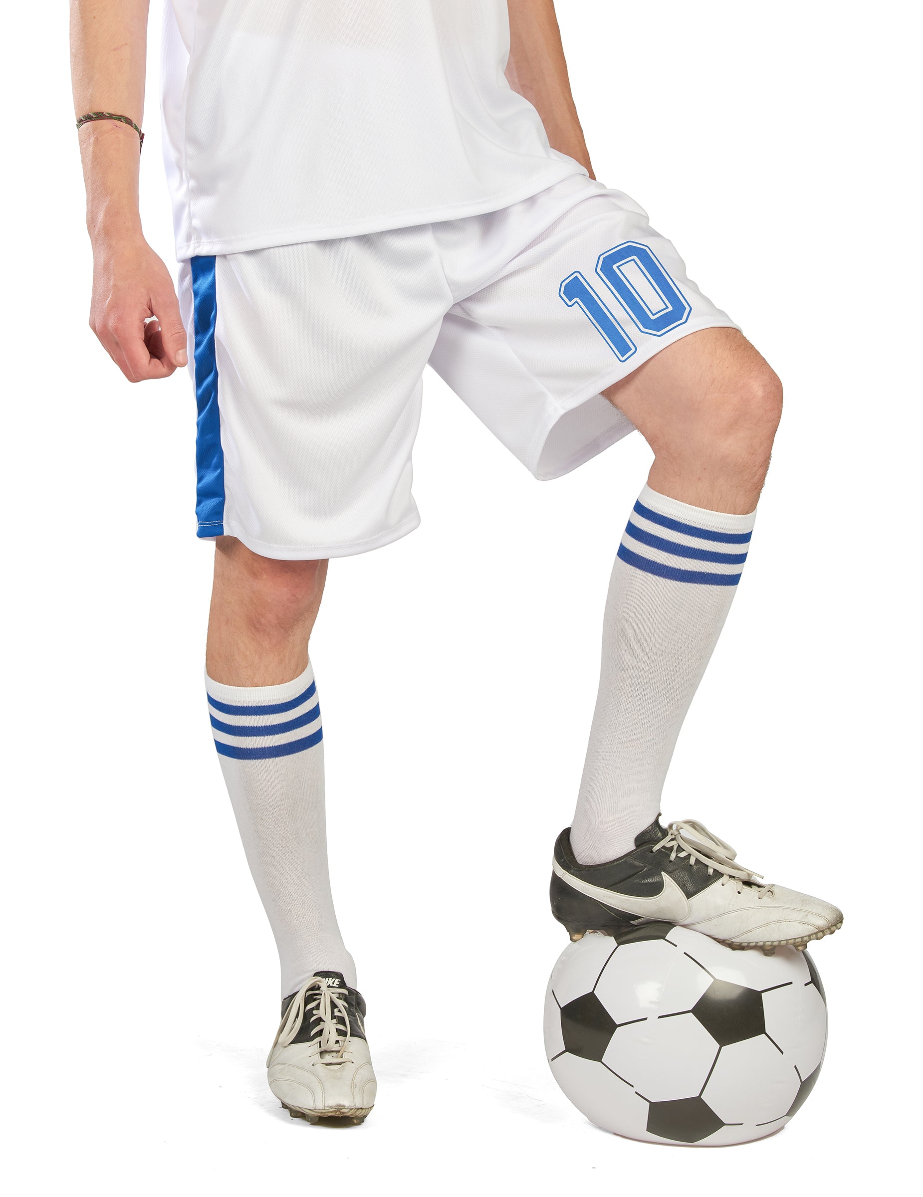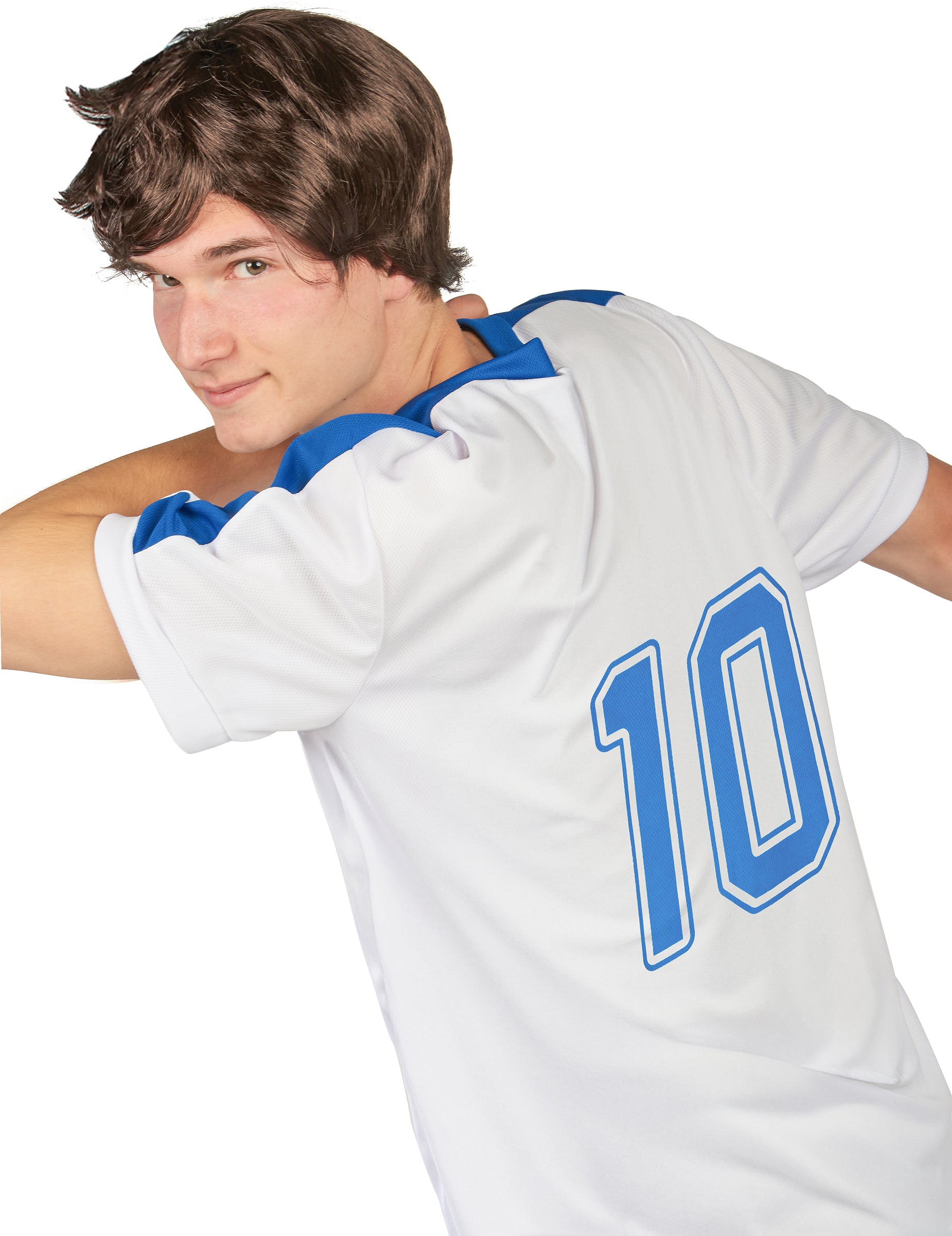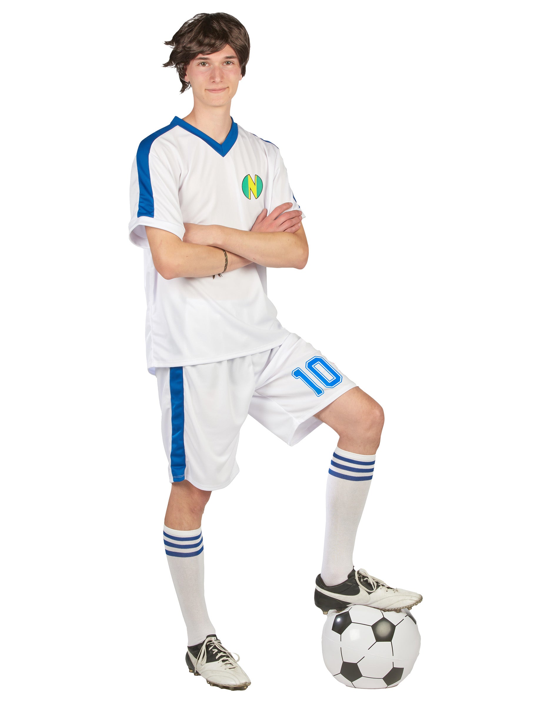 Ta preobleka kot nogometni kapetan za moške je kot nalašč za utelešenje legendarnega igralca na igrišču. Vključuje visoke, kratke hlače in par nogavic. Vrh je bel z V -Necken in modrimi trakovi na ramenih, ki dodajo dinamičen in športni pridih. Na prsni koš je pritrjena značilna značka, ki spominja na slog emblematičnih ekipnih oblek. Ujemajoče se kratke hlače, bele z modrimi detajli, na stegnu nosijo številko 10, kar simbolizira vlogo kapetana in igralca. Kostum tega nogometnega kapetana bo idealen za prikrit večer, športni dogodek ali vsako priložnost, ko želite pokazati svoje talente na igrišču!